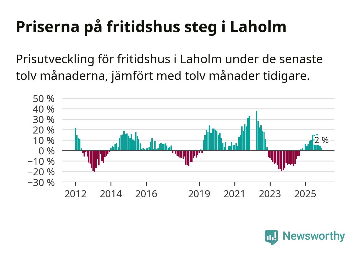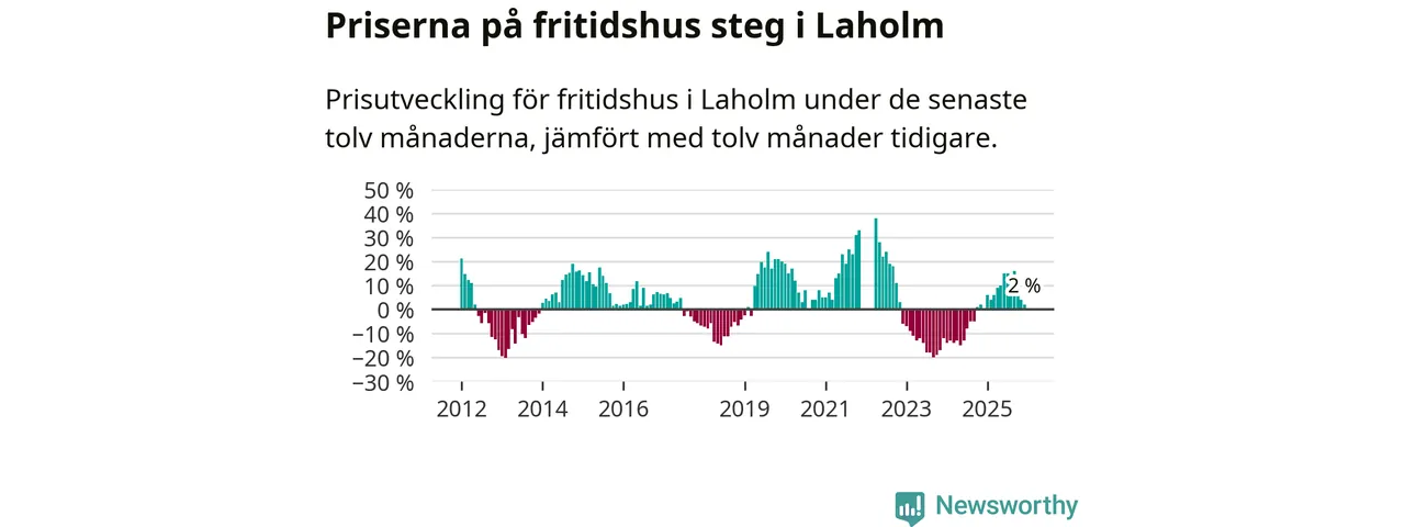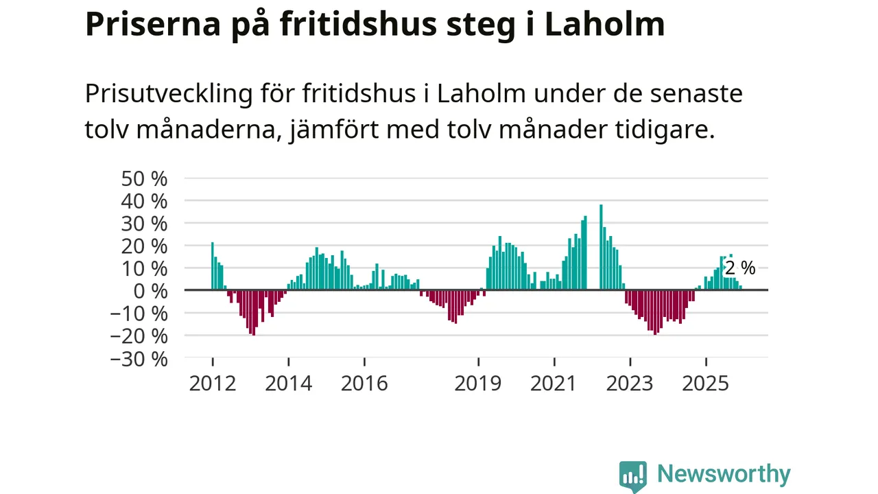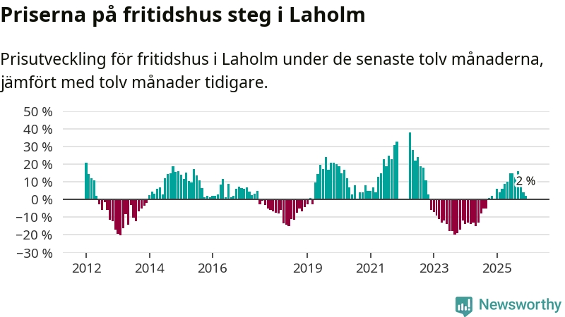 Priserna på fritidshus har gått upp i Laholms kommun. Medelpriset på försäljningarna under de senaste tolv månaderna visar på en uppgång med 2 procent.