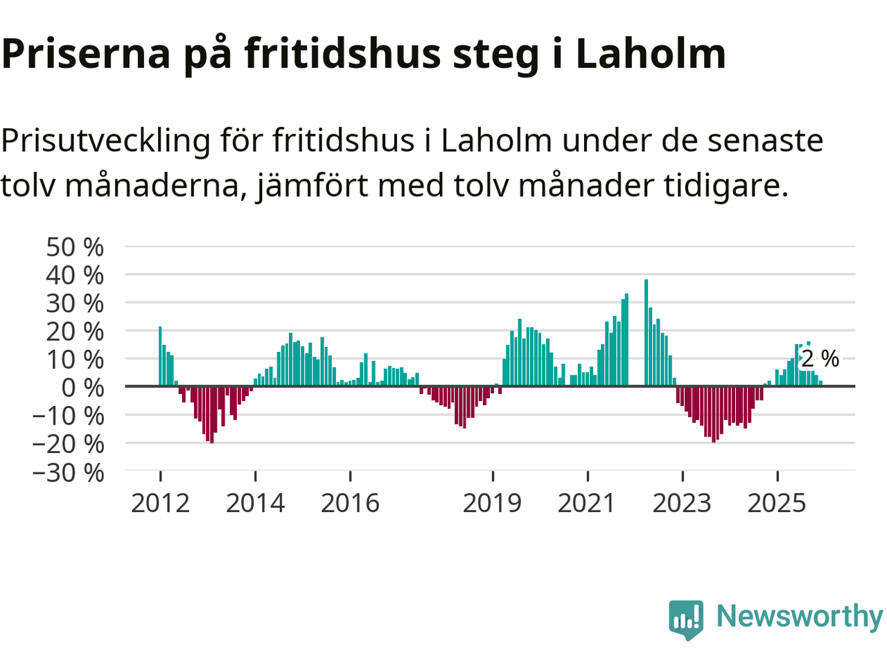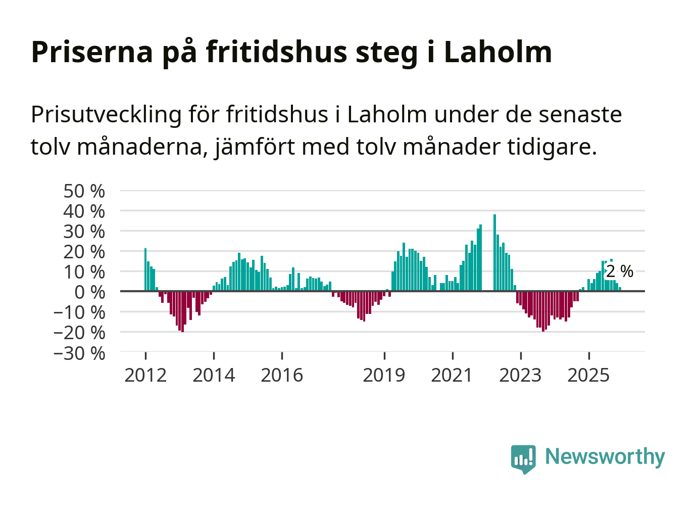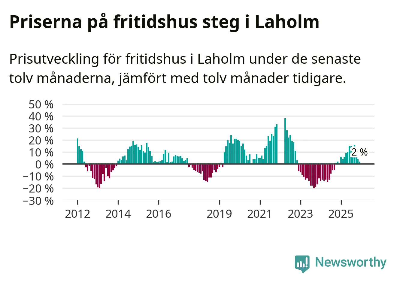Priserna på fritidshus har gått upp i Laholms kommun. Medelpriset på försäljningarna under de senaste tolv månaderna visar på en uppgång med 2 procent.