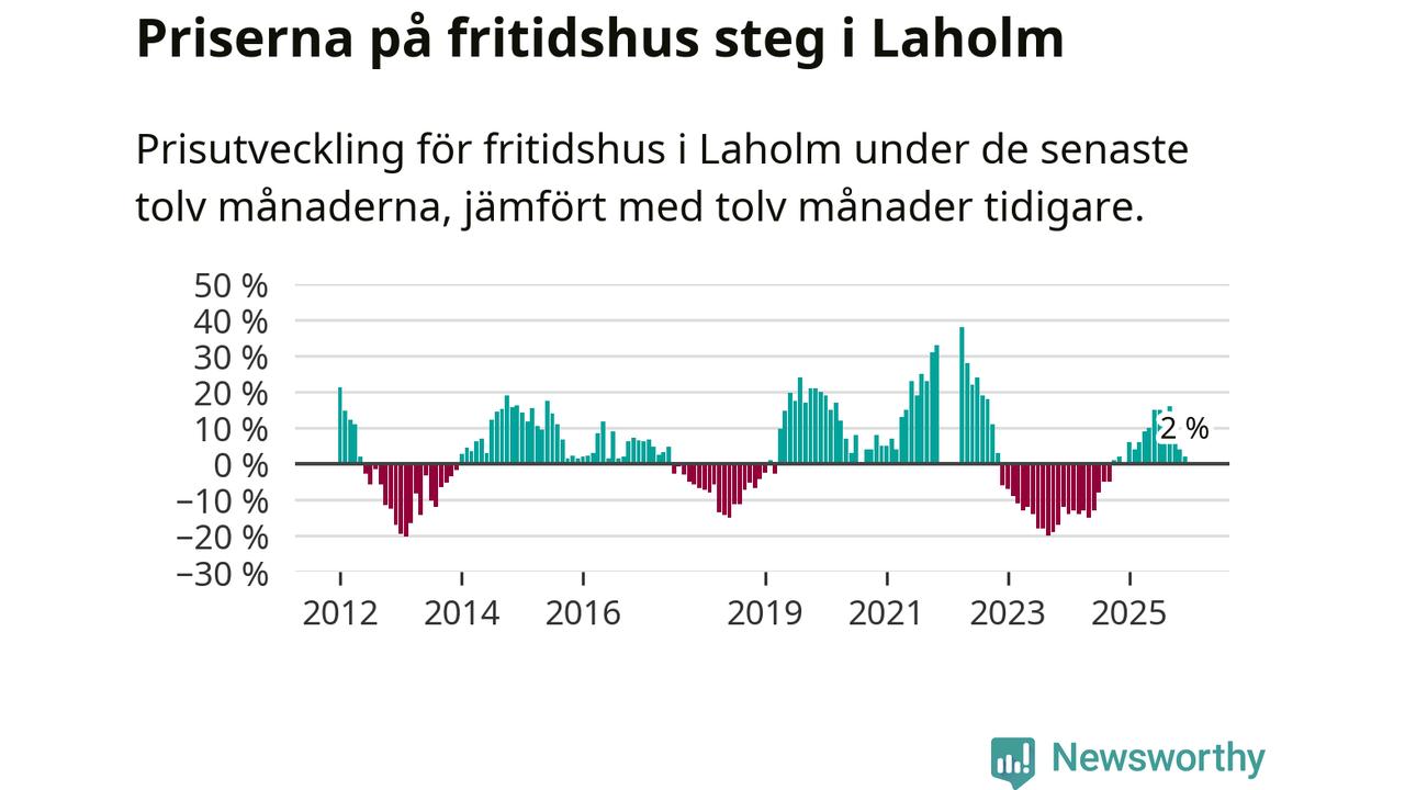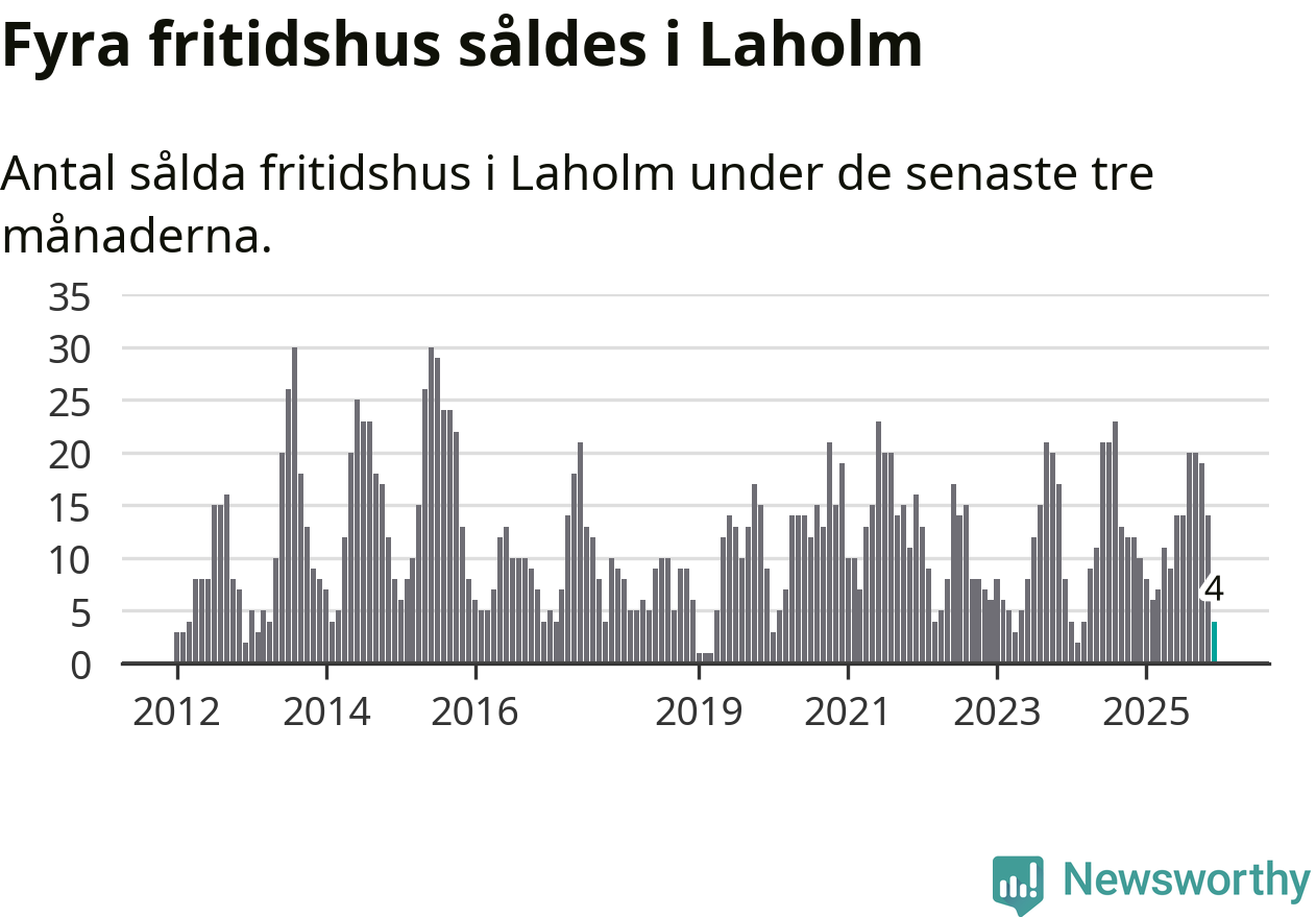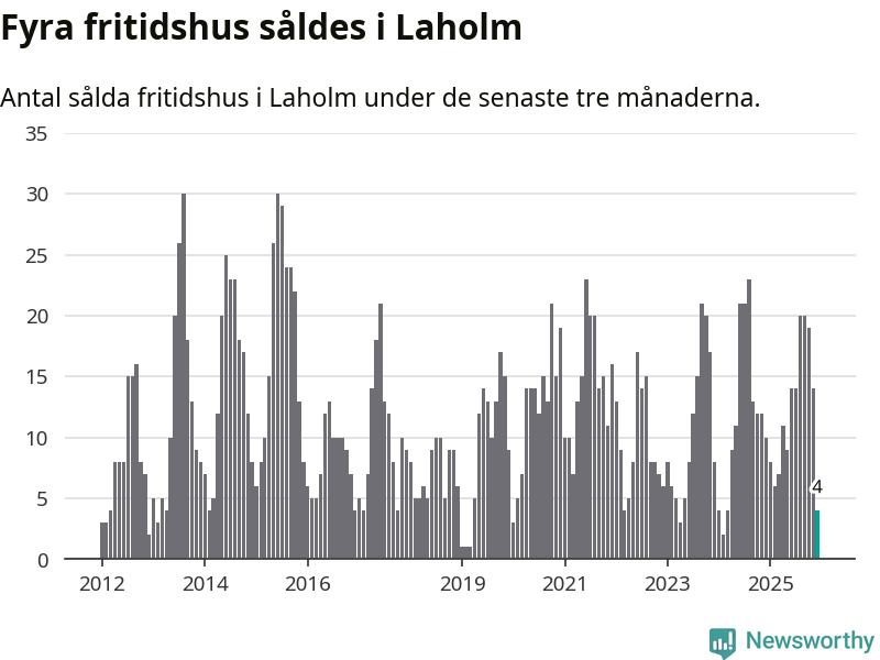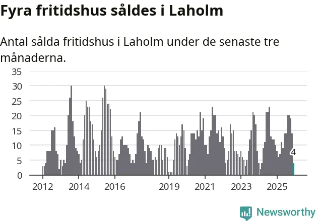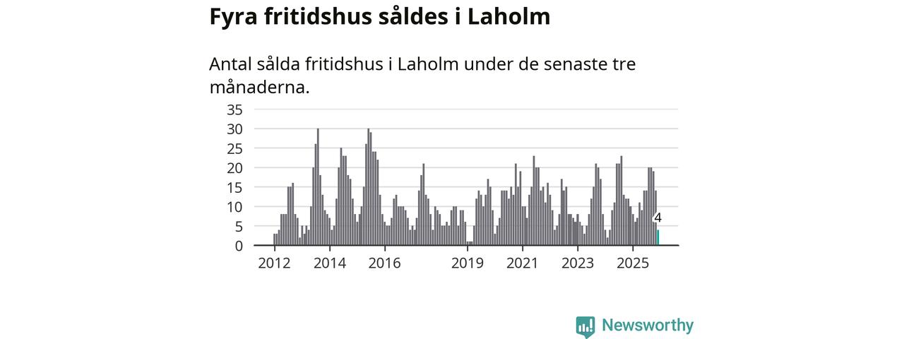 Sammanlagt såldes fyra fritidshus i Laholms kommun mellan oktober 2025 och december 2025 till ett genomsnittligt pris på 2,4 miljoner kronor. I fjol gjordes tio affärer vid den här tiden på året.