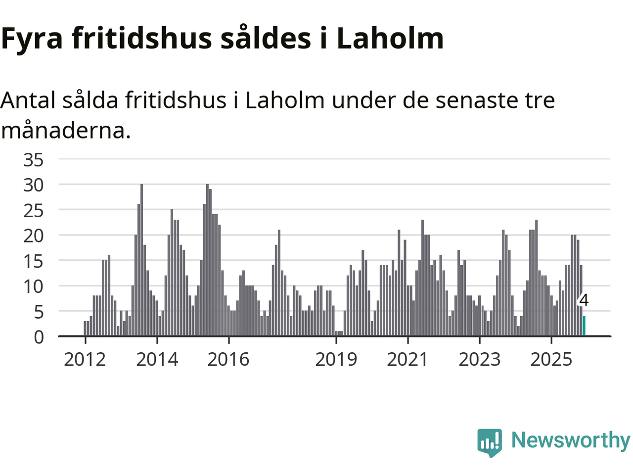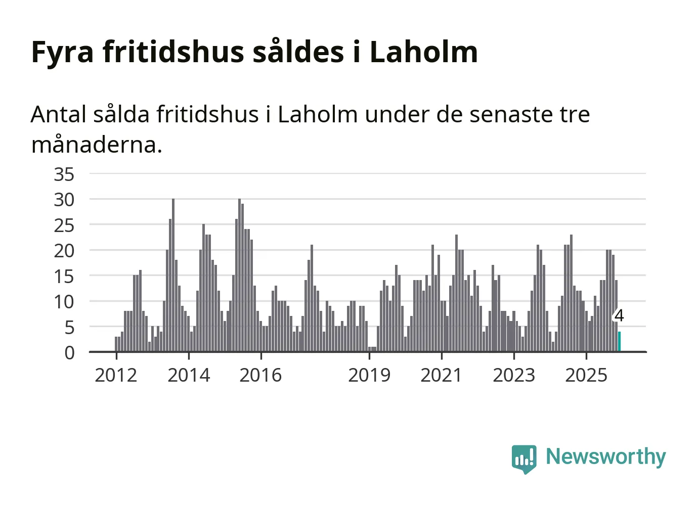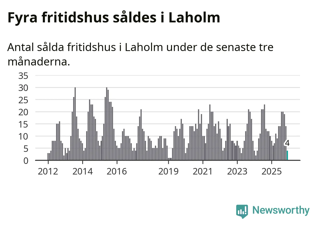 Sammanlagt såldes fyra fritidshus i Laholms kommun mellan oktober 2025 och december 2025 till ett genomsnittligt pris på 2,4 miljoner kronor. I fjol gjordes tio affärer vid den här tiden på året.