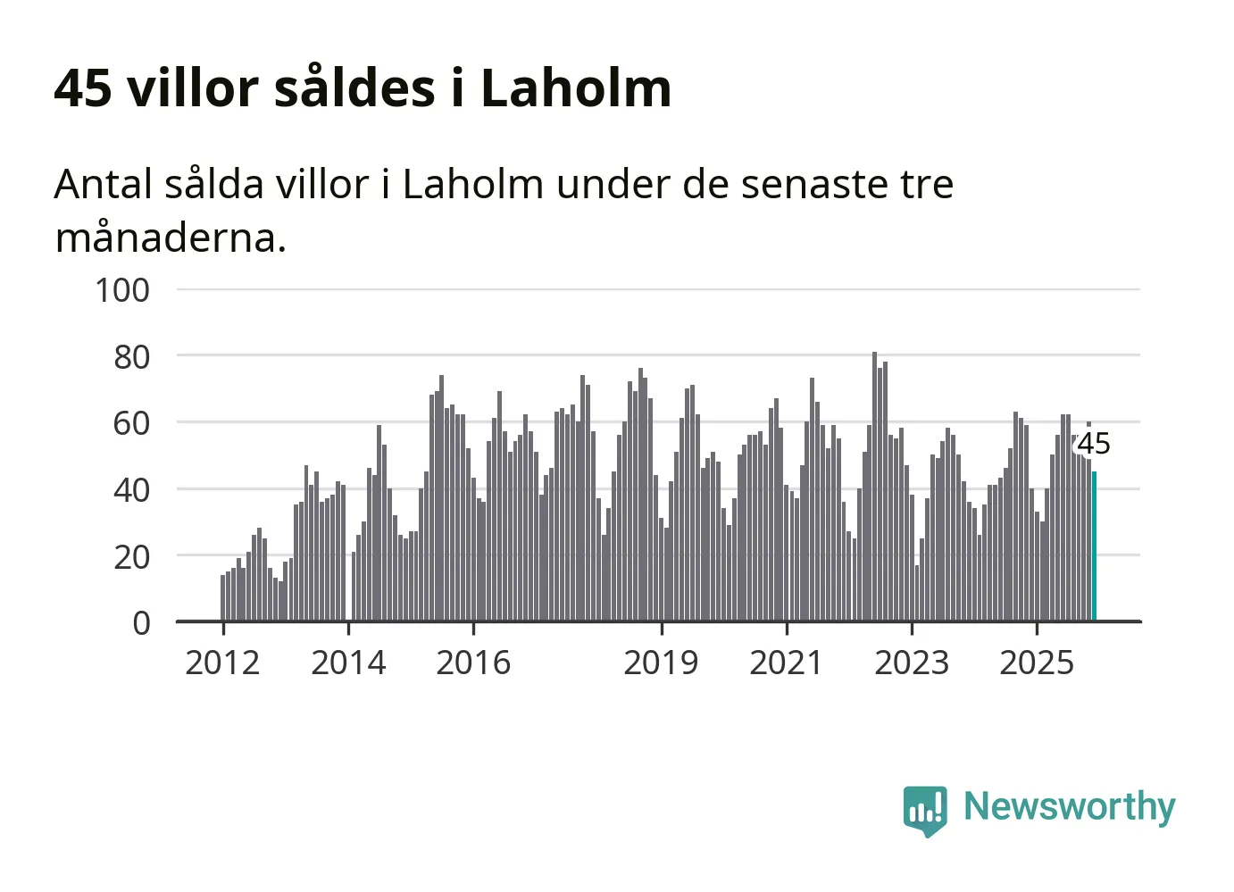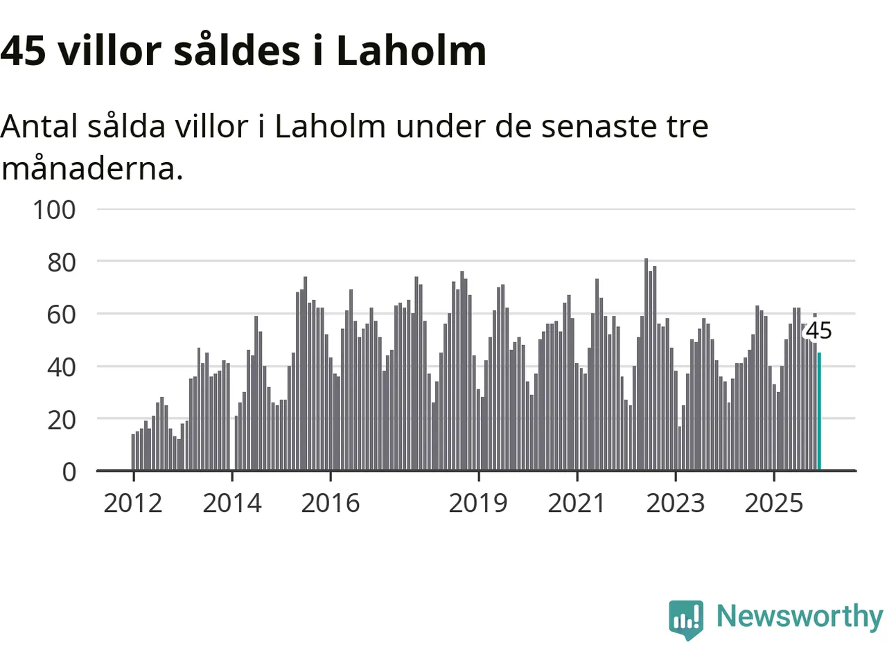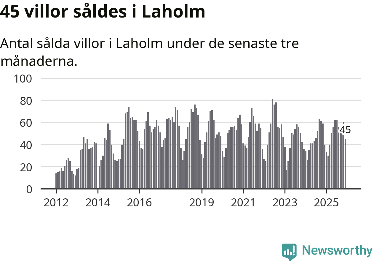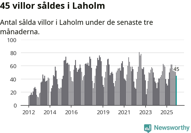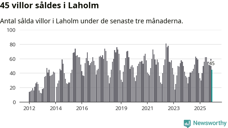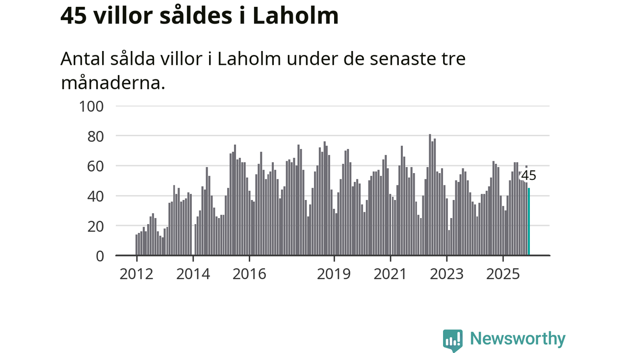 Sammanlagt såldes 45 villor i Laholms kommun mellan oktober och december till ett genomsnittligt pris på 3,0 miljoner kronor. I fjol gjordes 40 affärer vid den här tiden på året.