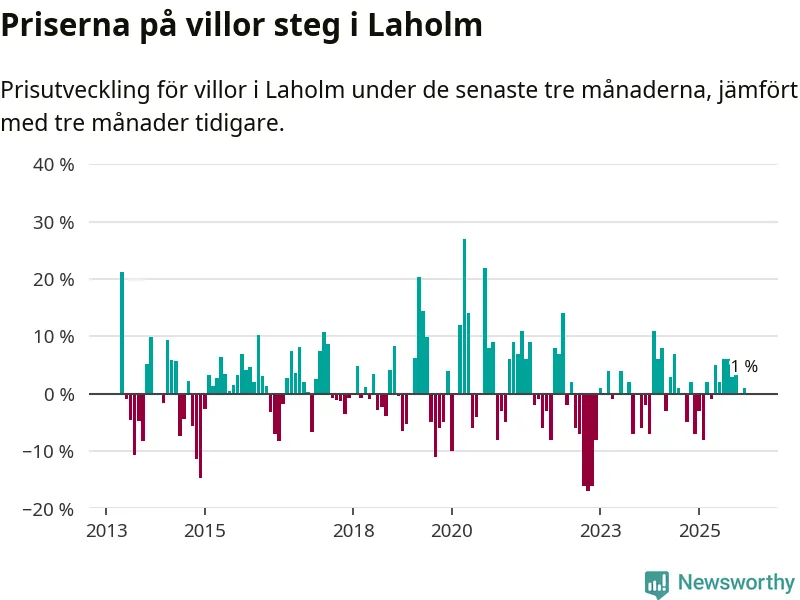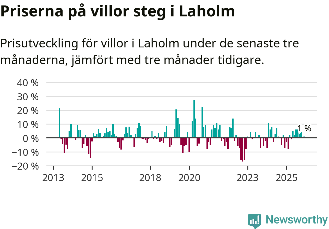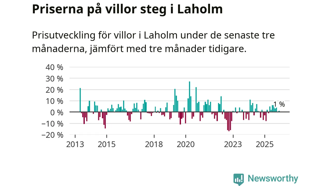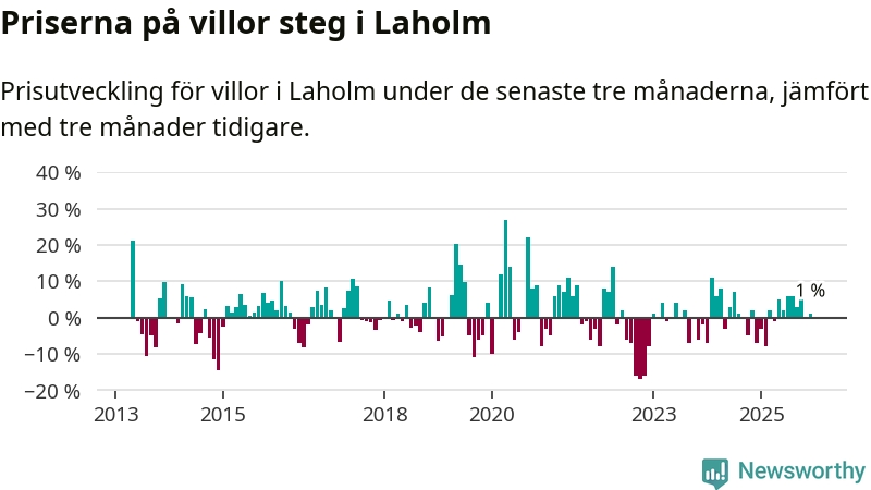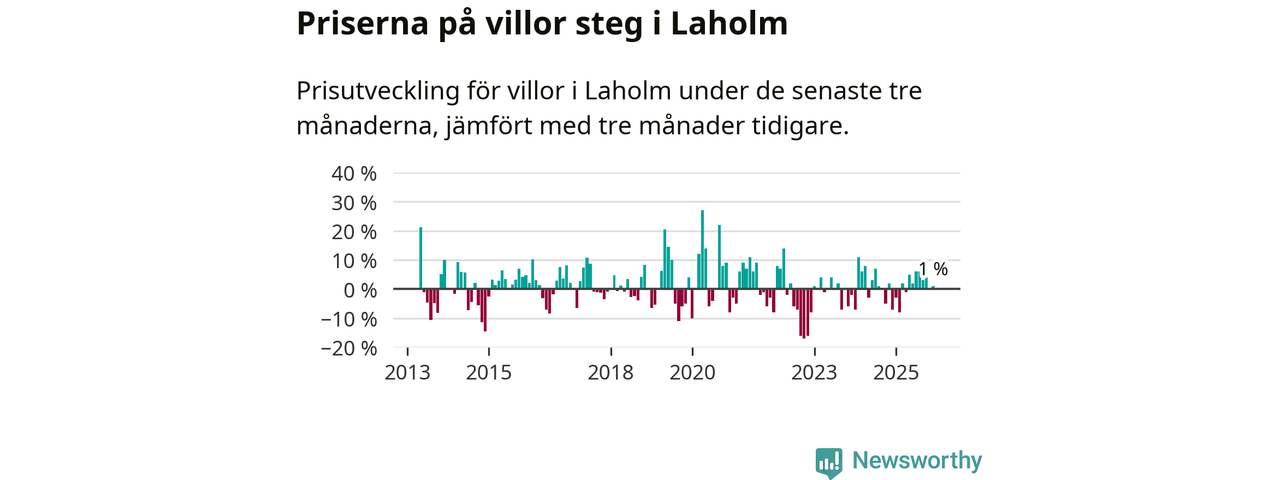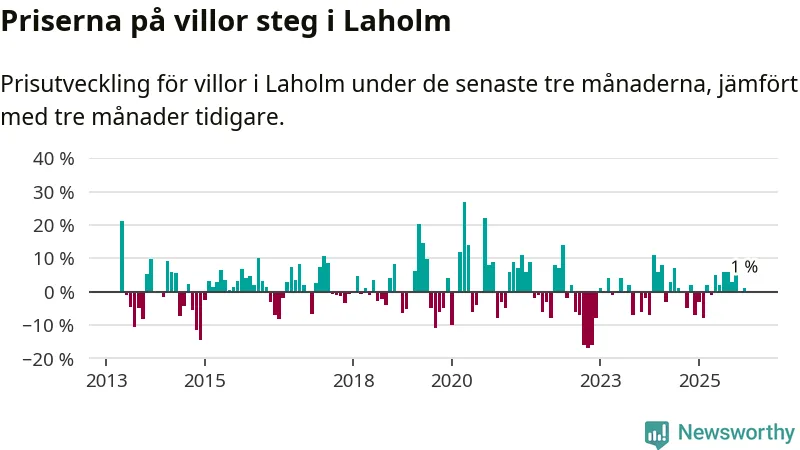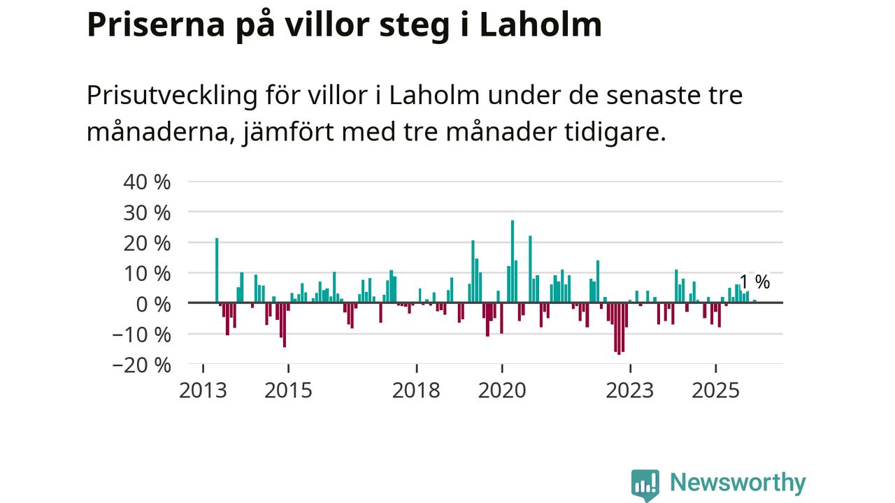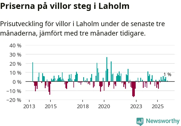 Villapriserna har gått upp i Laholms kommun. Medelpriset på försäljningarna under de senaste tre månaderna visar på en uppgång med 1 procent.