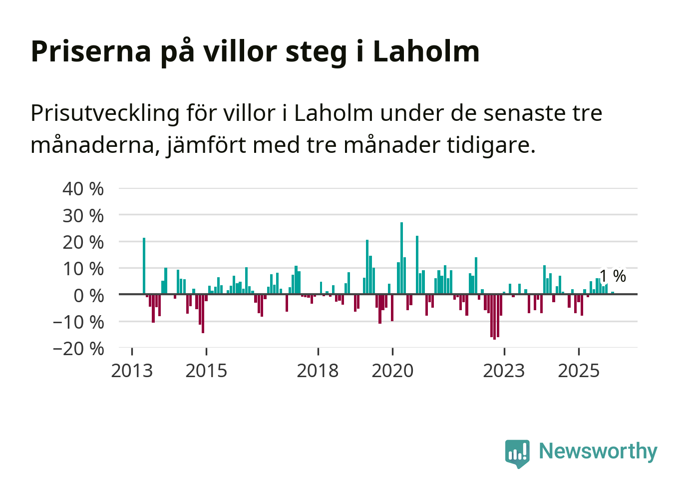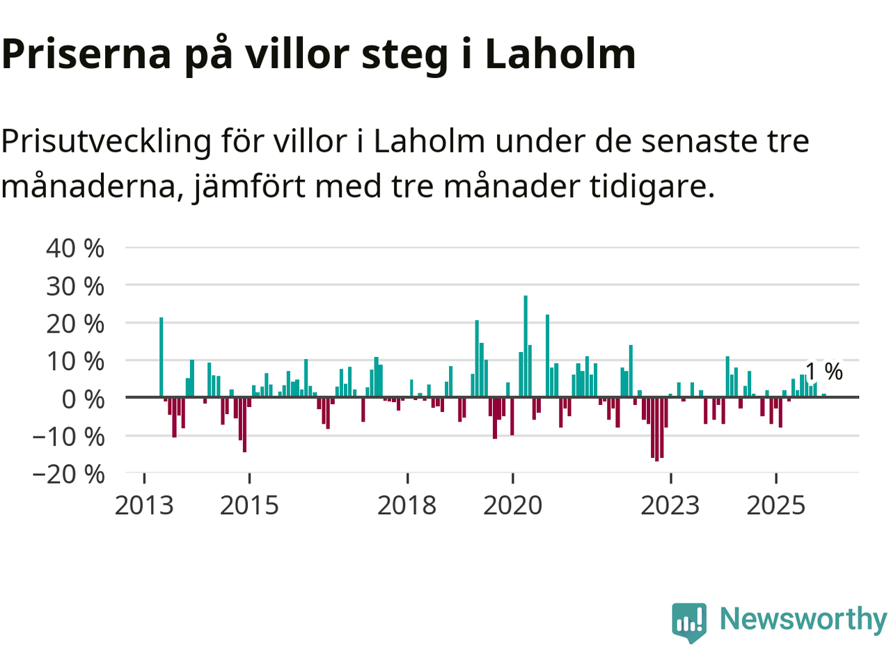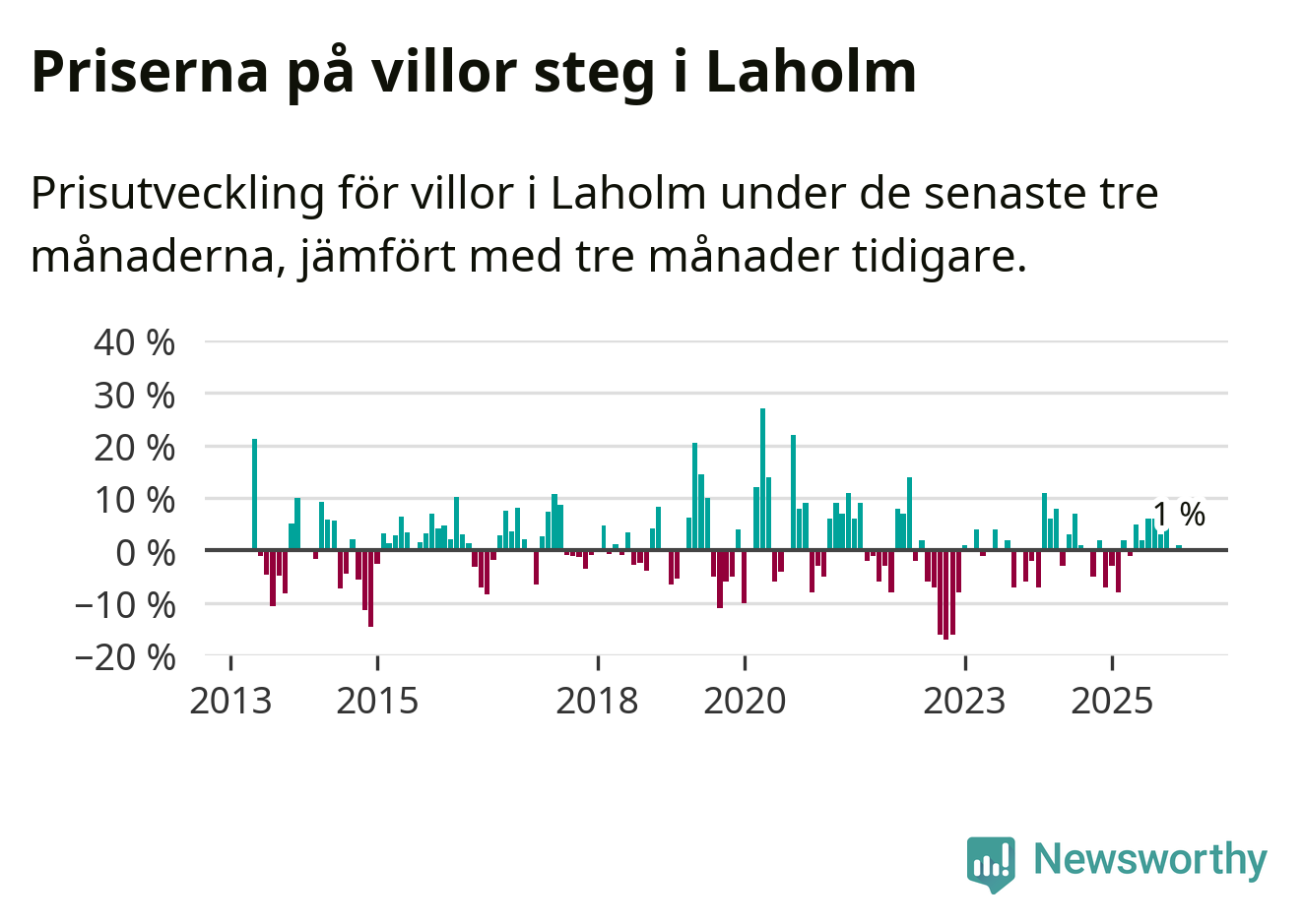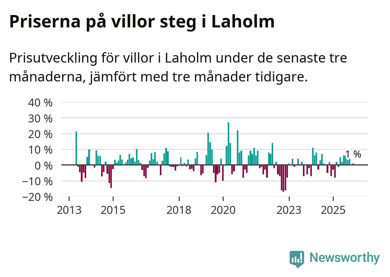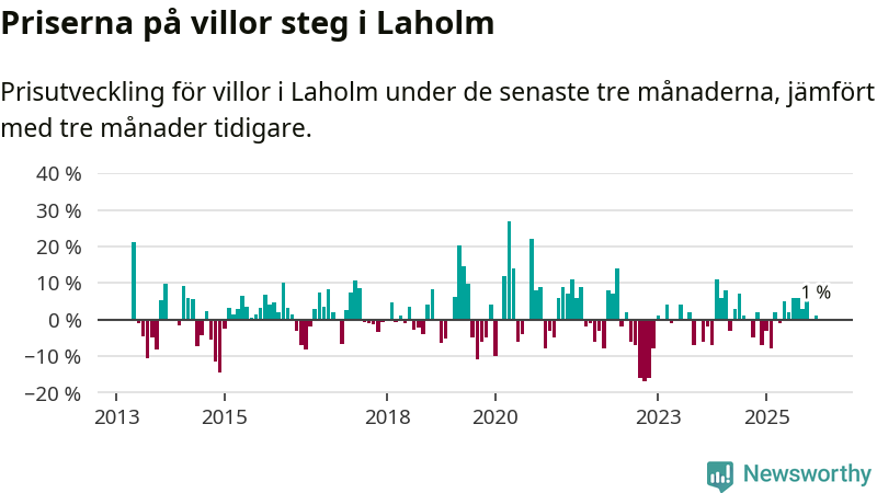 Villapriserna har gått upp i Laholms kommun. Medelpriset på försäljningarna under de senaste tre månaderna visar på en uppgång med 1 procent.