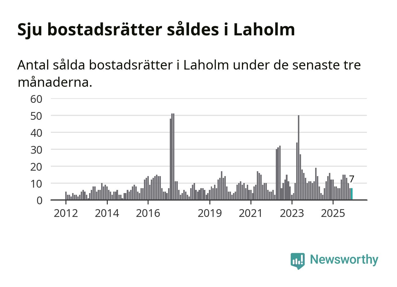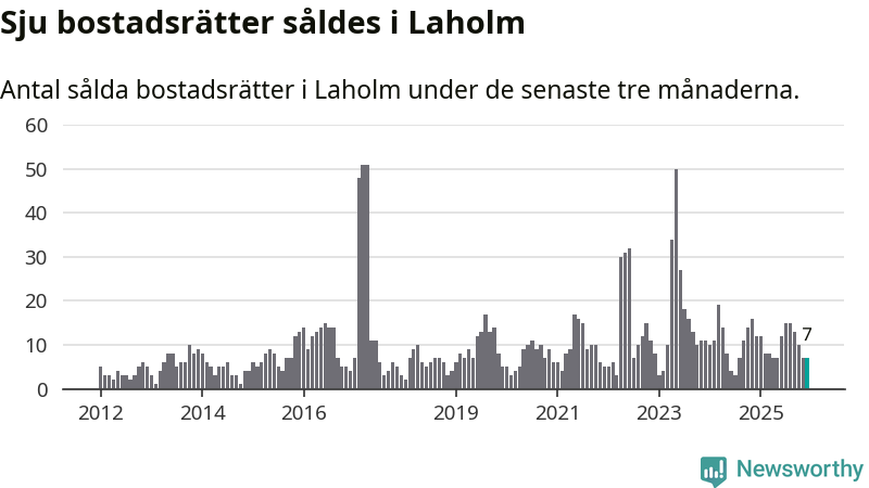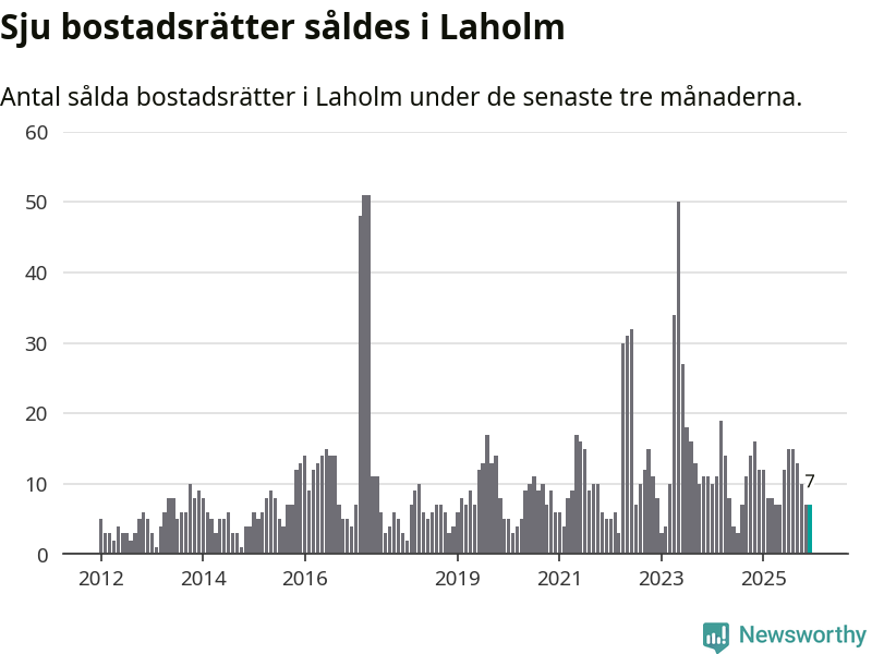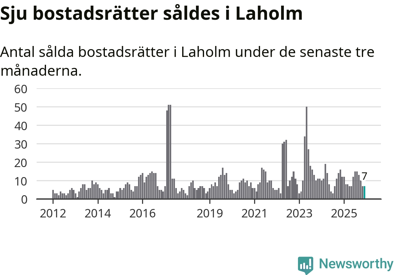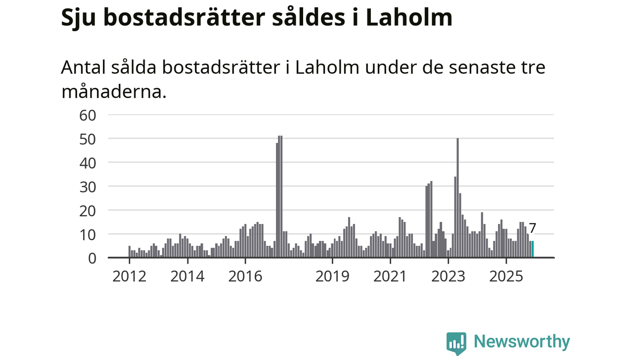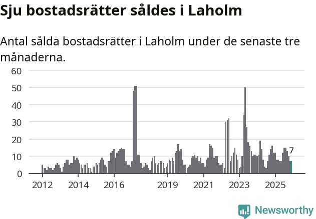 Mellan oktober och december gjordes sammanlagt sju affärer med bostadsrätter i Laholms kommun. Det kan jämföras med tolv vid motsvarande tid i fjol.