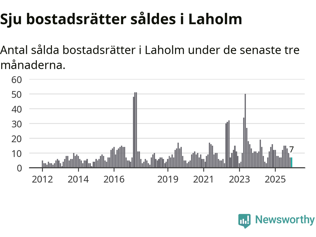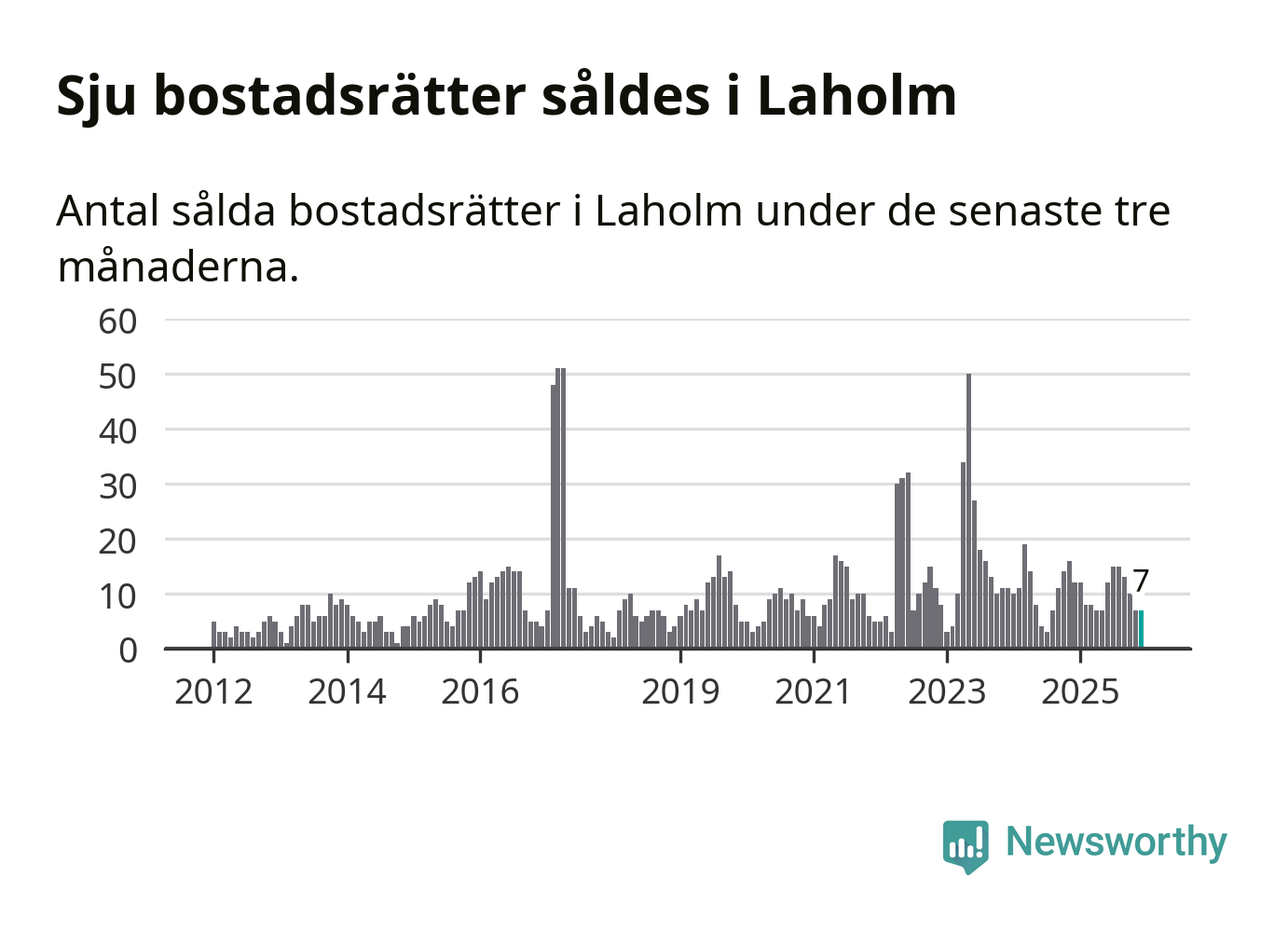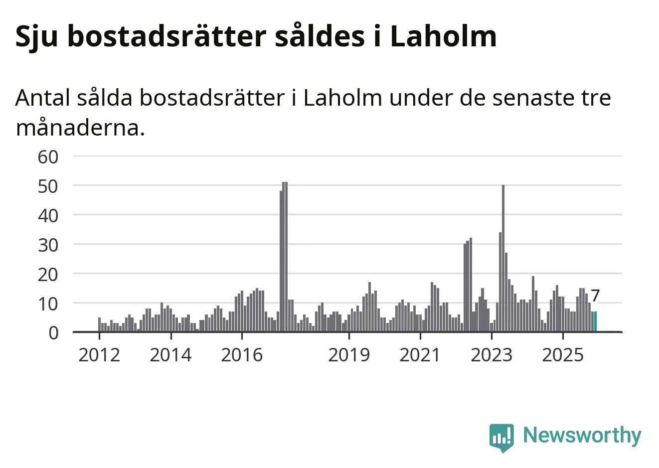 Mellan oktober och december gjordes sammanlagt sju affärer med bostadsrätter i Laholms kommun. Det kan jämföras med tolv vid motsvarande tid i fjol.