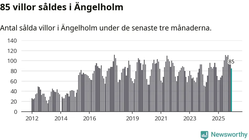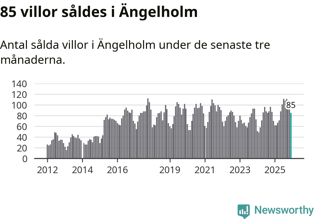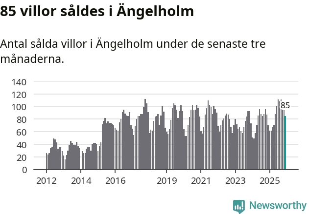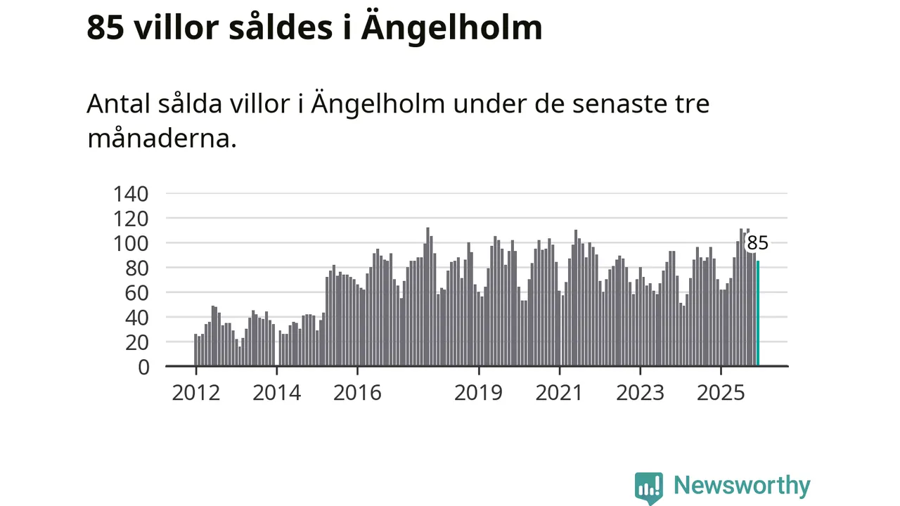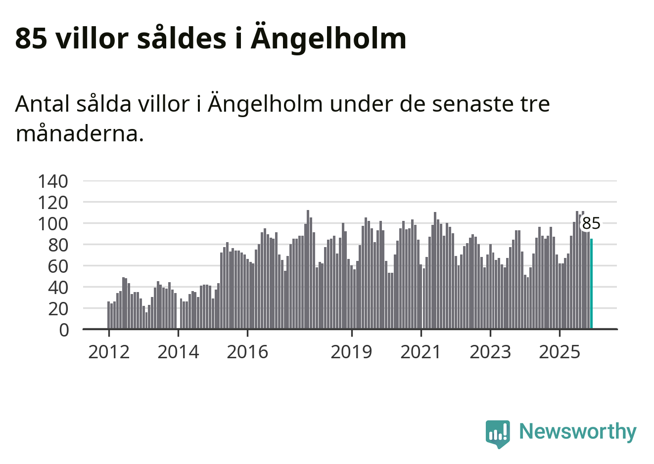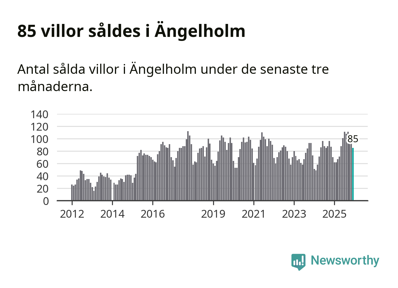Sammanlagt såldes 85 villor i Ängelholms kommun mellan oktober och december till ett genomsnittligt pris på 3,8 miljoner kronor. I fjol gjordes 70 affärer vid den här tiden på året.
