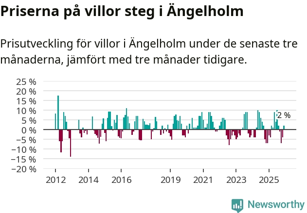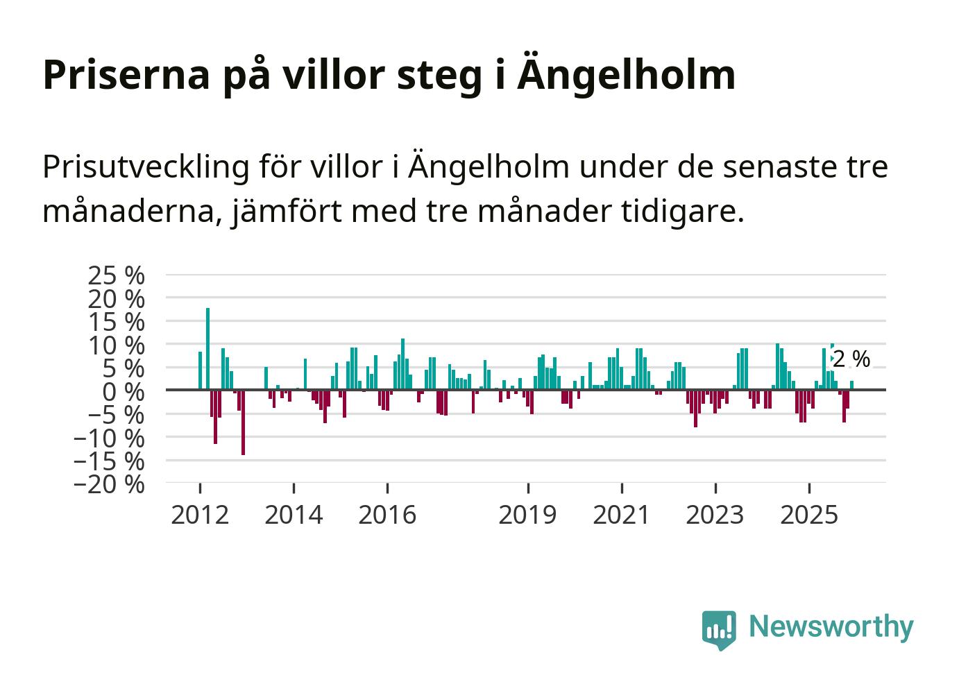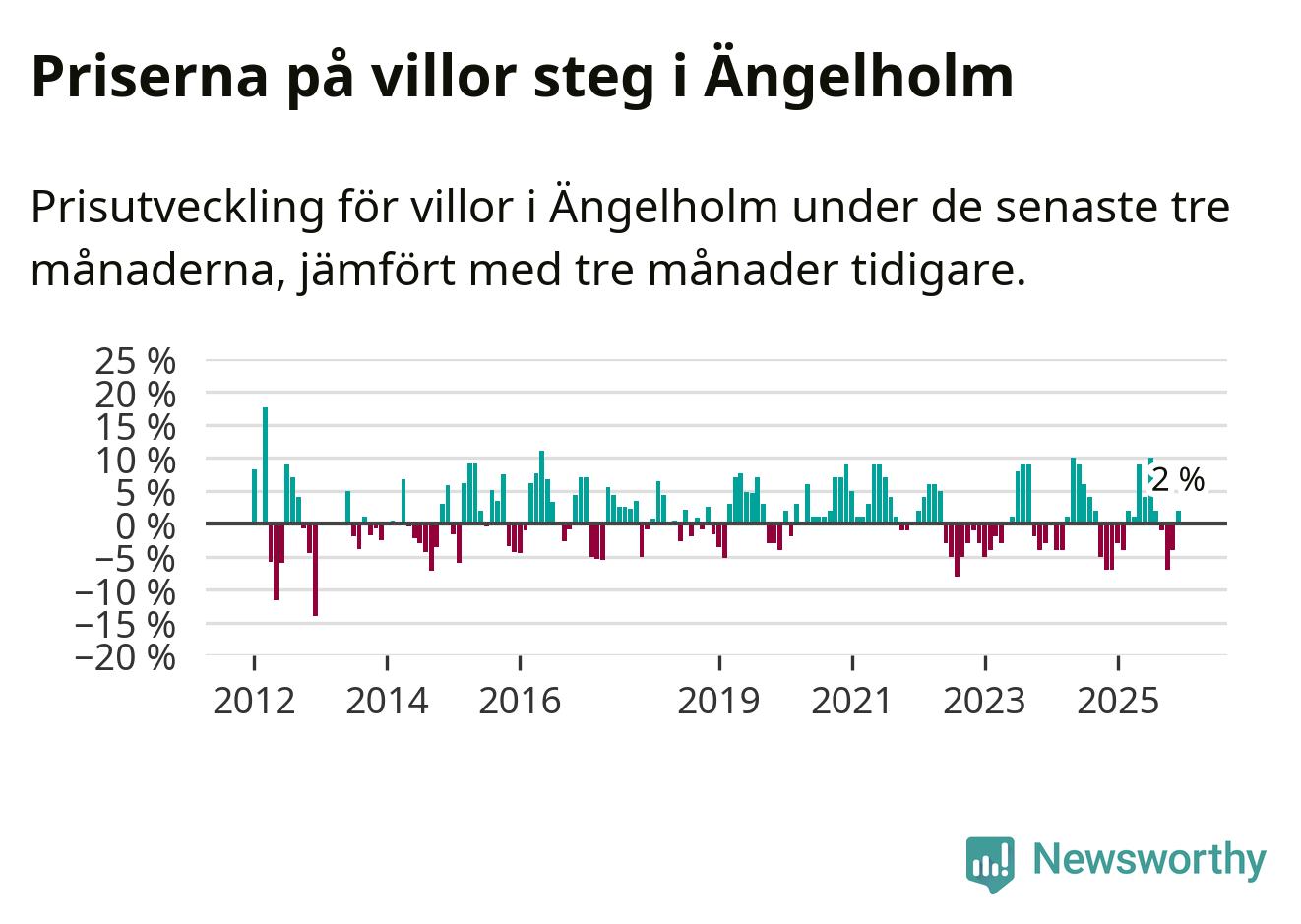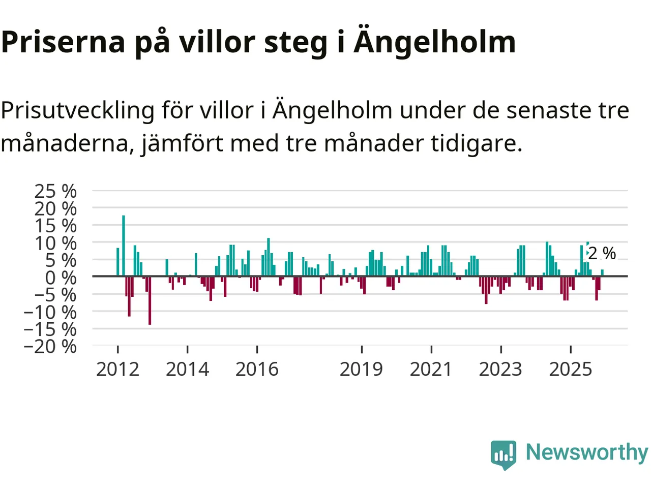 Villapriserna har gått upp i Ängelholms kommun. Medelpriset på försäljningarna under de senaste tre månaderna visar på en uppgång med 2 procent.
