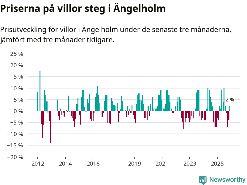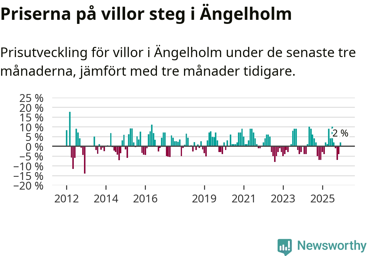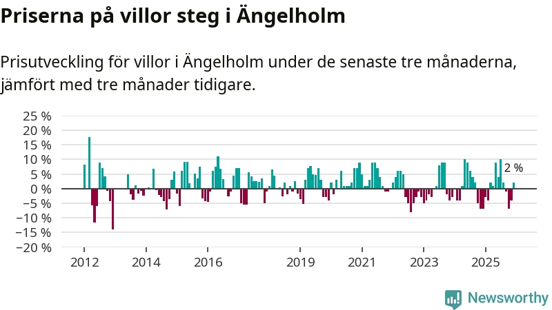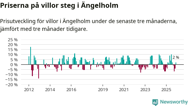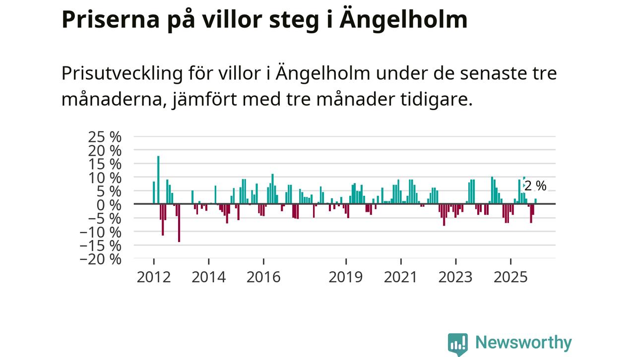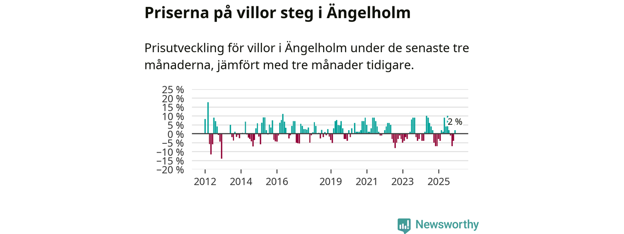 Villapriserna har gått upp i Ängelholms kommun. Medelpriset på försäljningarna under de senaste tre månaderna visar på en uppgång med 2 procent.