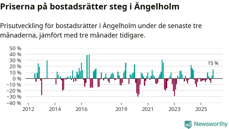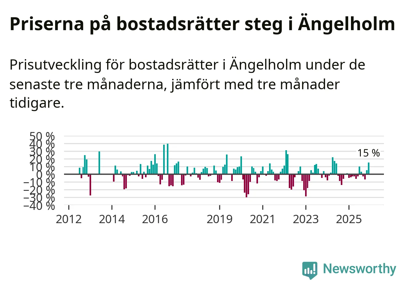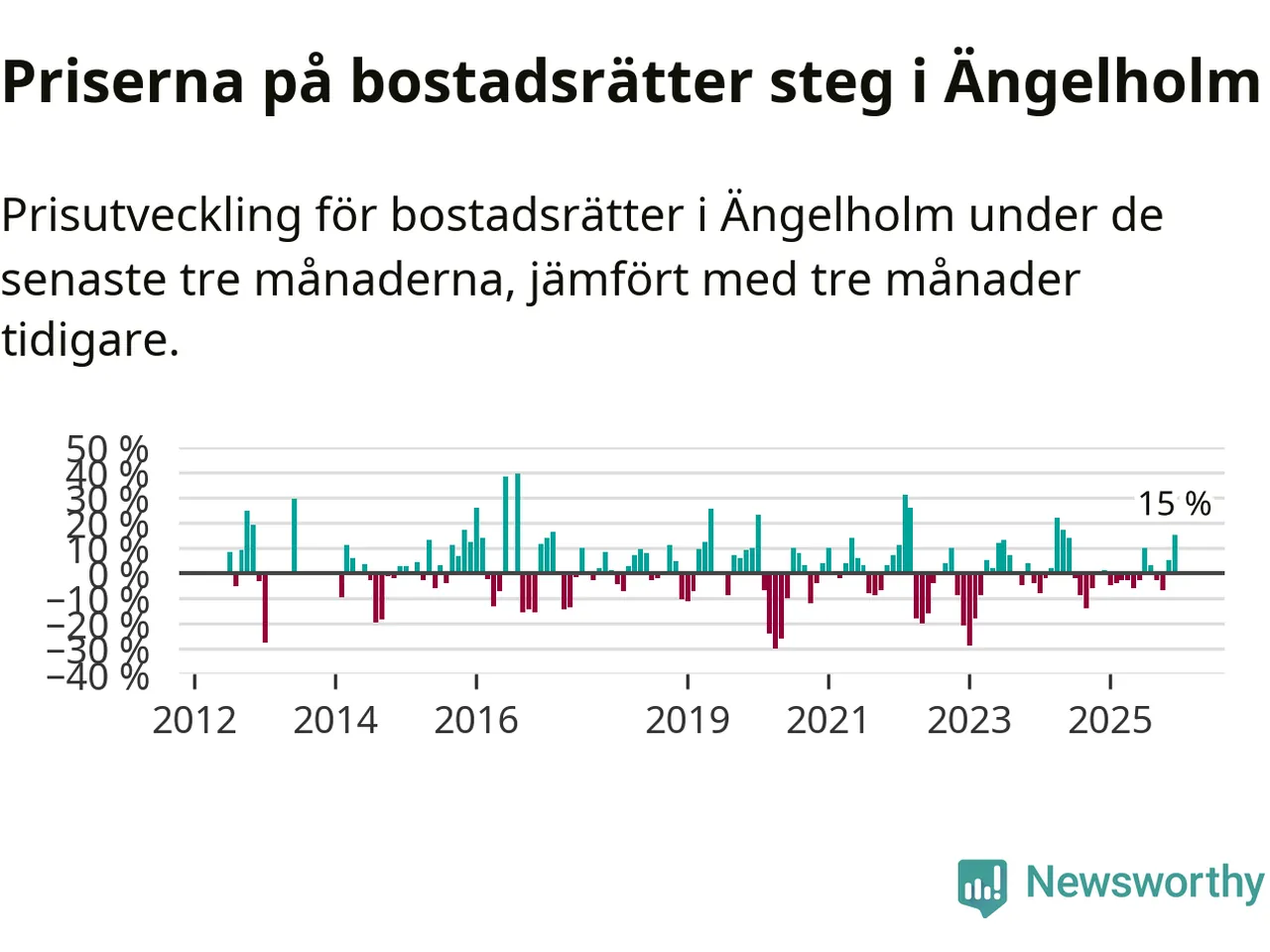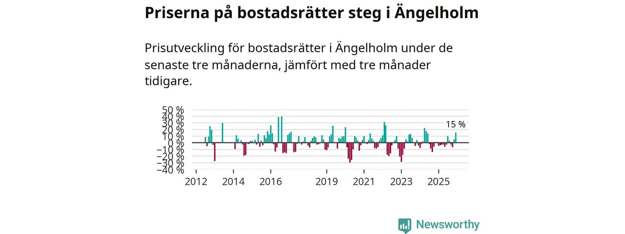 Priserna på bostadsrätter har gått upp i Ängelholms kommun. Medelpriset på försäljningarna under de senaste tre månaderna visar på en uppgång med 15 procent.