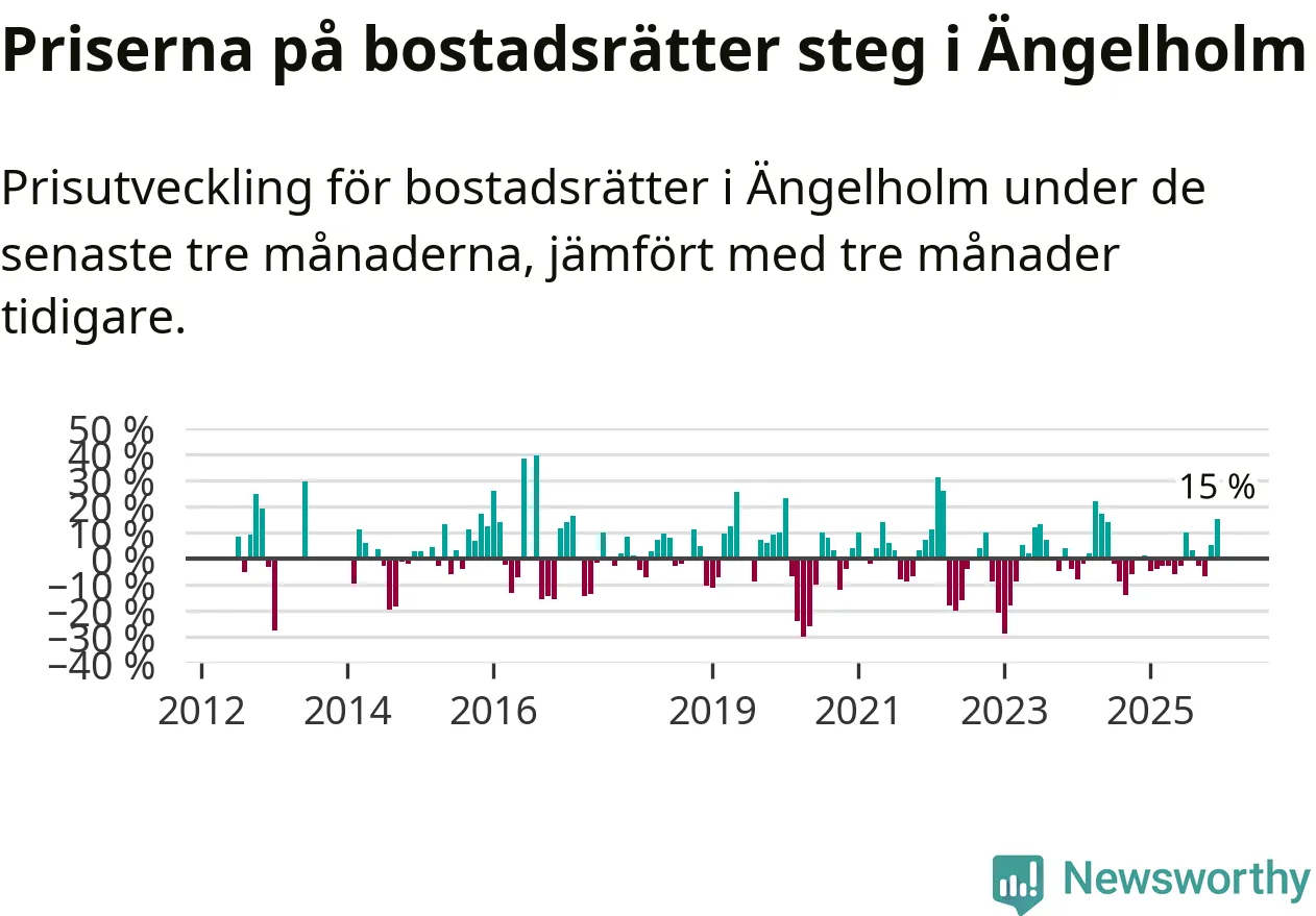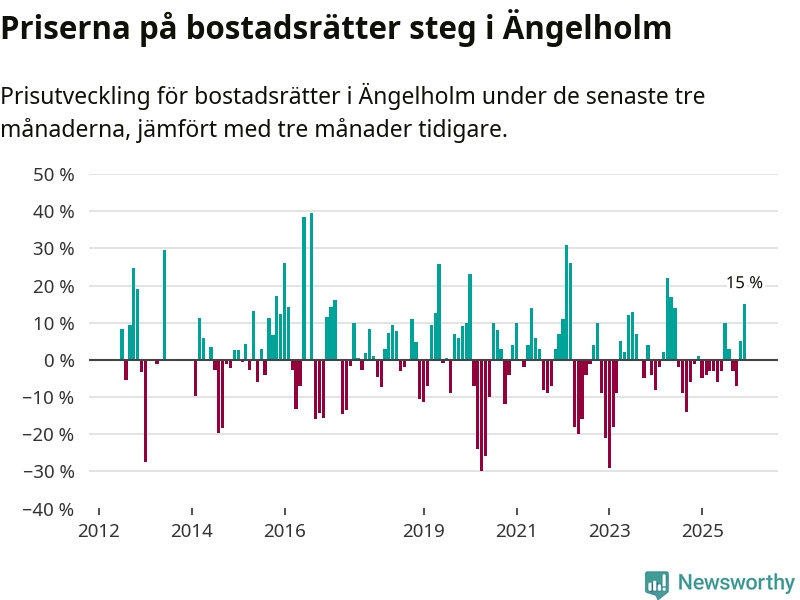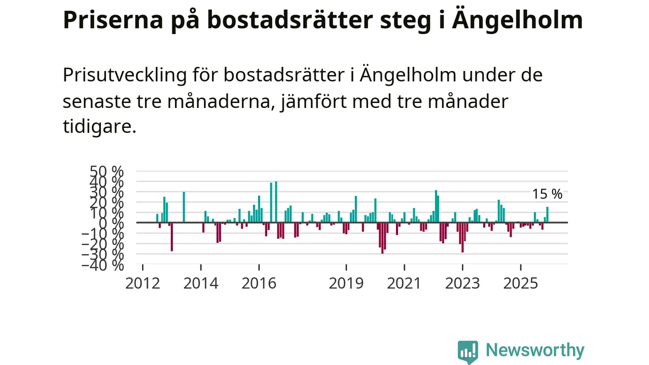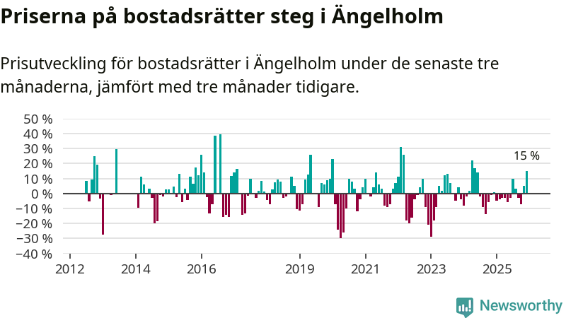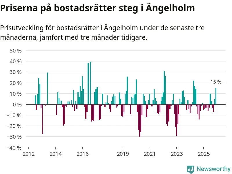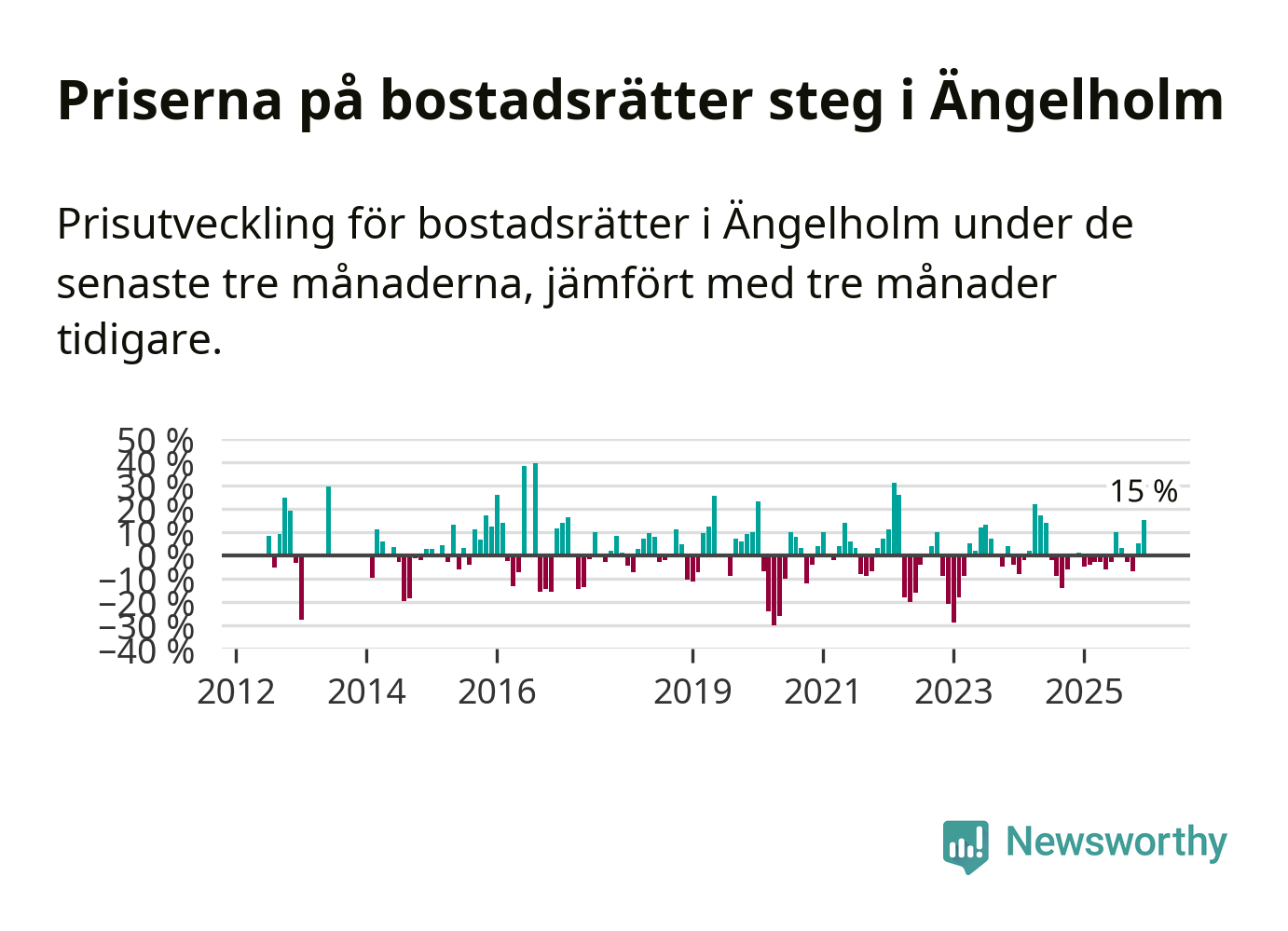 Priserna på bostadsrätter har gått upp i Ängelholms kommun. Medelpriset på försäljningarna under de senaste tre månaderna visar på en uppgång med 15 procent.