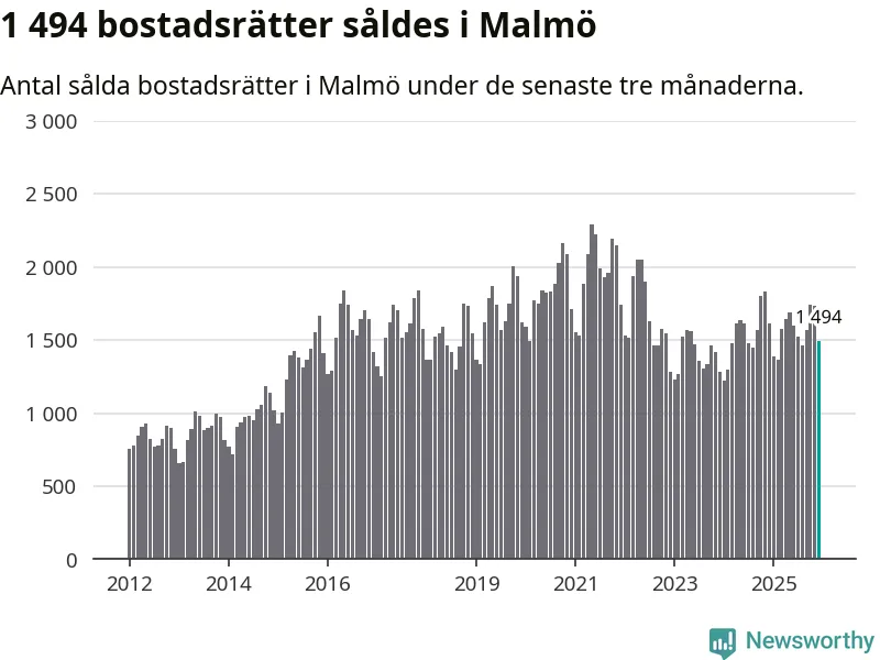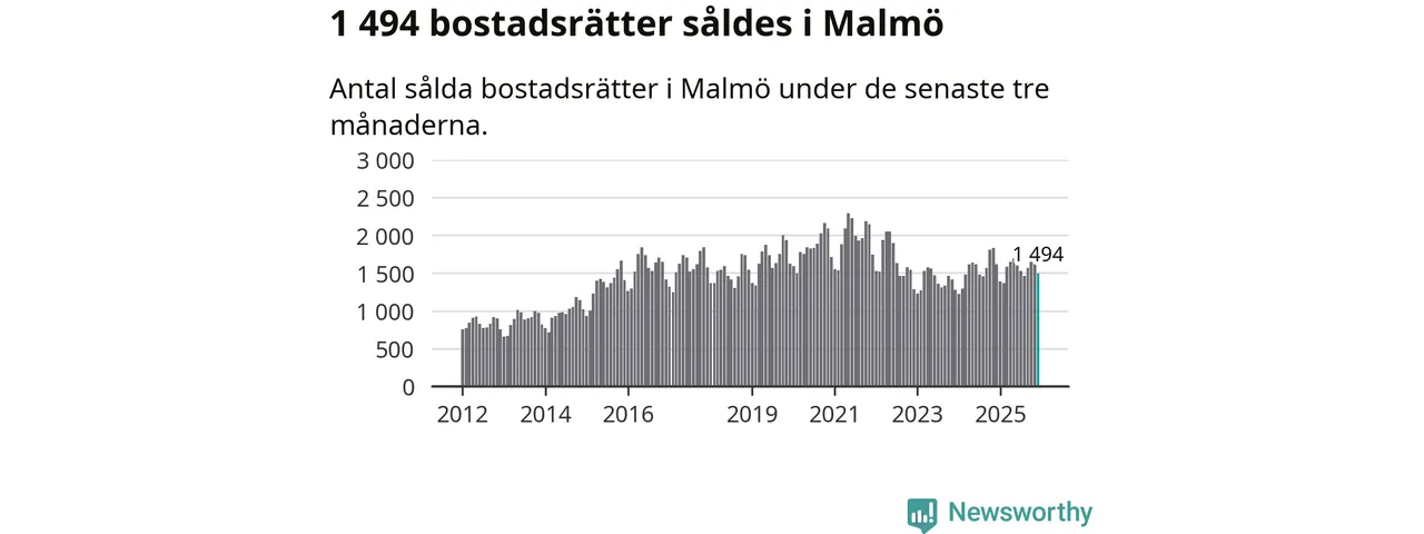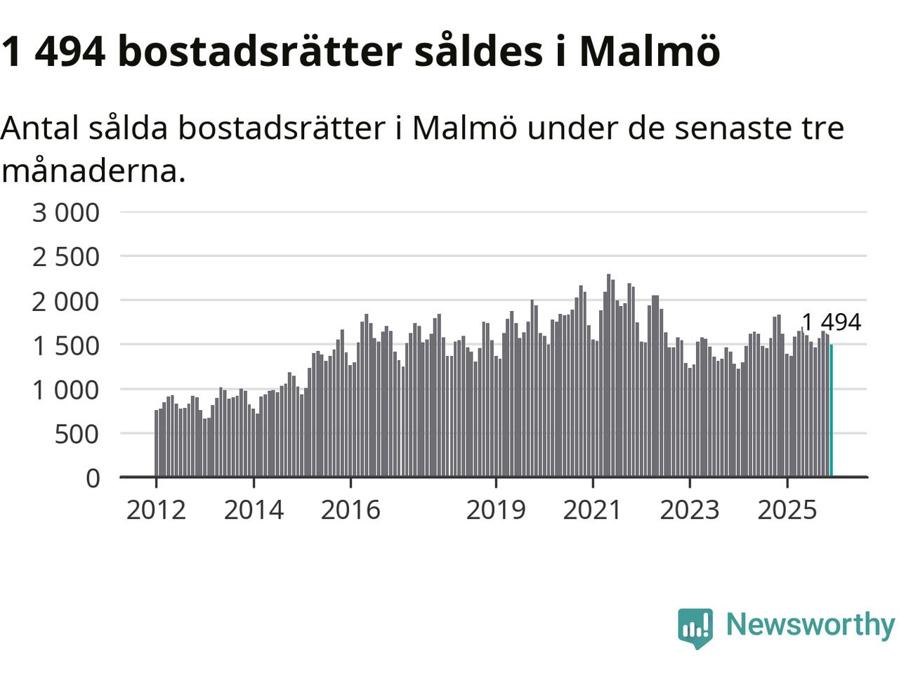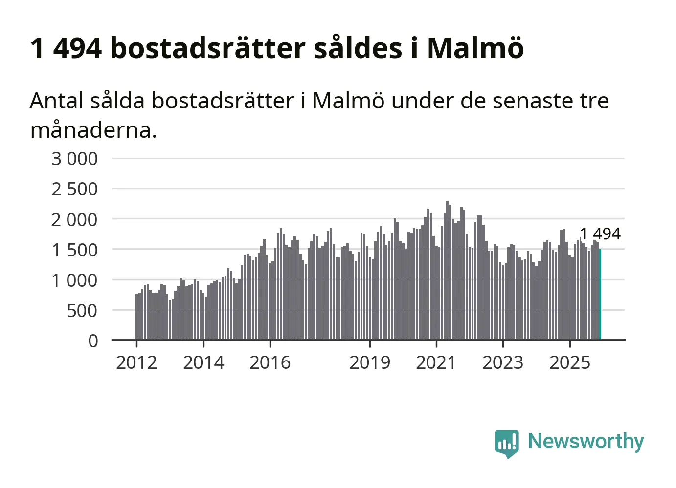 Sammanlagt såldes 1 494 bostadsrätter i Malmö kommun mellan oktober och december till ett genomsnittligt pris på 2,5 miljoner kronor. I fjol gjordes 1 613 affärer vid den här tiden på året.