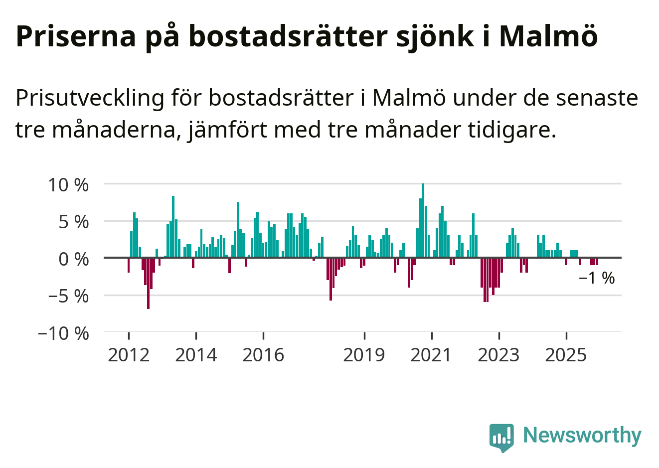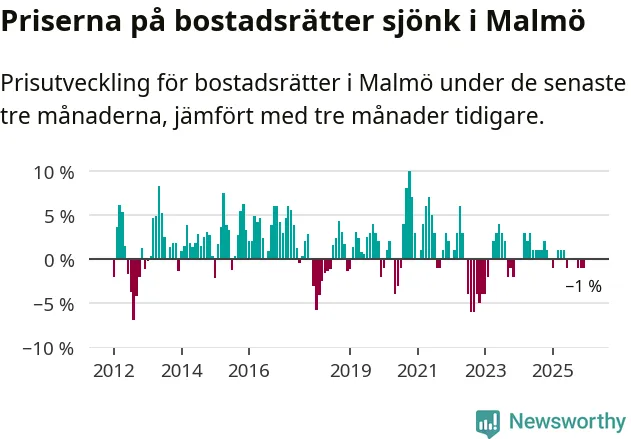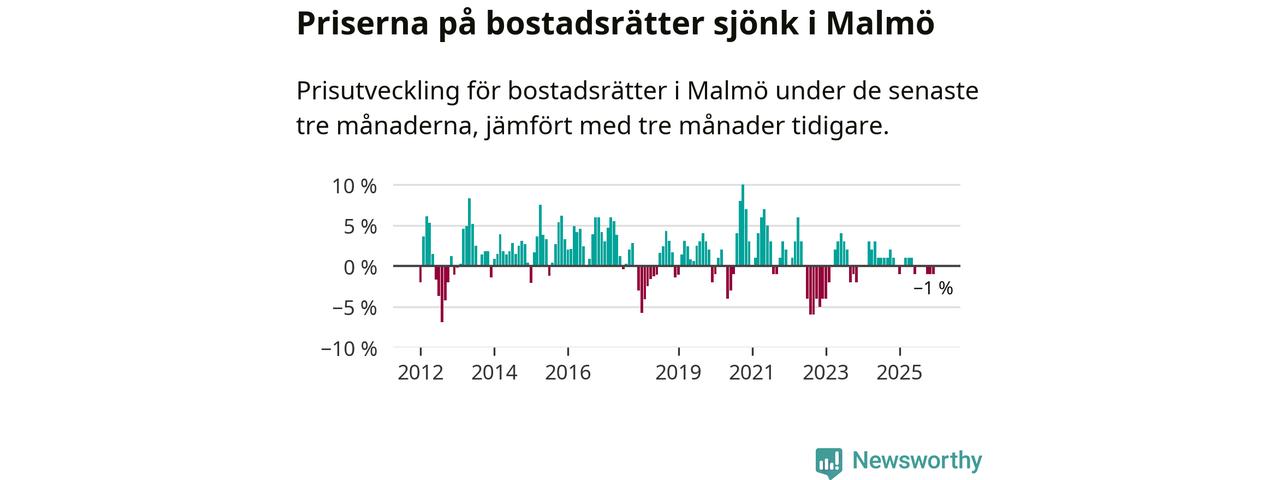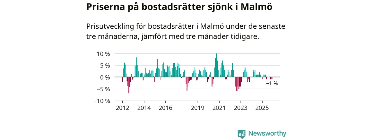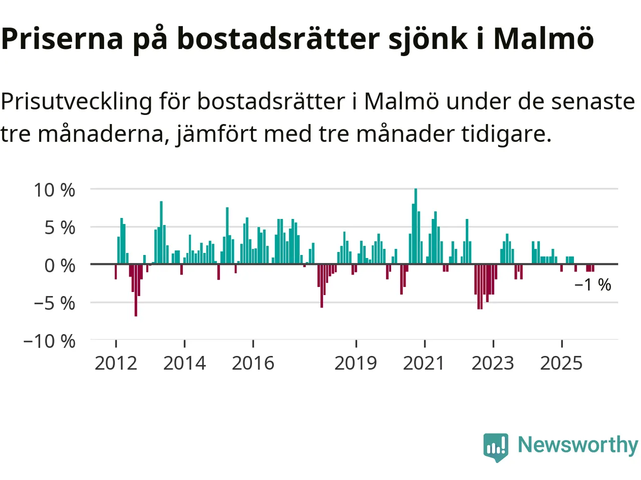 Priserna på bostadsrätter har gått ner i Malmö kommun. Medelpriset på försäljningarna under de senaste tre månaderna visar på en nedgång med 1 procent.