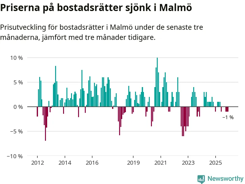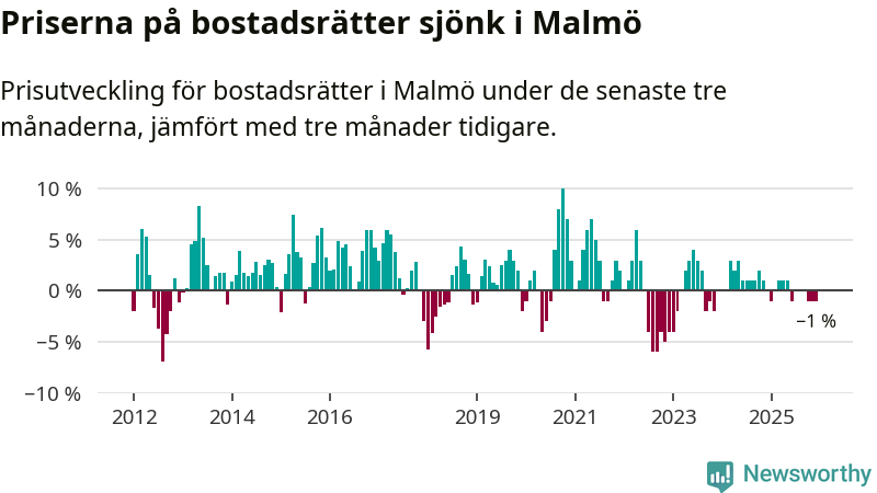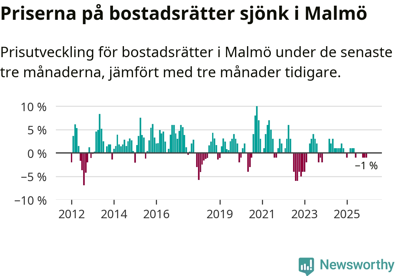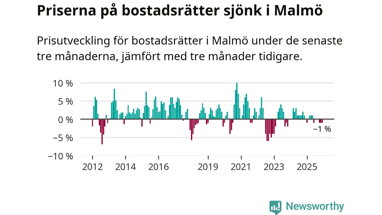 Priserna på bostadsrätter har gått ner i Malmö kommun. Medelpriset på försäljningarna under de senaste tre månaderna visar på en nedgång med 1 procent.