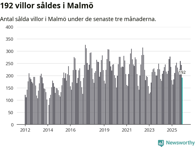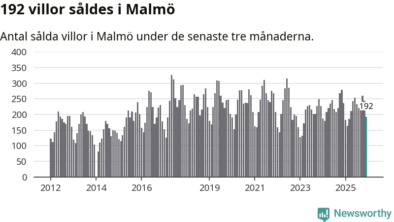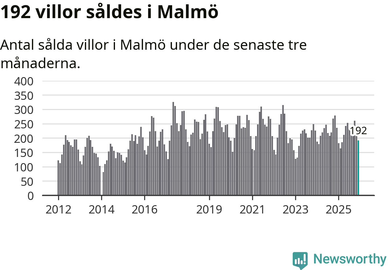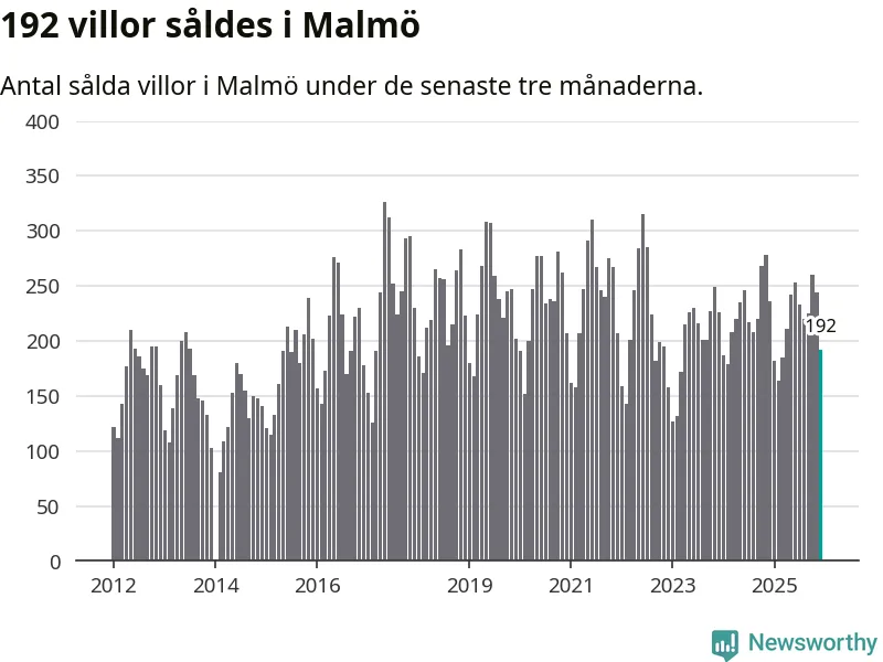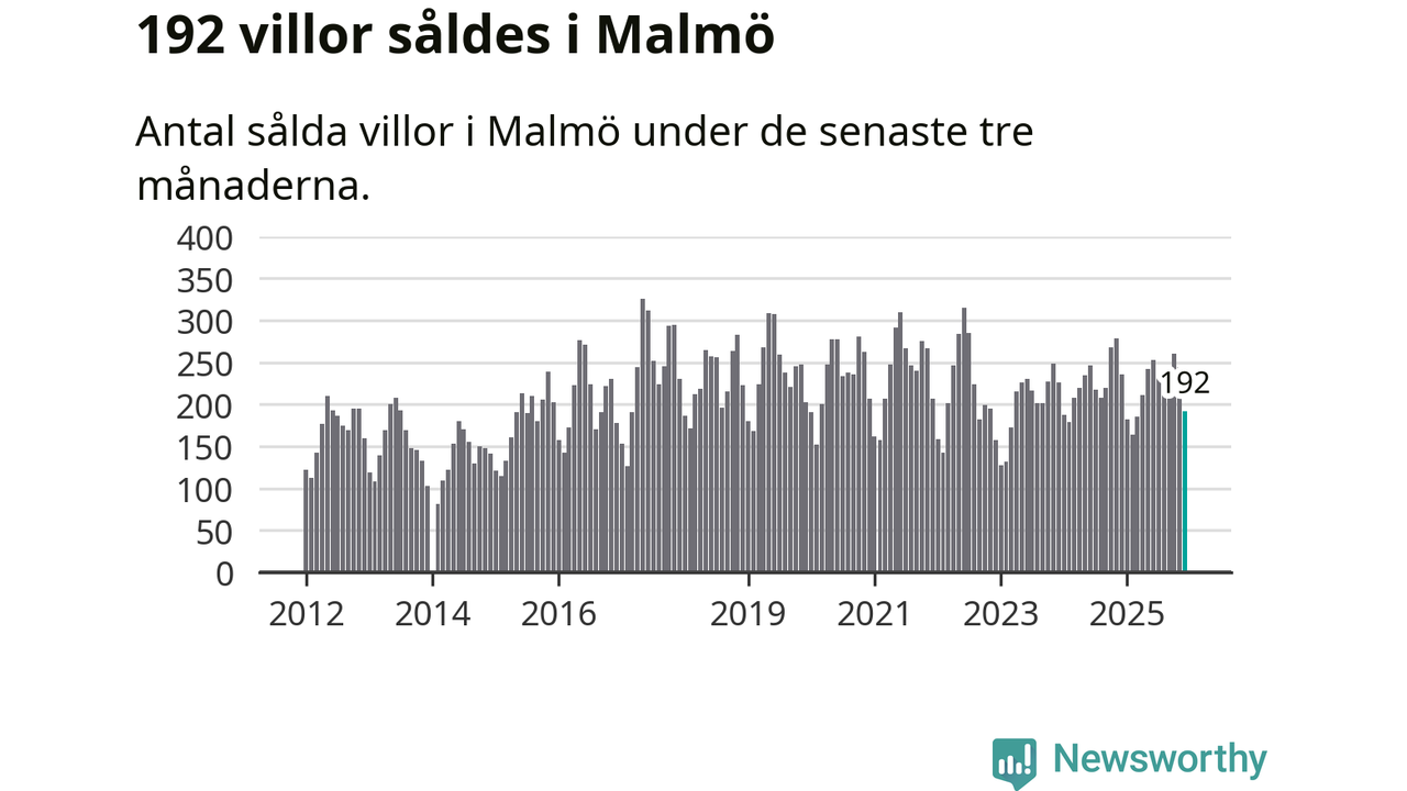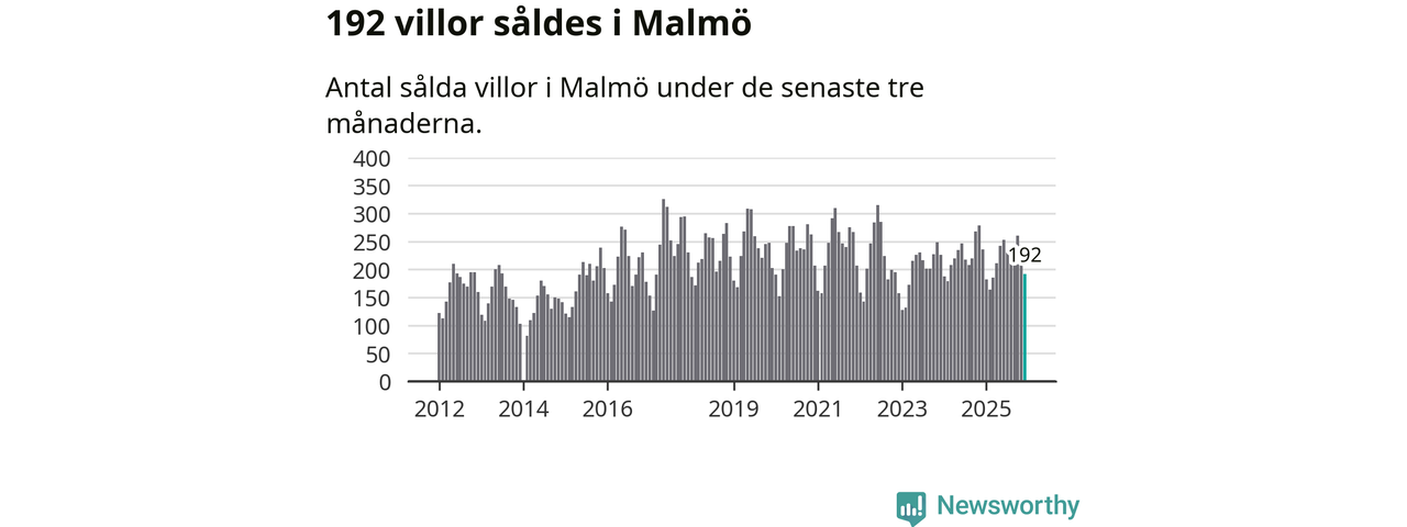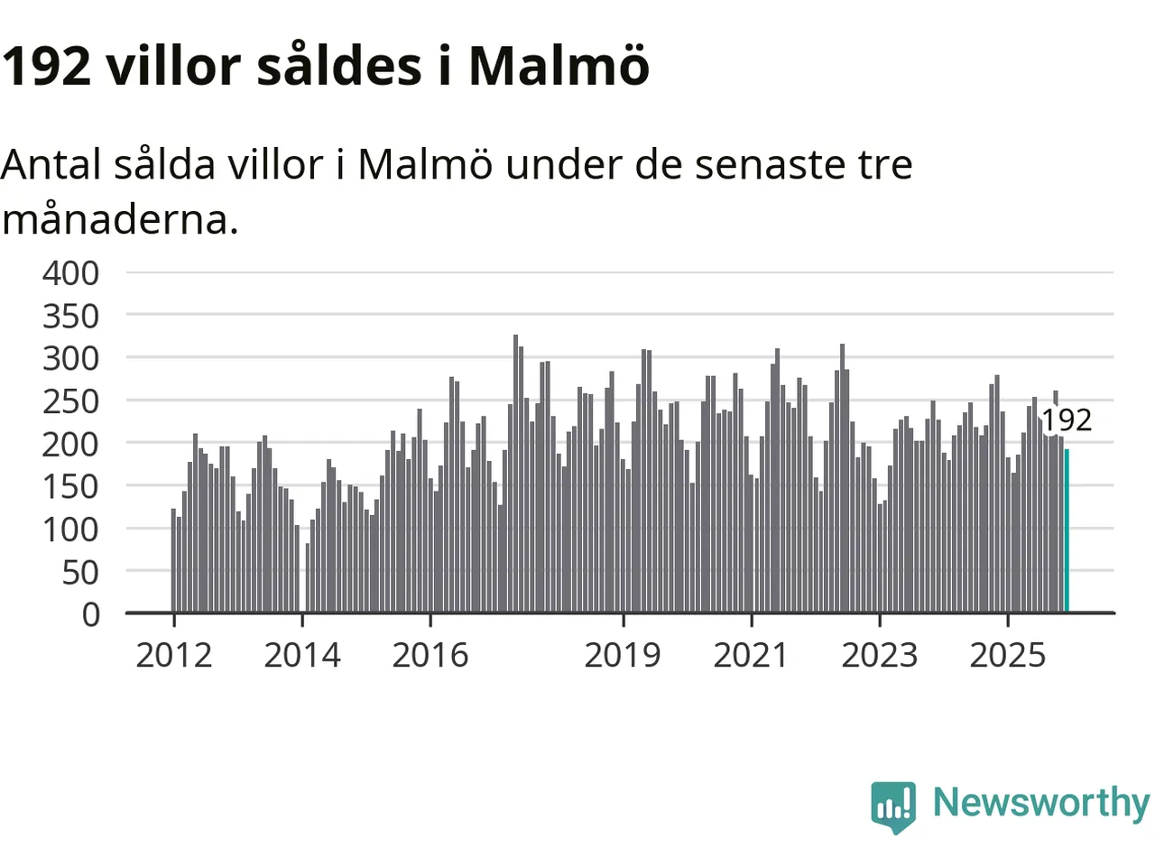 Sammanlagt såldes 192 villor i Malmö kommun mellan oktober och december till ett genomsnittligt pris på 6,4 miljoner kronor. I fjol gjordes 236 affärer vid den här tiden på året.