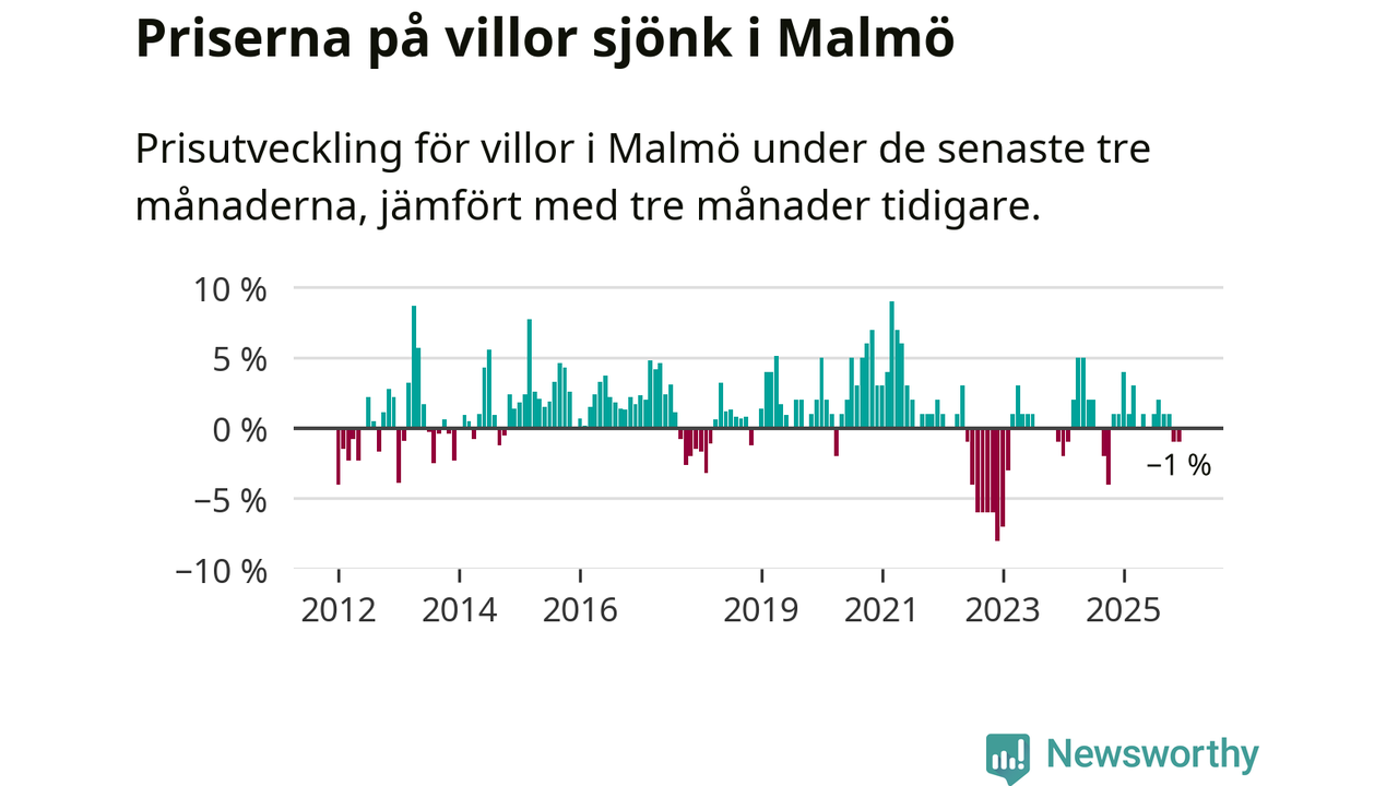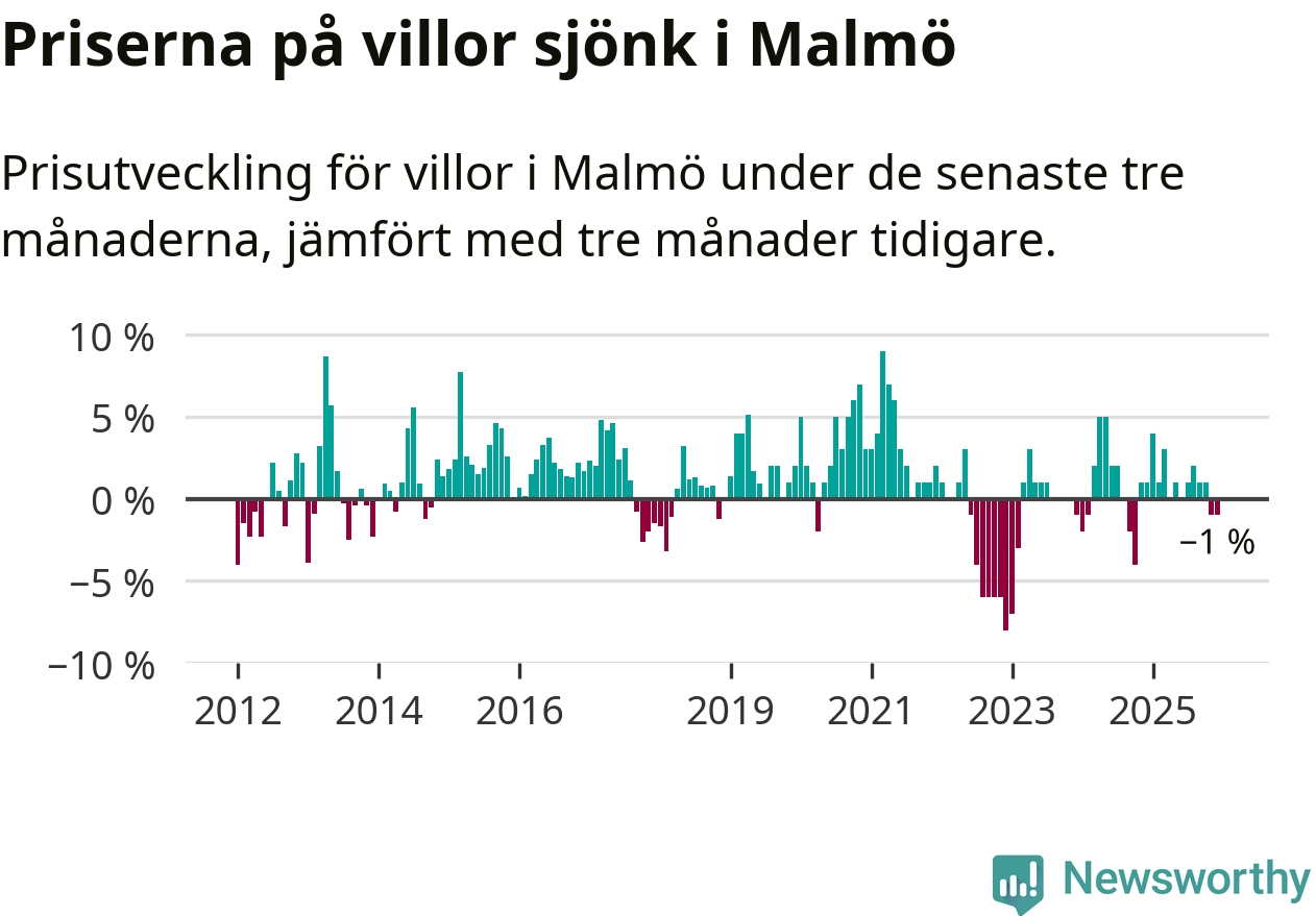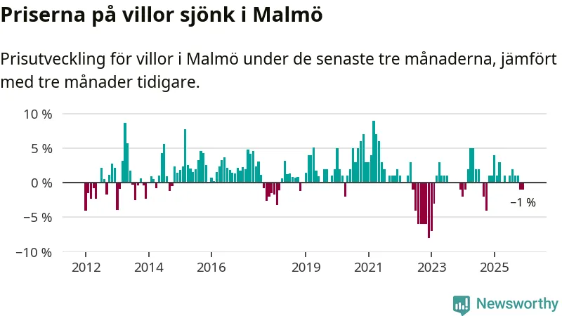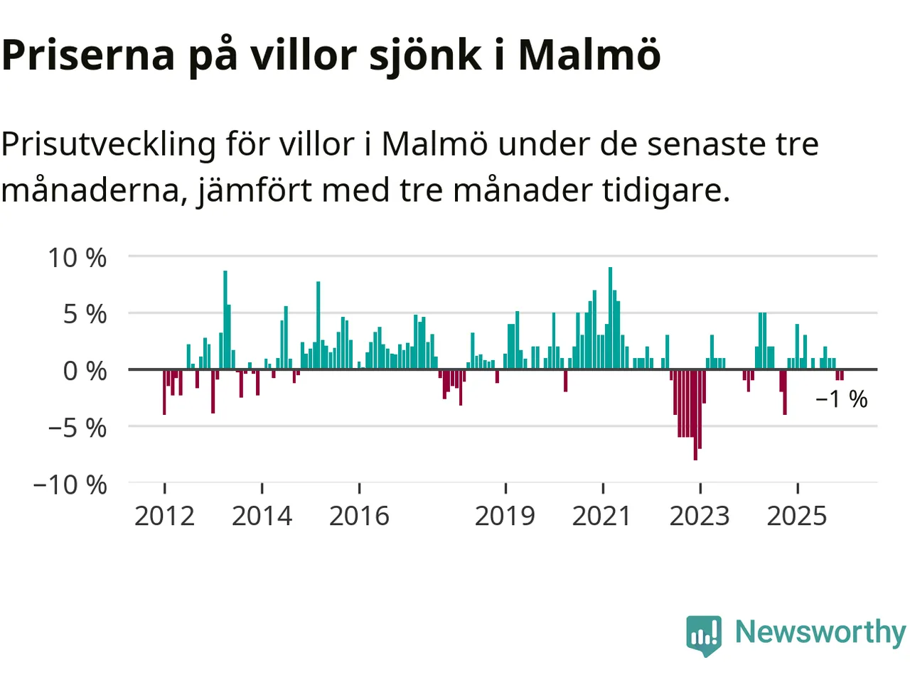 Villapriserna har gått ner i Malmö kommun. Medelpriset på försäljningarna under de senaste tre månaderna visar på en nedgång med 1 procent.