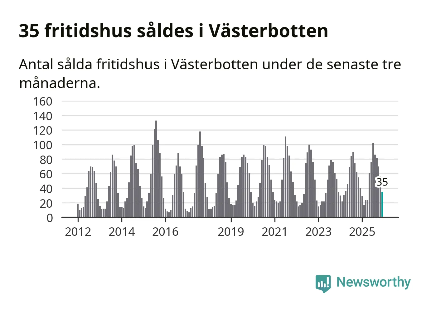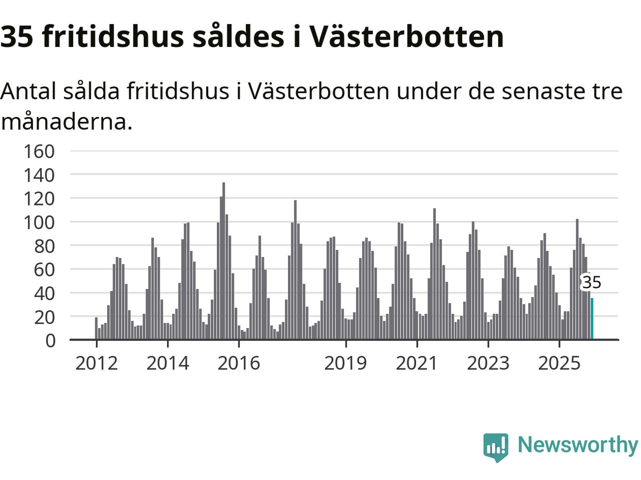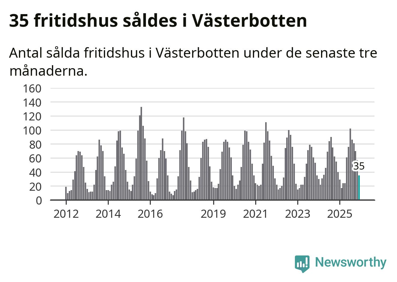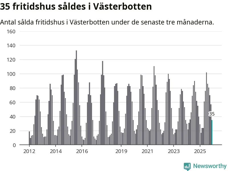 Sammanlagt såldes 35 fritidshus i Västerbottens län mellan oktober 2025 och december 2025 till ett genomsnittligt pris på 1,8 miljoner kronor. I fjol gjordes 40 affärer vid den här tiden på året.