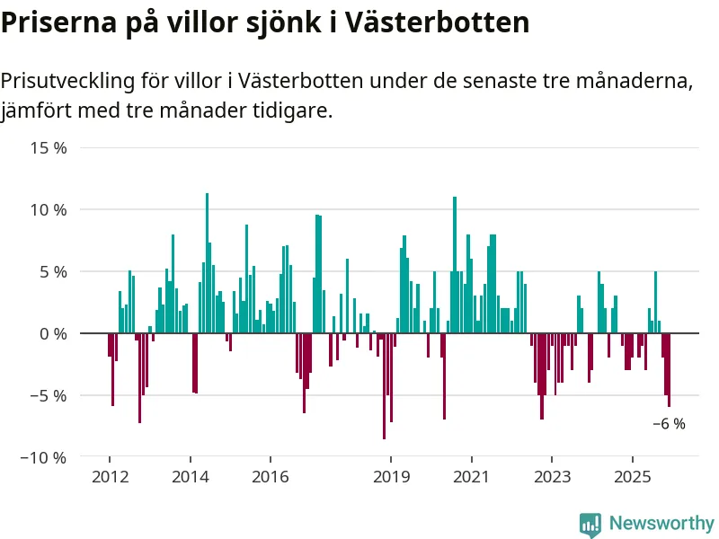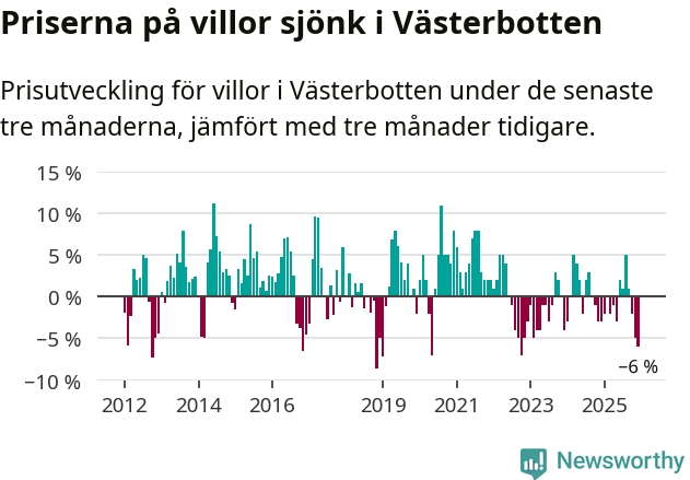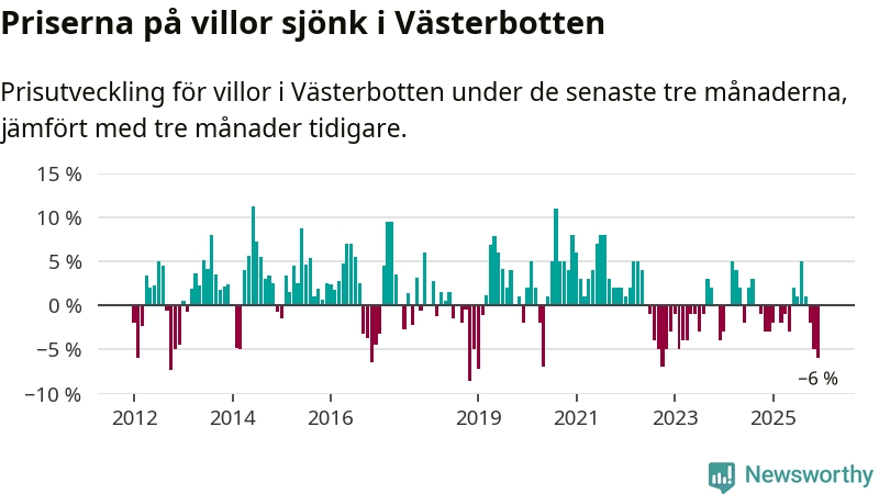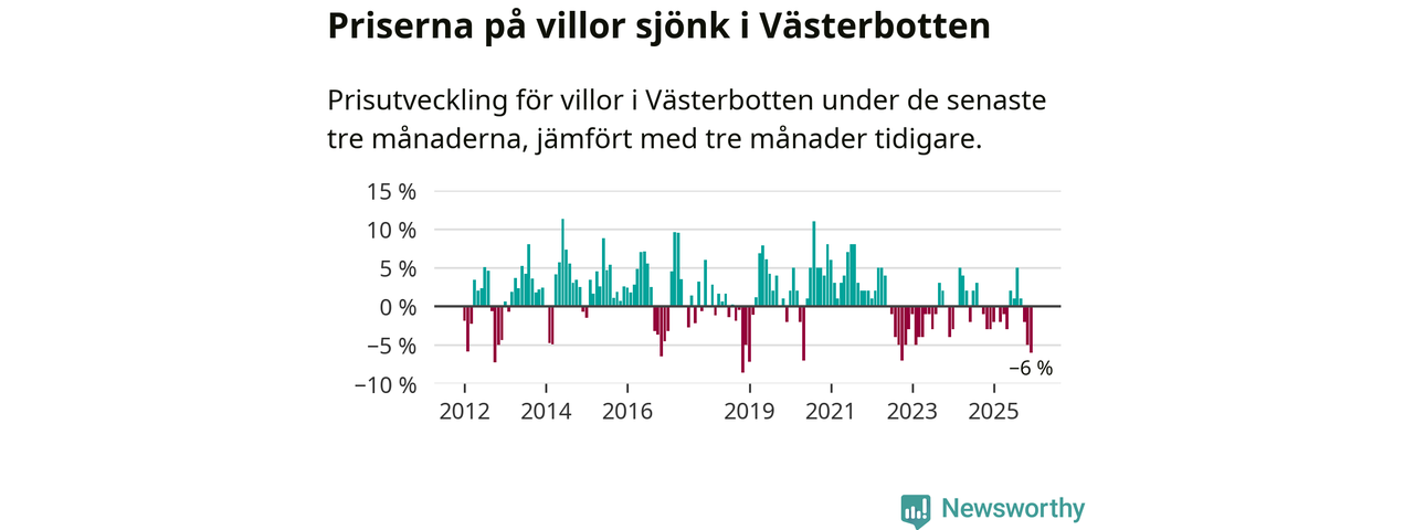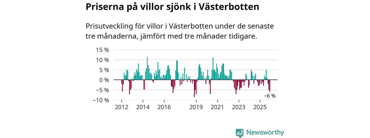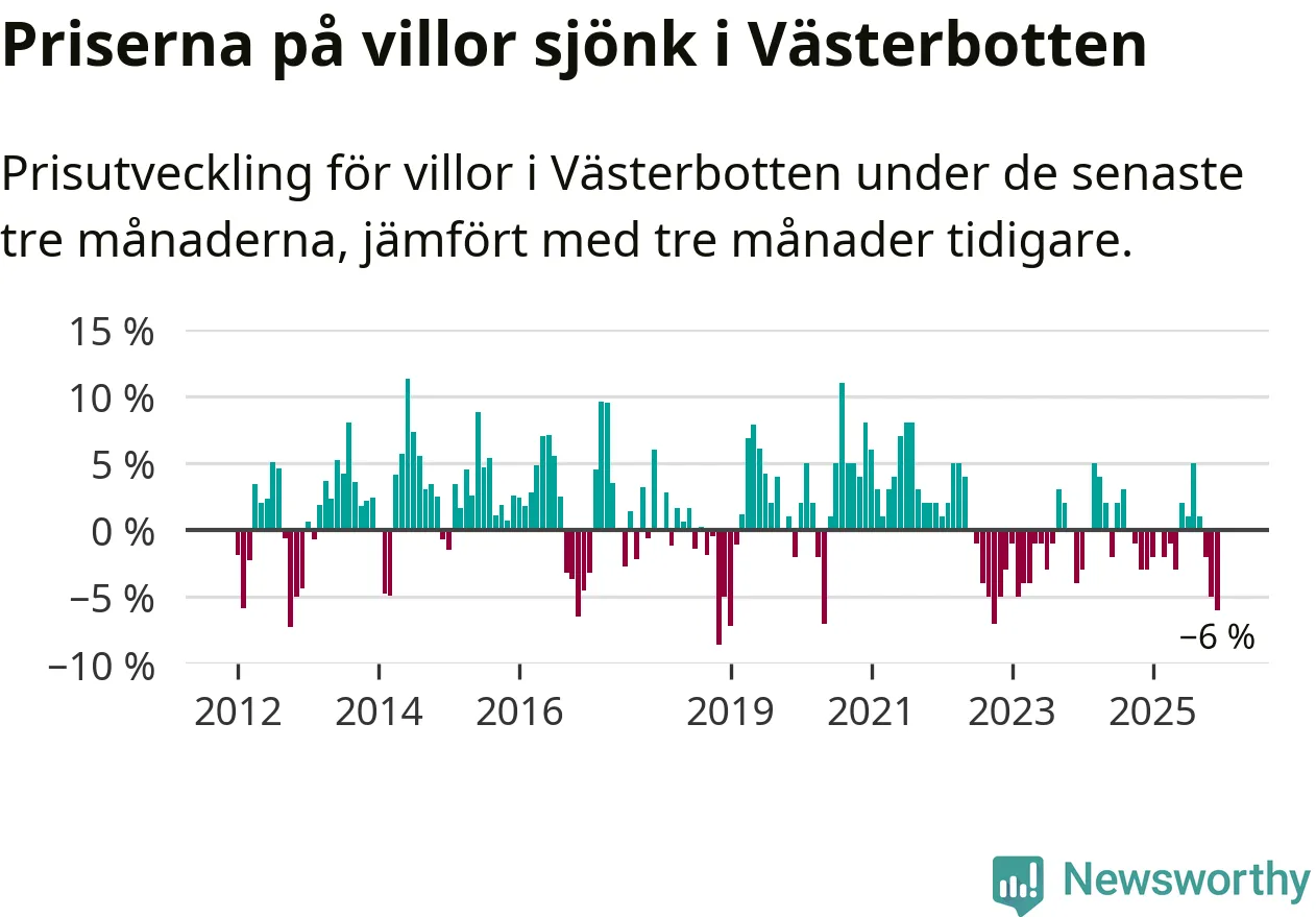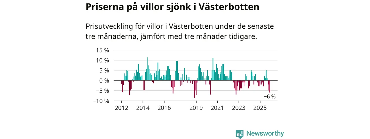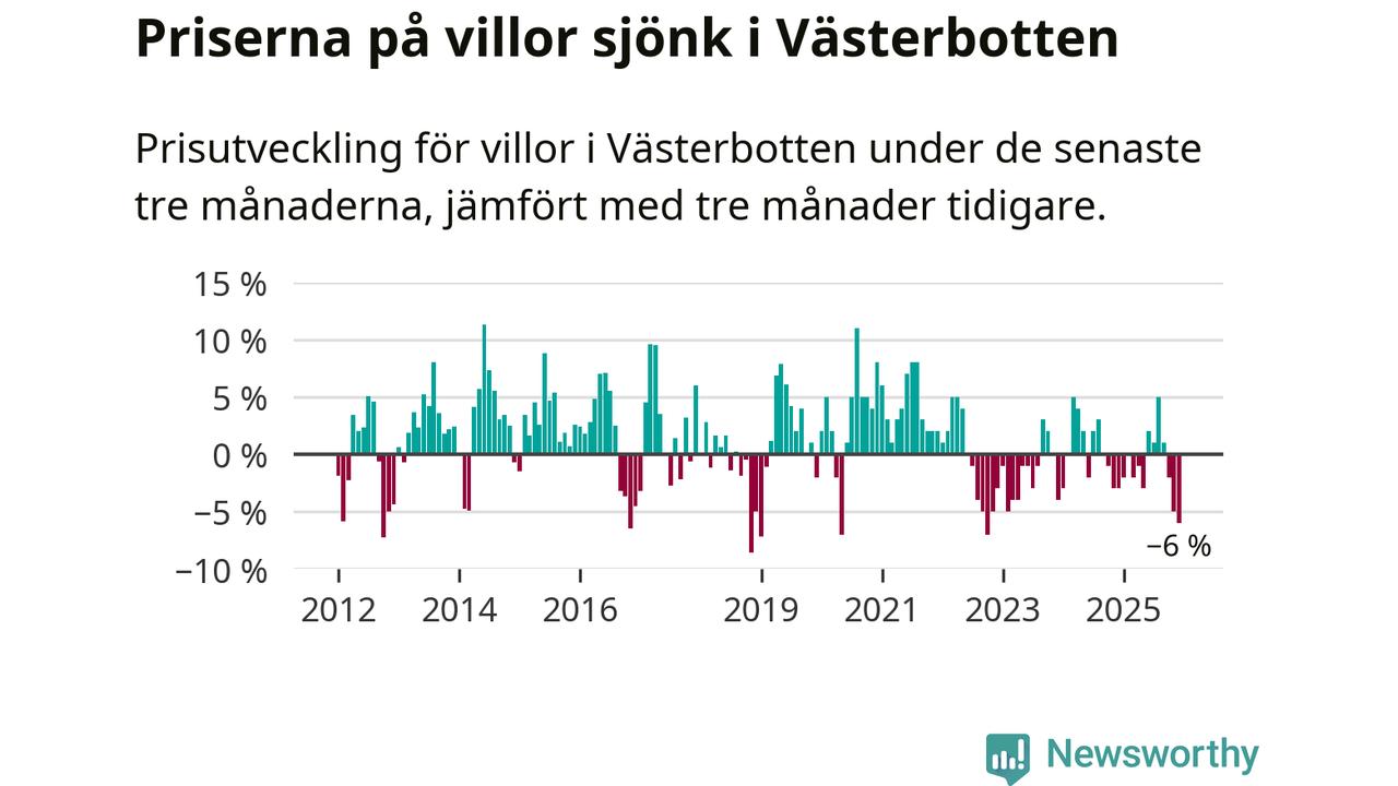 Villapriserna sjönk med sex procent i Västerbottens län under de senaste tre månaderna. Det är den svagaste prisutvecklingen sedan 2022.