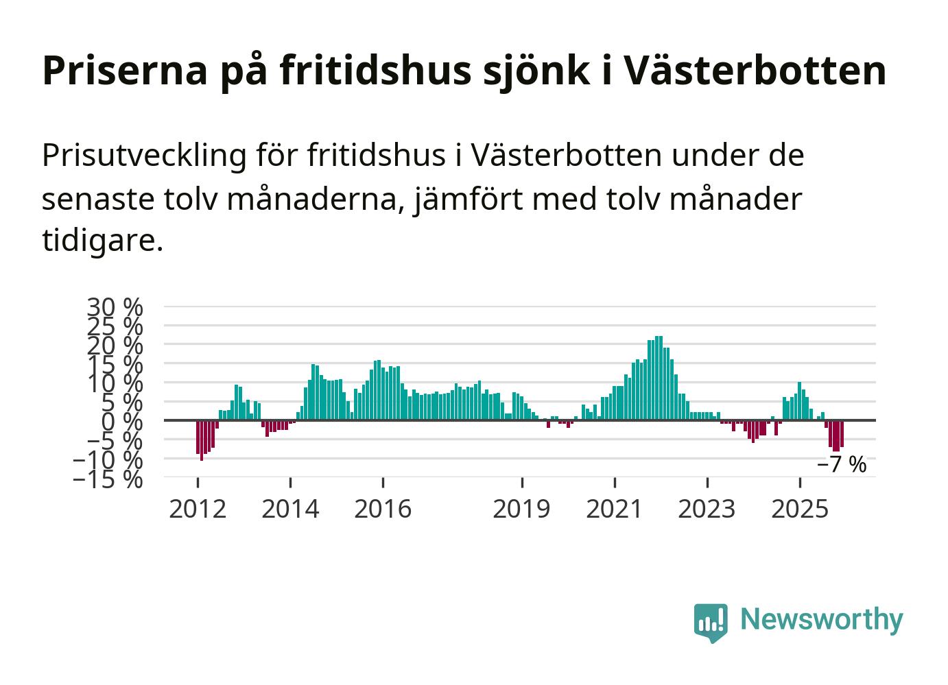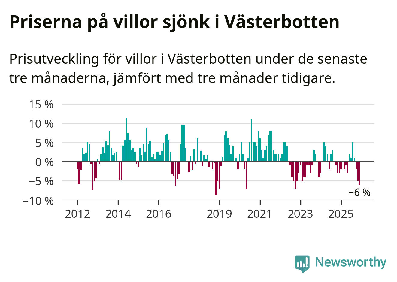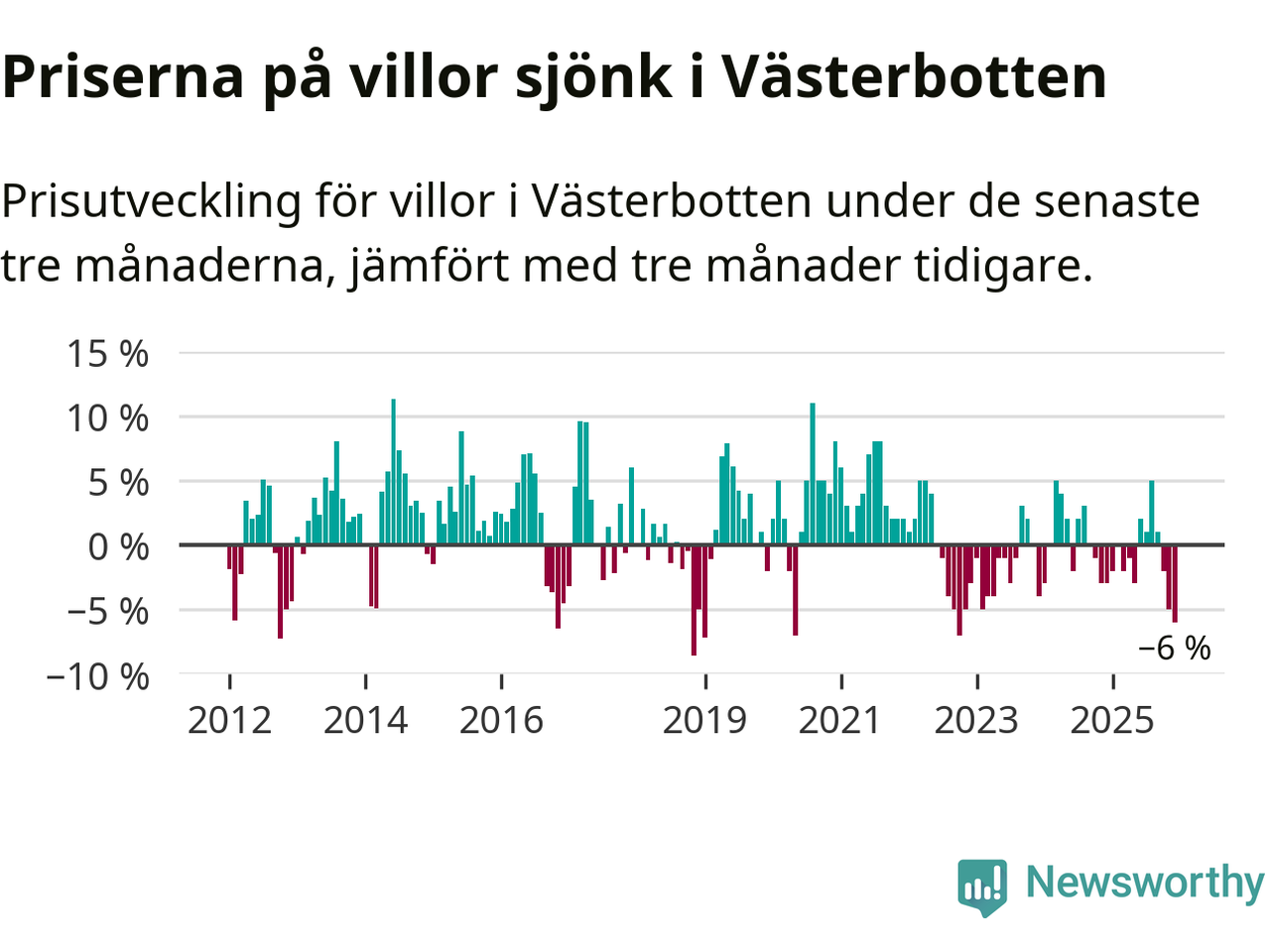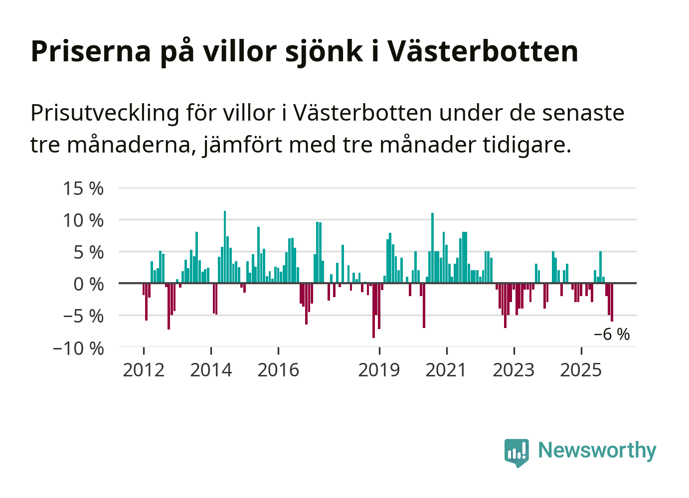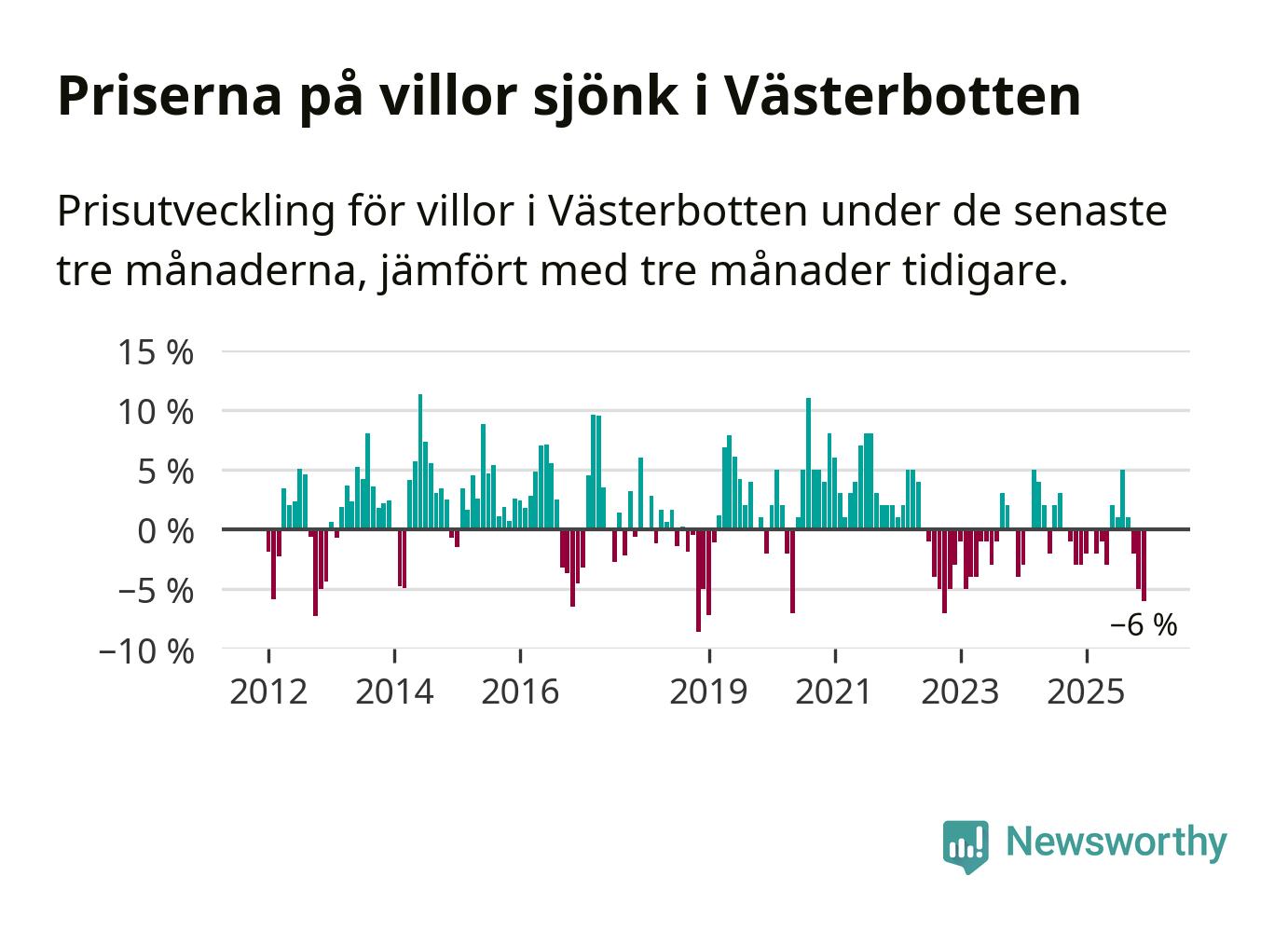 Villapriserna sjönk med sex procent i Västerbottens län under de senaste tre månaderna. Det är den svagaste prisutvecklingen sedan 2022.