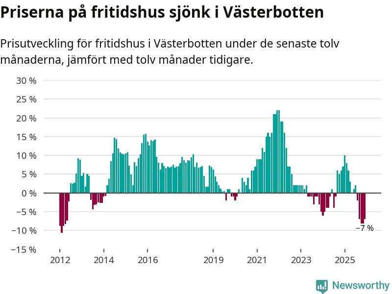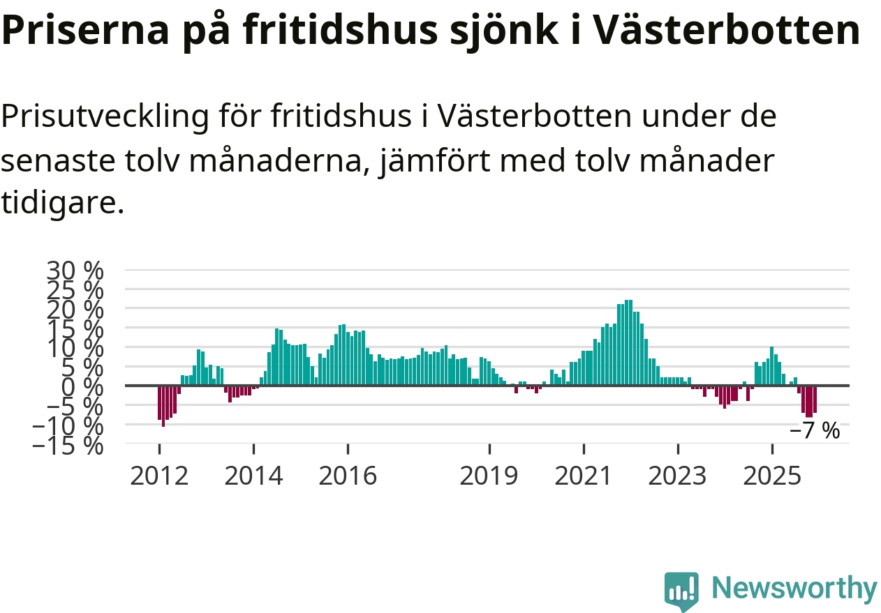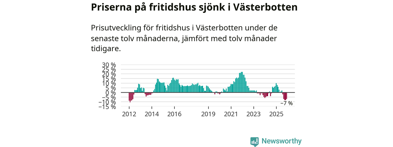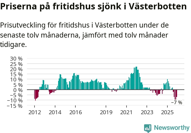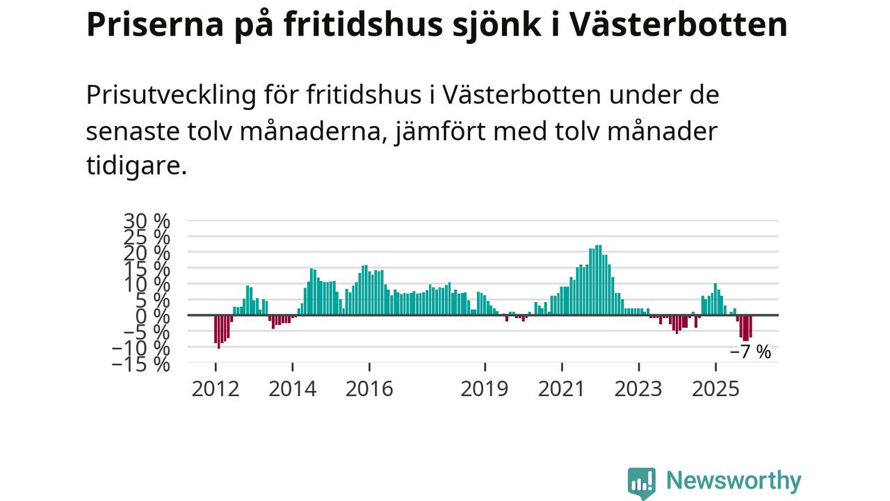 På grund av få försäljningar saknas uppgifter om prisförändringar för fritidshus i tolv av länets 15 kommuner. Bland de tre vi har uppgifter om sjunker priserna i samtliga.I Västerbottens län som helhet går priserna på fritidshus ner med 7 procent. Även i hela Sverige sjunker priserna på fritidshus. I hela riket noterades en prisnedgång på 2 procent.