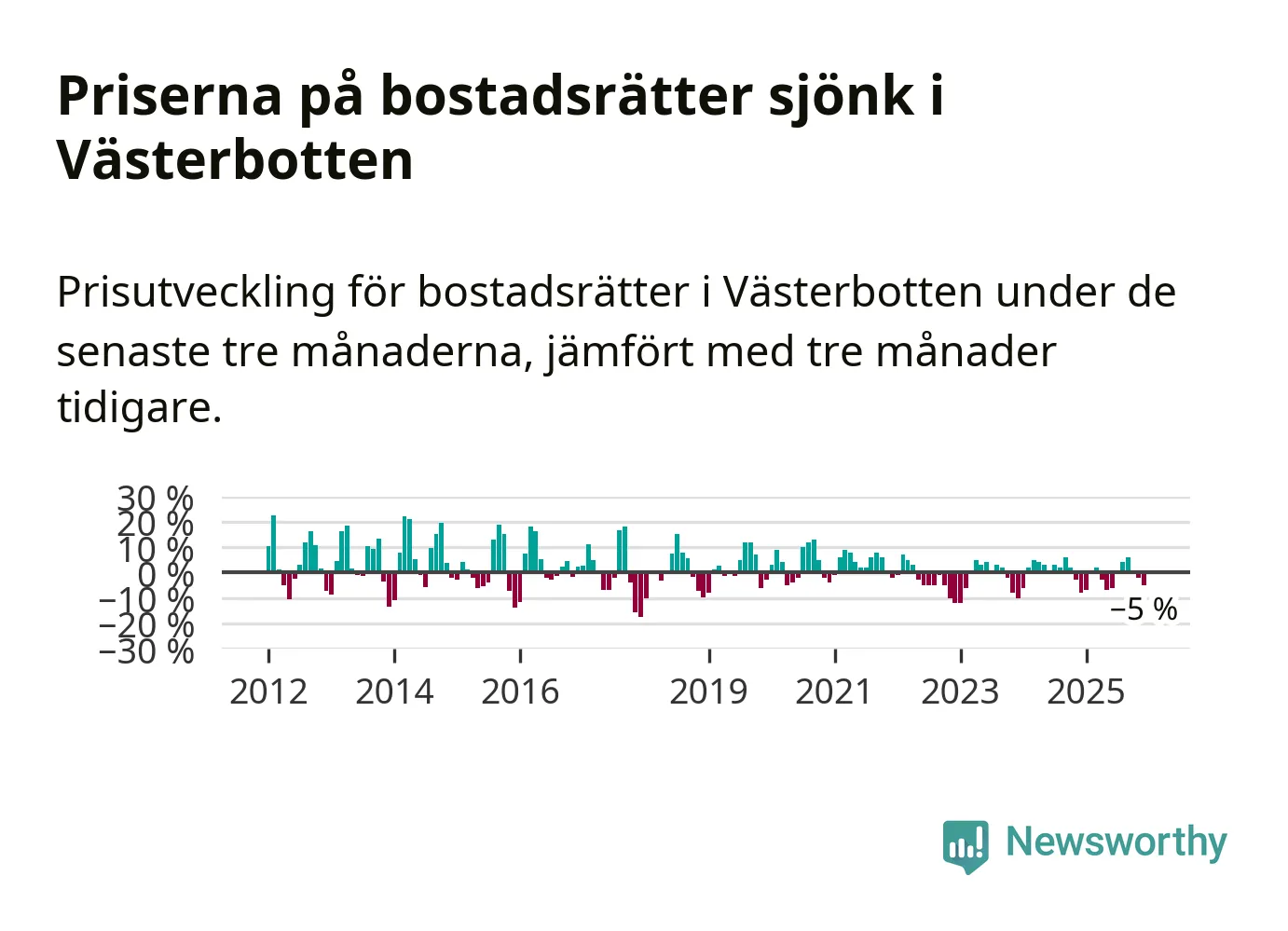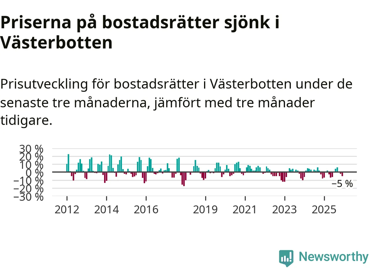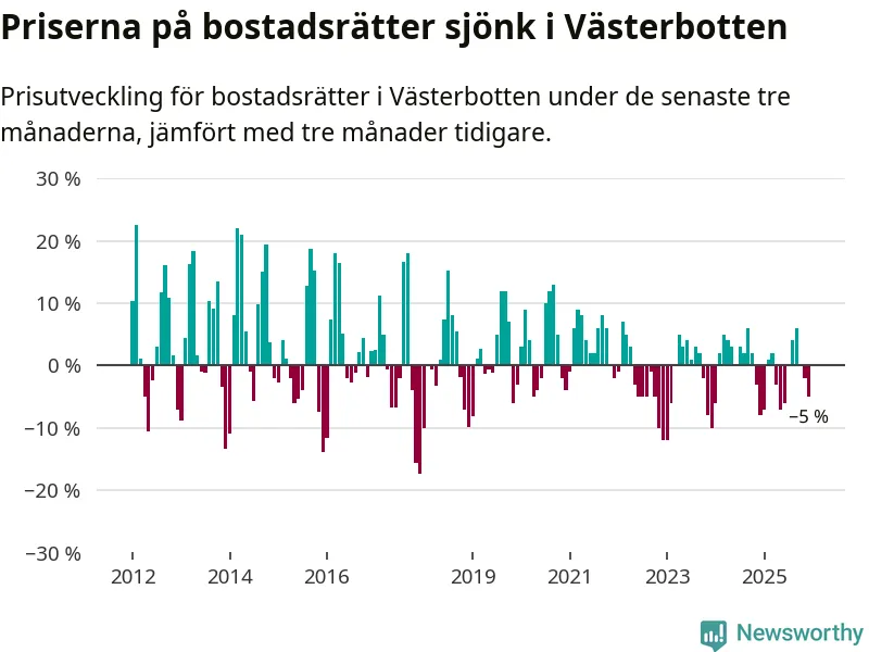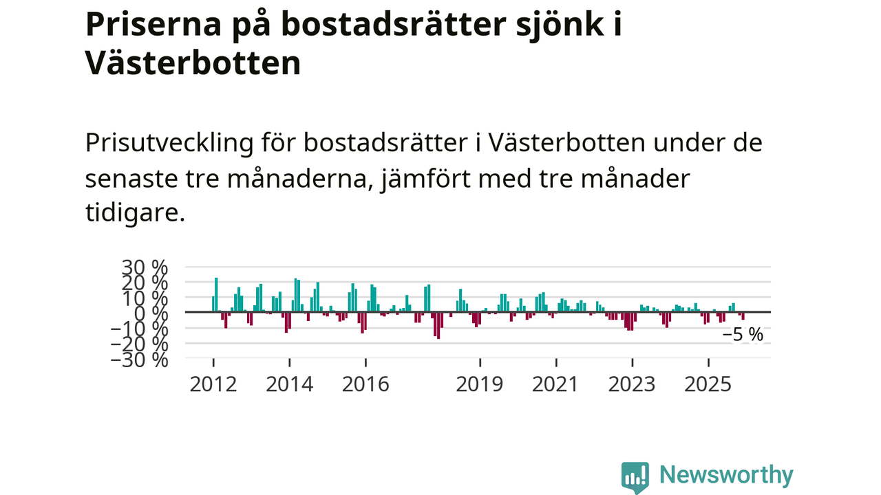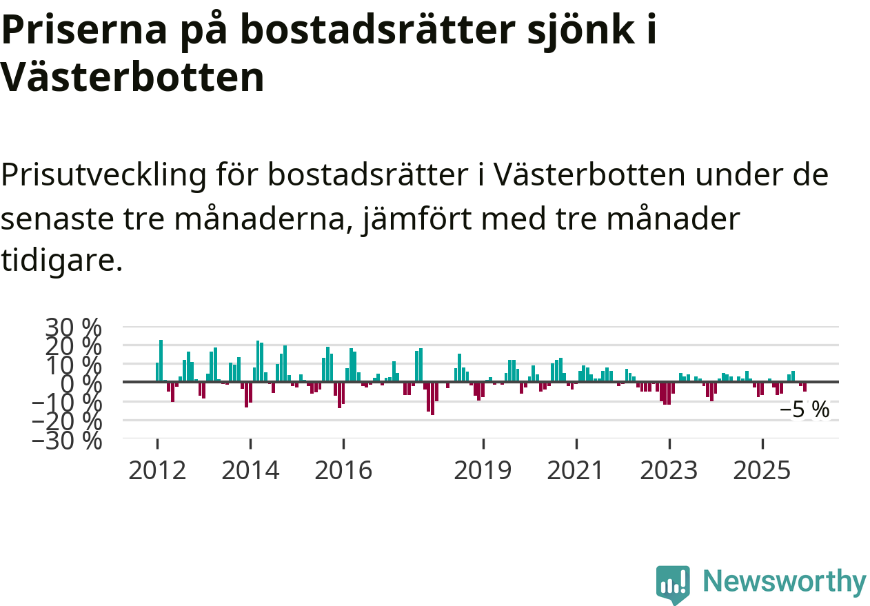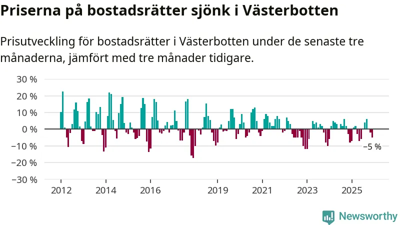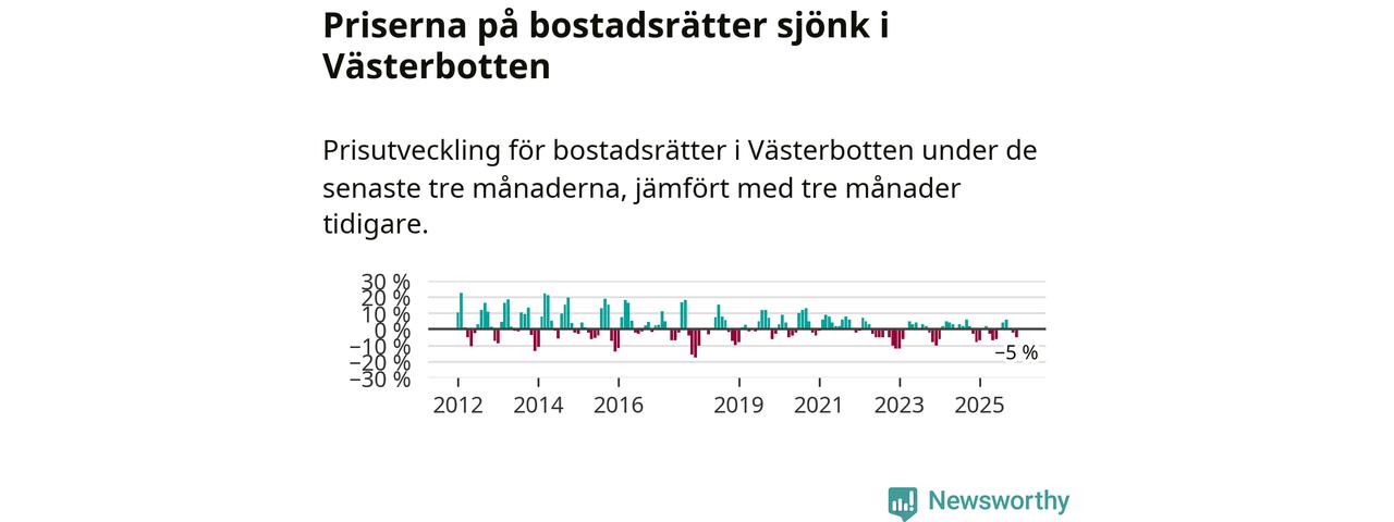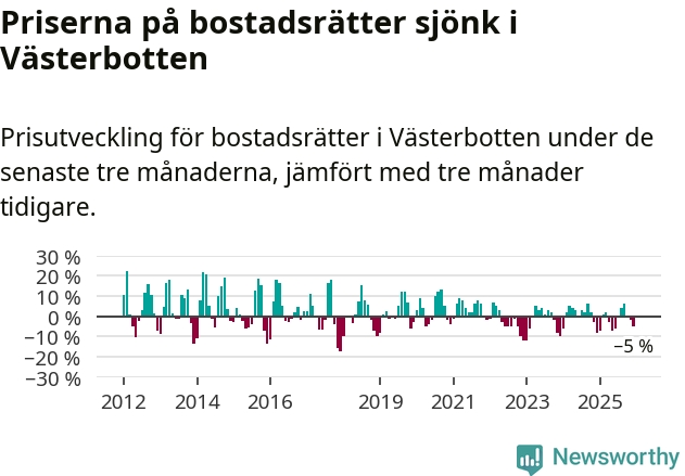 Priserna på bostadsrätter har gått ner i Västerbottens län. Medelpriset på försäljningarna under de senaste tre månaderna visar på en nedgång med 5 procent.