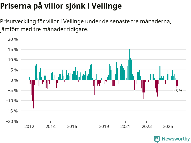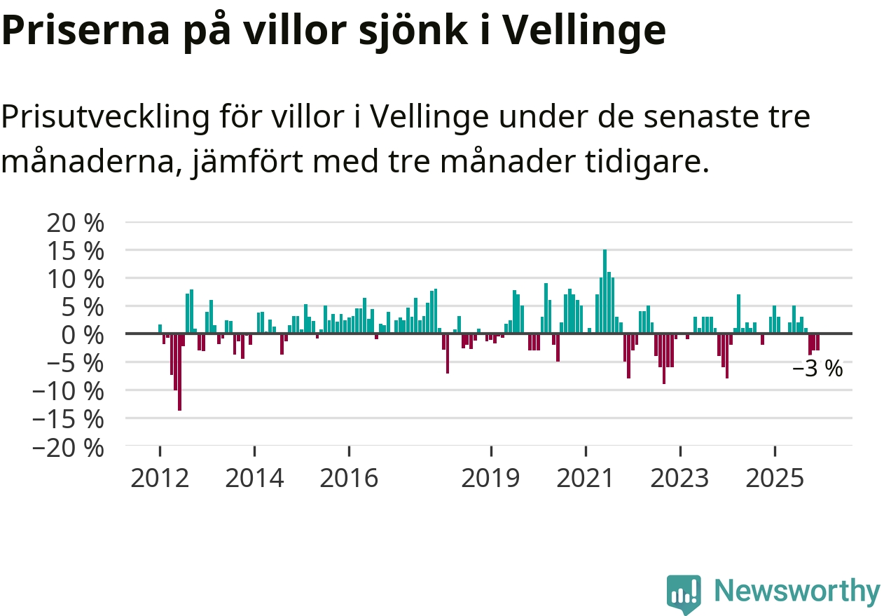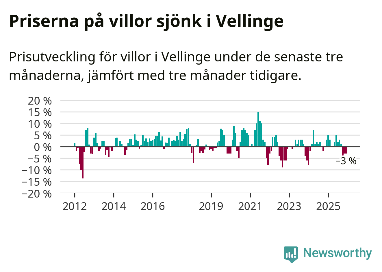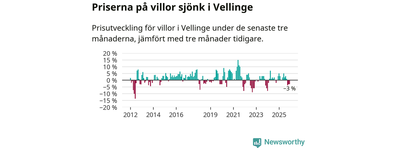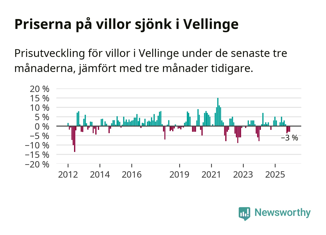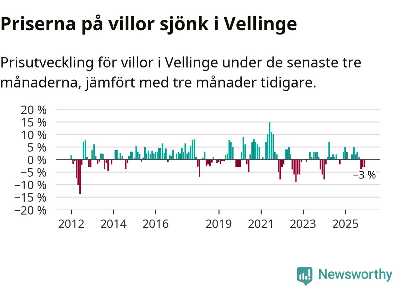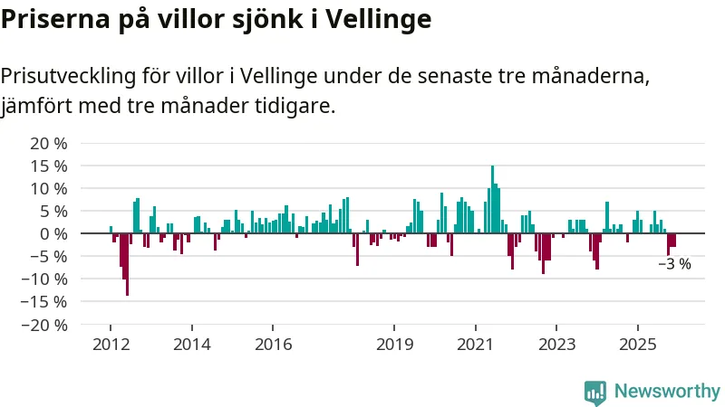 Villapriserna har gått ner i Vellinge kommun. Medelpriset på försäljningarna under de senaste tre månaderna visar på en nedgång med 3 procent.
