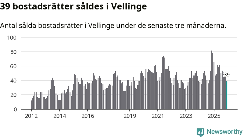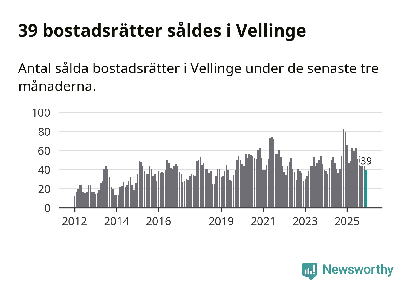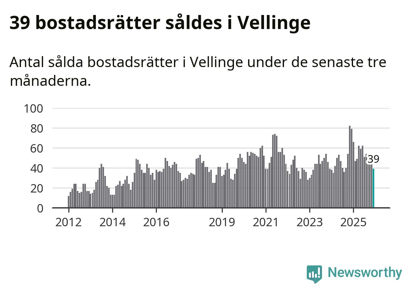 Mellan oktober och december såldes 39 bostadsrätter i Vellinge kommun. Det är relativt få sett till aktiviteten på bostadsmarknaden i kommunen under de senaste tolv månaderna, samt det historiska snittet för den här tiden på året.