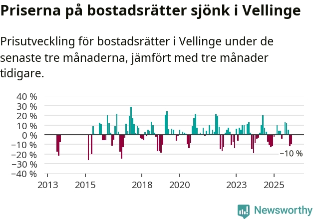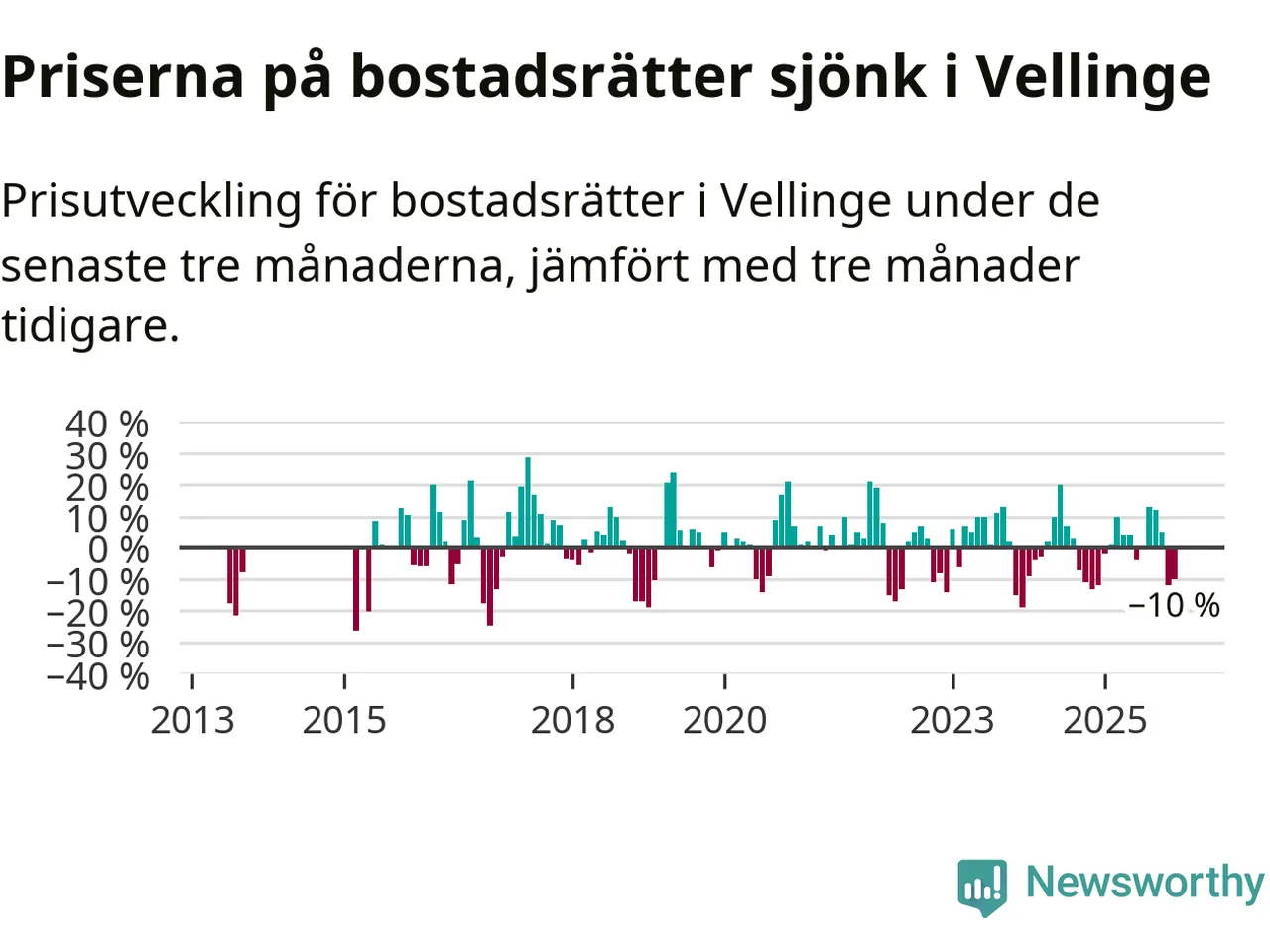 Statistiken visar även på en stor prisnedgång i Vellinge kommun. Medelpriset på försäljningarna av bostadsrätter i kommunen var 10 procent lägre än för tre månader sedan. Även i hela Skåne sjunker priserna på bostadsrätter. I hela länet noterades en prisnedgång på 2 procent.