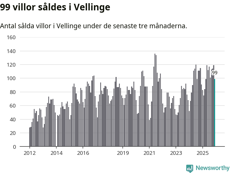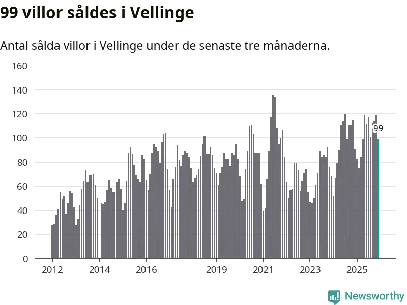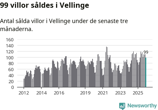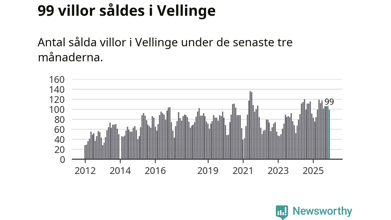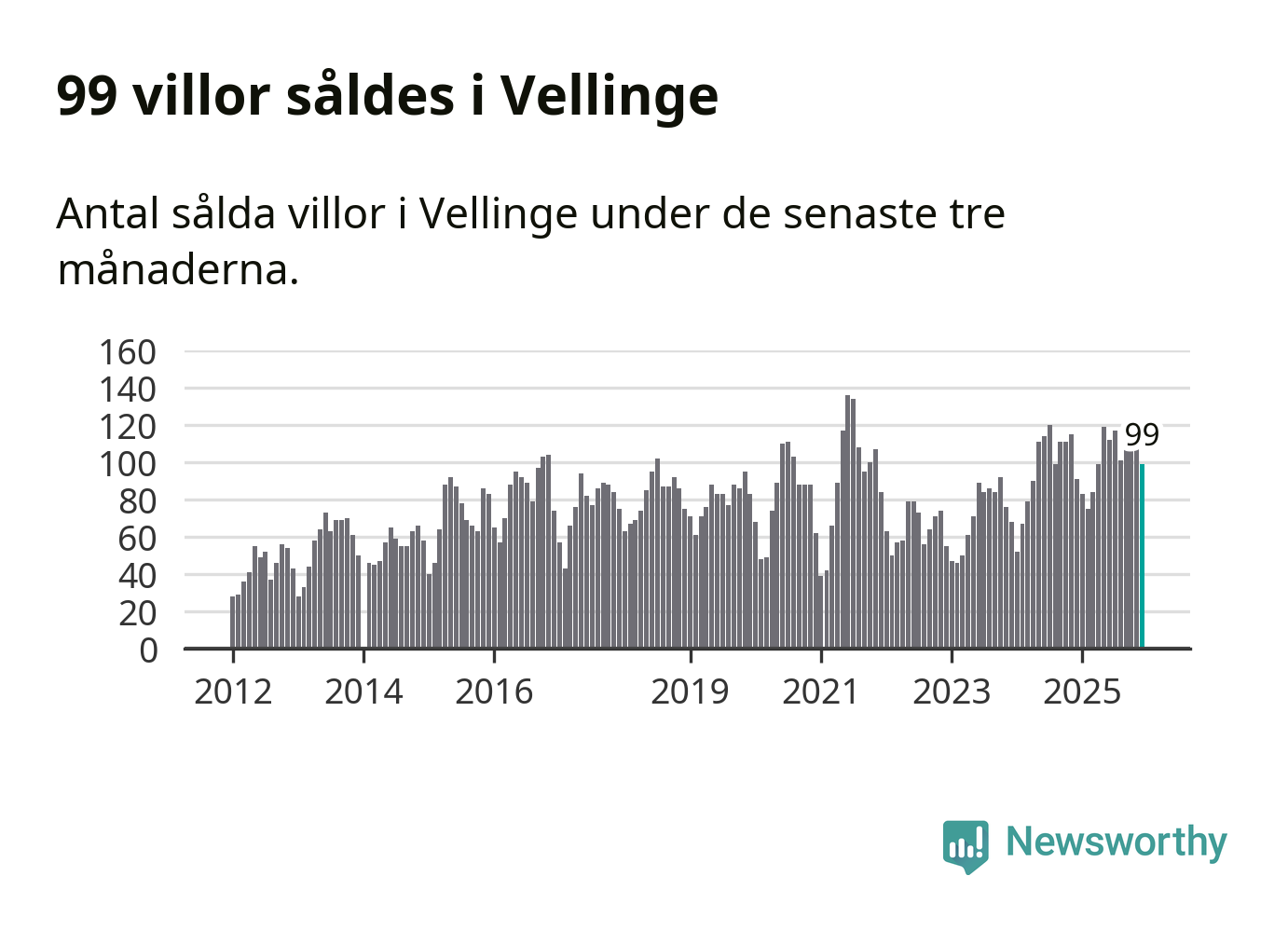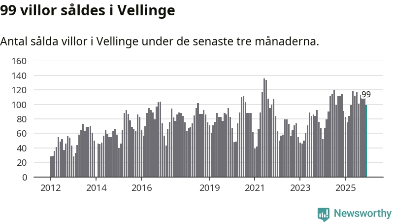 Sammanlagt såldes 99 villor i Vellinge kommun mellan oktober och december till ett genomsnittligt pris på 8,4 miljoner kronor. I fjol gjordes 91 affärer vid den här tiden på året.