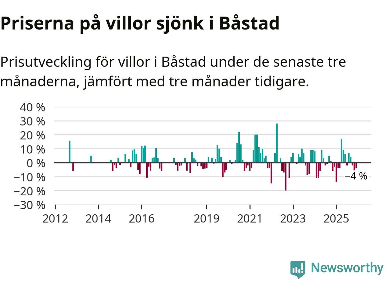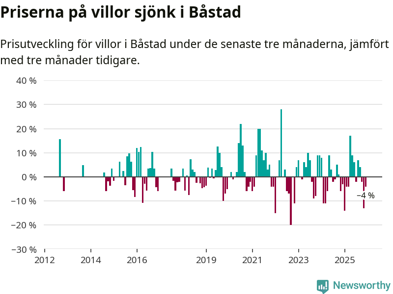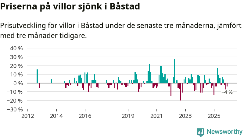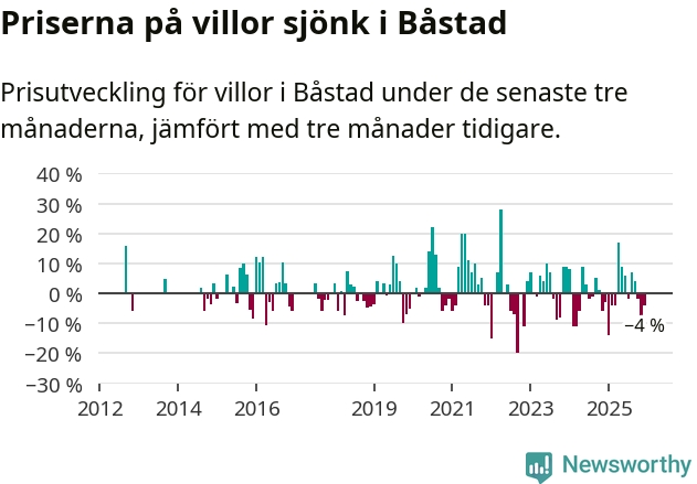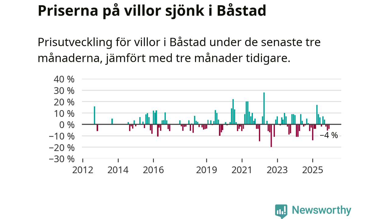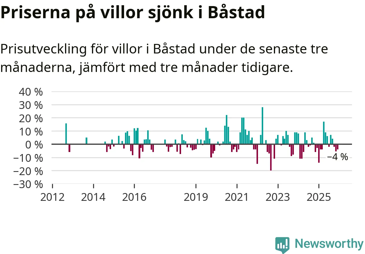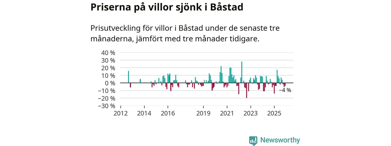 Statistiken visar även på en kännbar prisnedgång i Båstads kommun. Medelpriset på försäljningarna av villor i kommunen var 4 procent lägre än för tre månader sedan. Även i hela Skåne sjunker villapriserna. I hela länet noterades en prisnedgång på 2 procent.