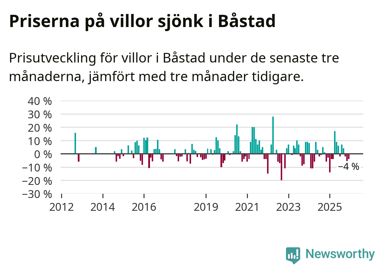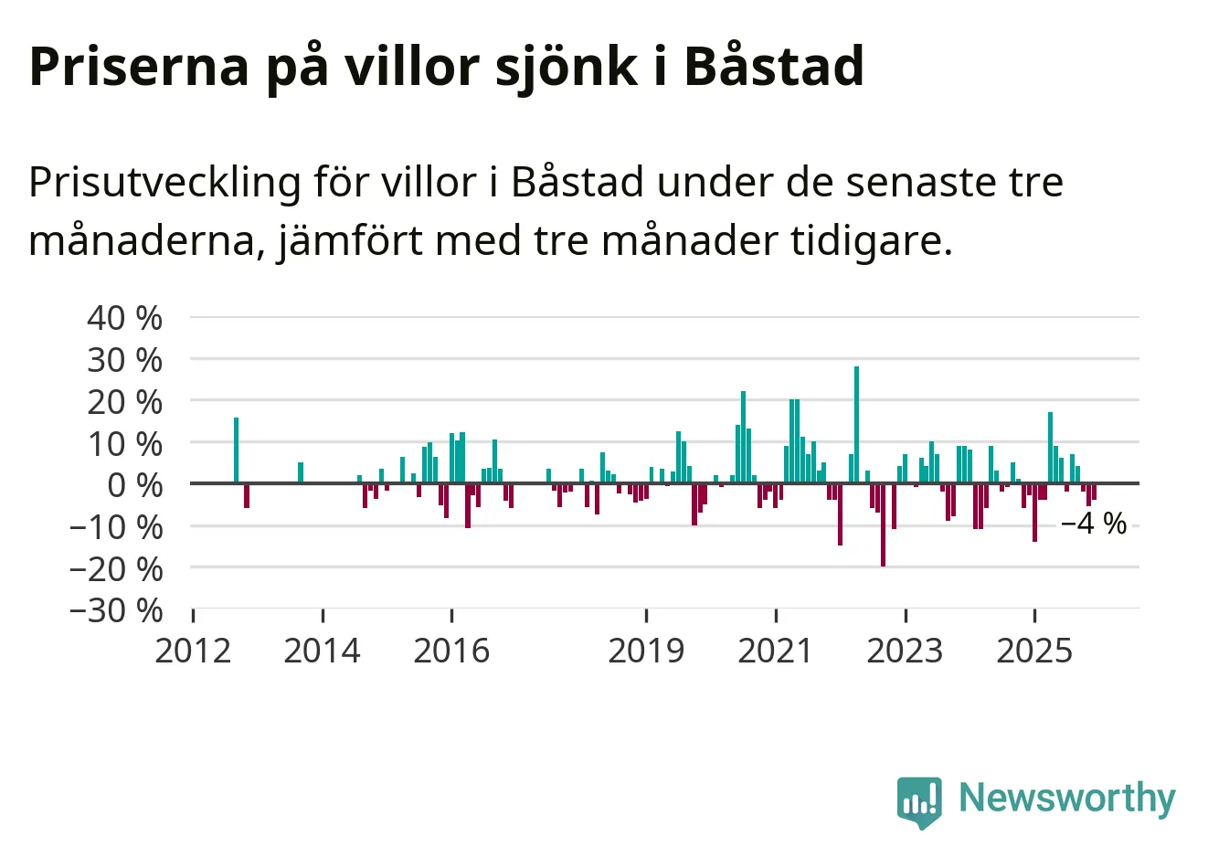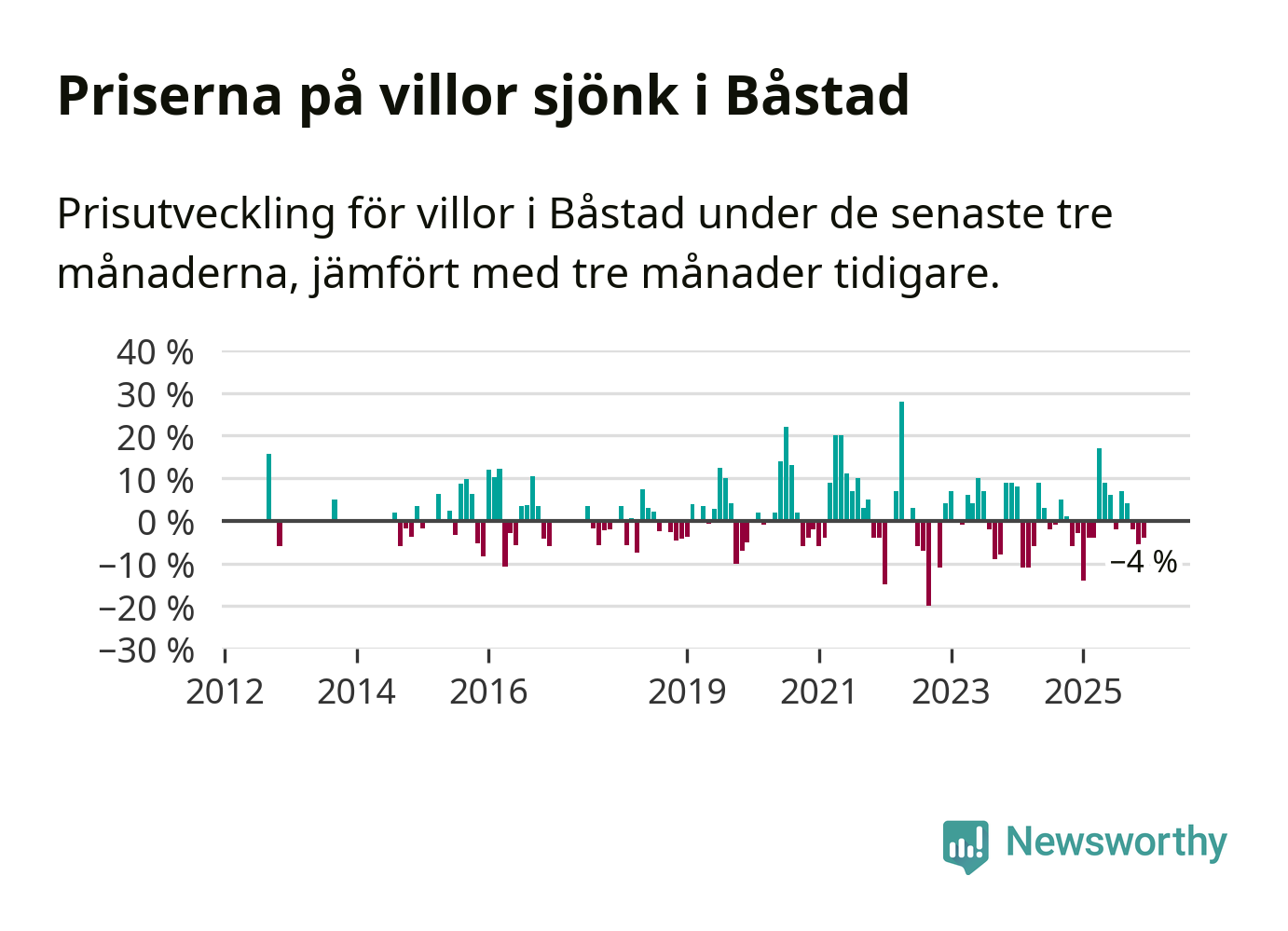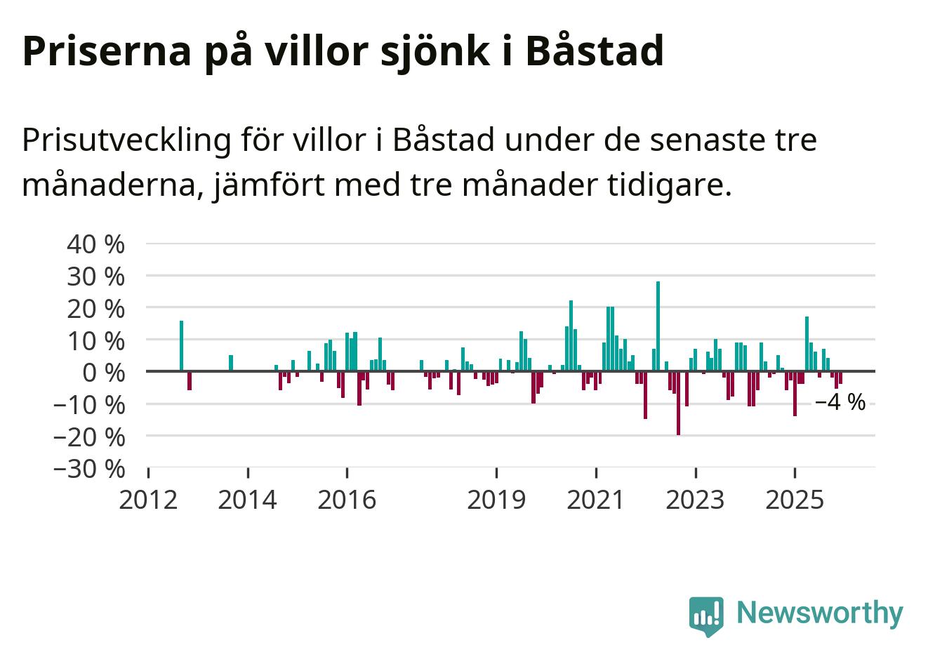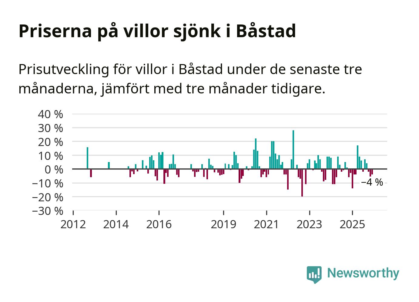 Statistiken visar även på en kännbar prisnedgång i Båstads kommun. Medelpriset på försäljningarna av villor i kommunen var 4 procent lägre än för tre månader sedan. Även i hela Skåne sjunker villapriserna. I hela länet noterades en prisnedgång på 2 procent.