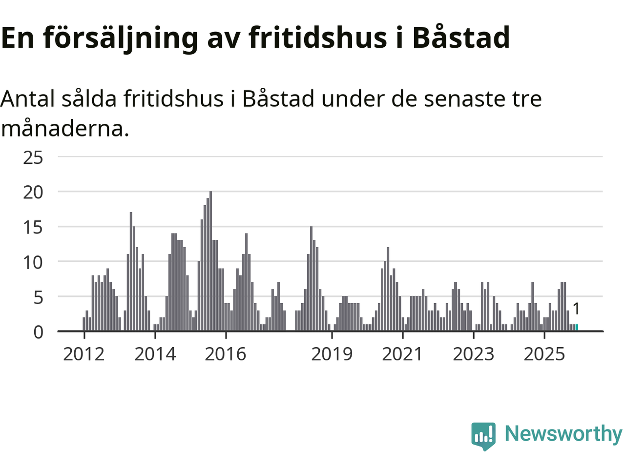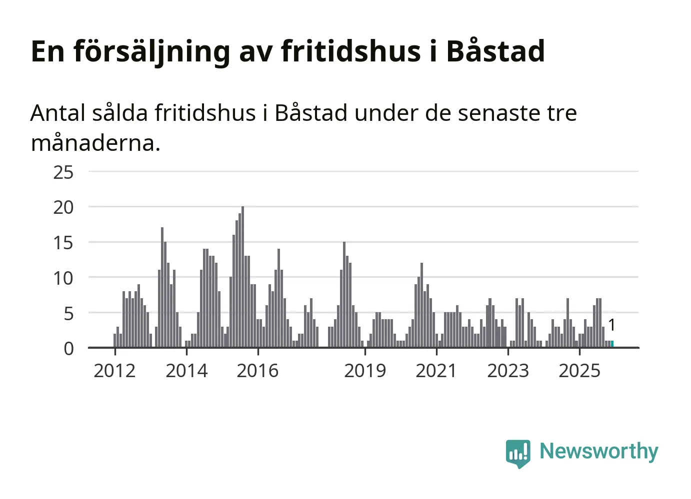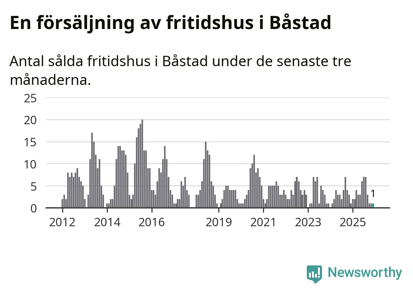 Mellan oktober och december gjordes sammanlagt en affär med fritidshus i Båstads kommun. Det är lika många affärer som vid motsvarande tid i fjol.