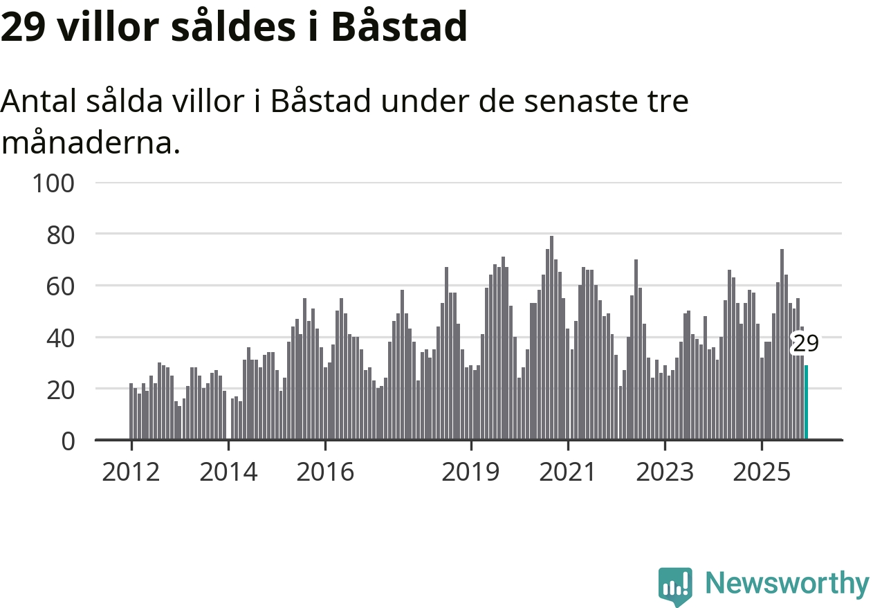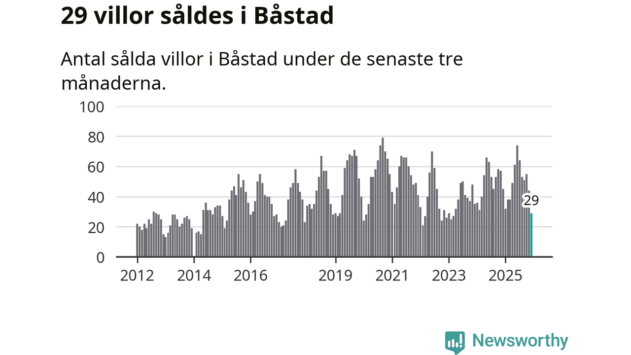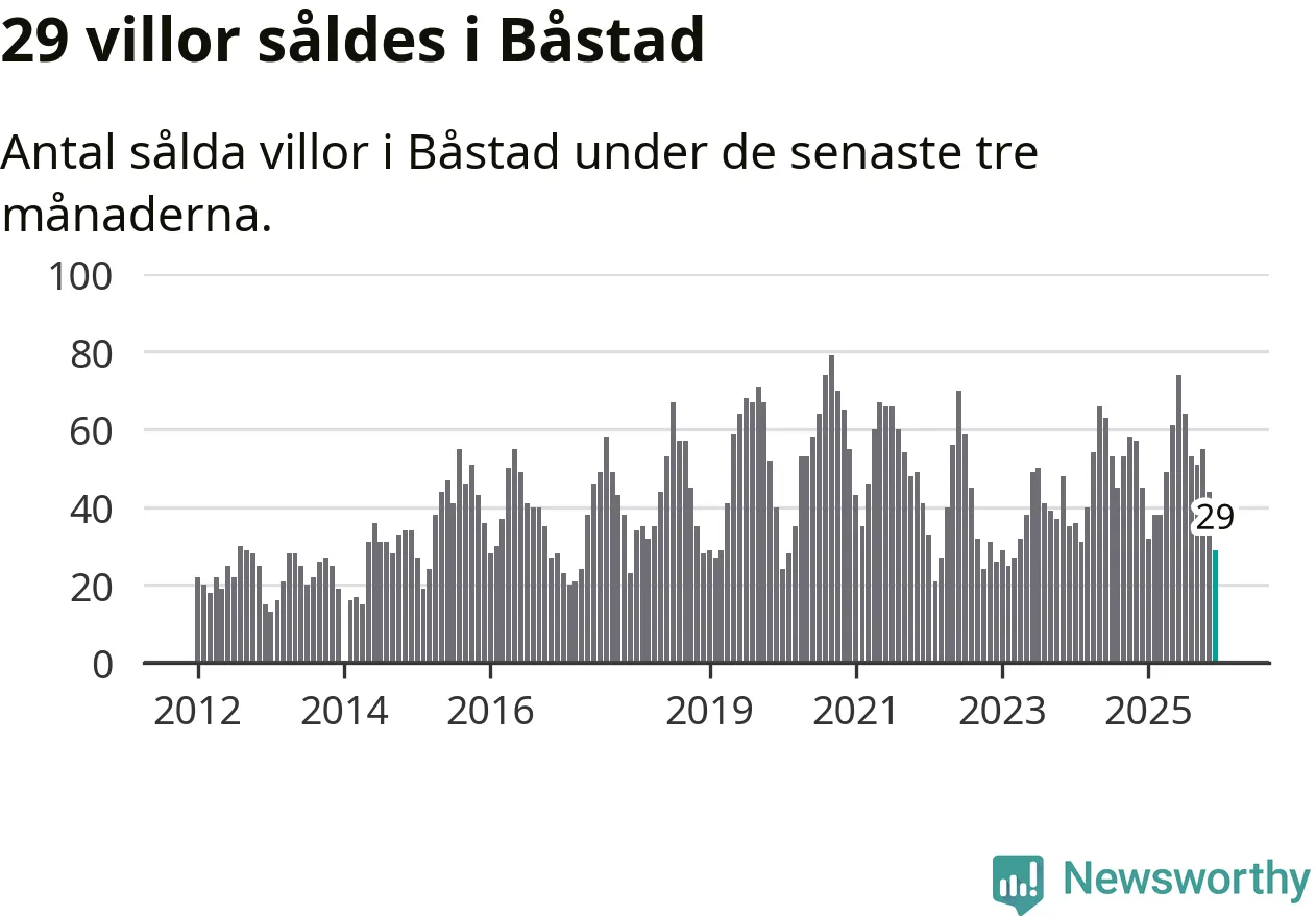 Mellan oktober och december såldes 29 villor i Båstads kommun. Det är relativt få sett till aktiviteten på bostadsmarknaden i kommunen under de senaste tolv månaderna, samt det historiska snittet för den här tiden på året.