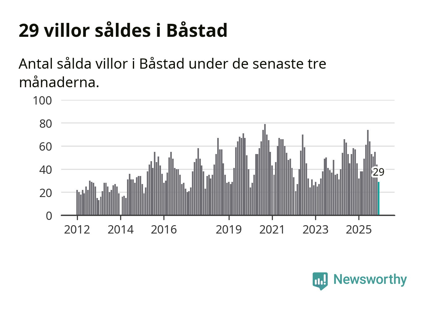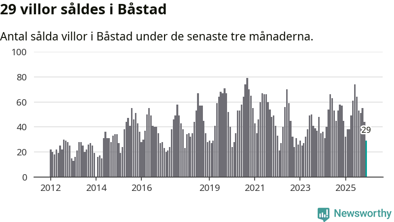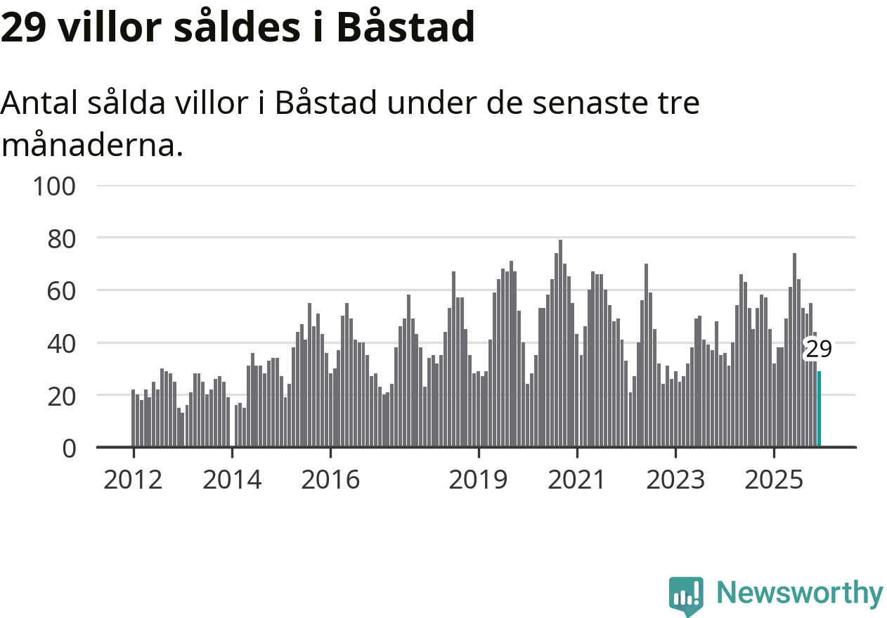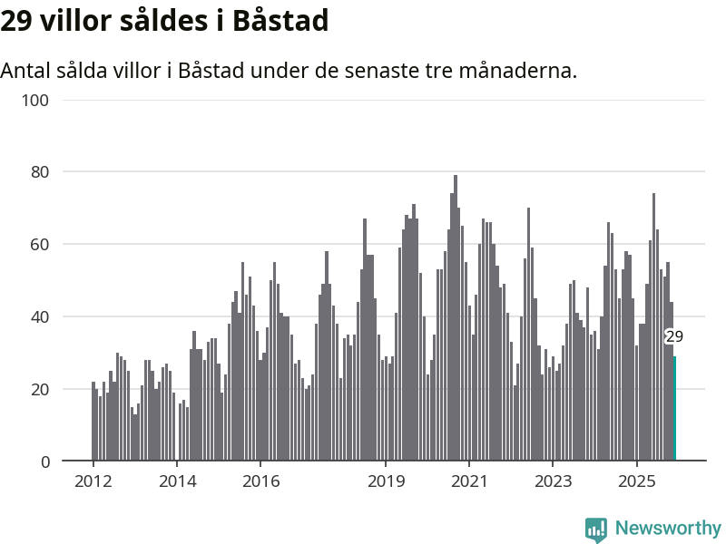Mellan oktober och december såldes 29 villor i Båstads kommun. Det är relativt få sett till aktiviteten på bostadsmarknaden i kommunen under de senaste tolv månaderna, samt det historiska snittet för den här tiden på året.