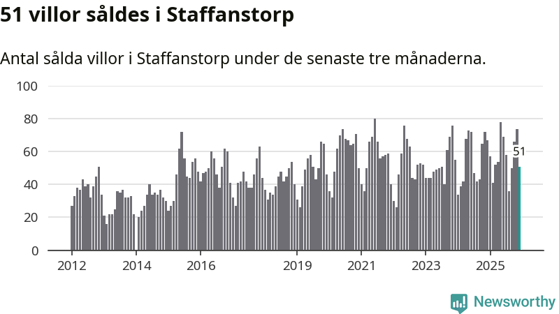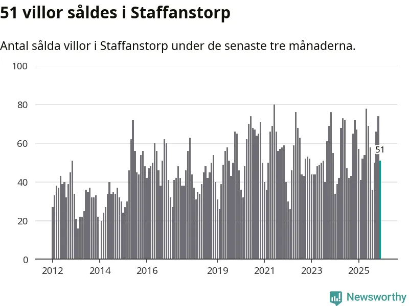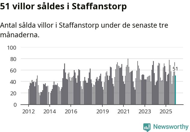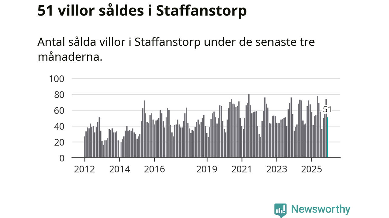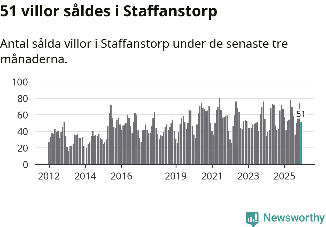 Sammanlagt såldes 51 villor i Staffanstorps kommun mellan oktober och december till ett genomsnittligt pris på 4,9 miljoner kronor. I fjol gjordes 67 affärer vid den här tiden på året.