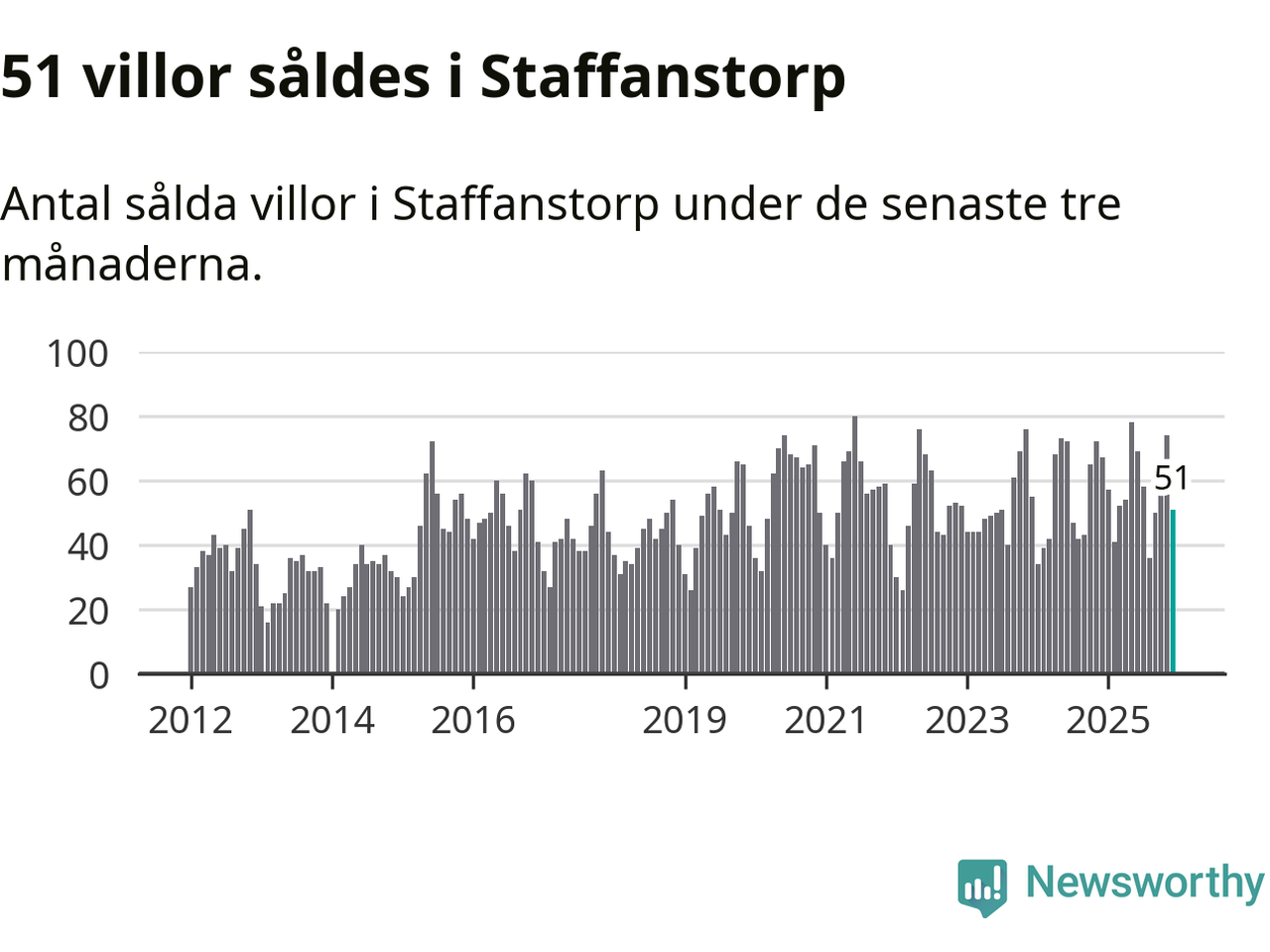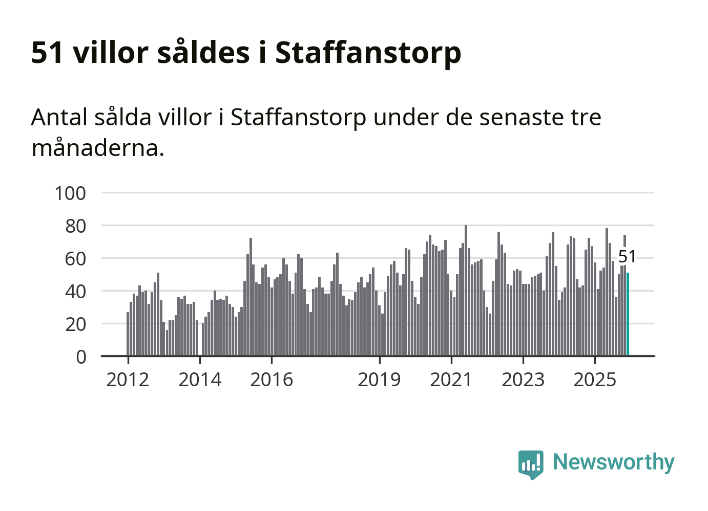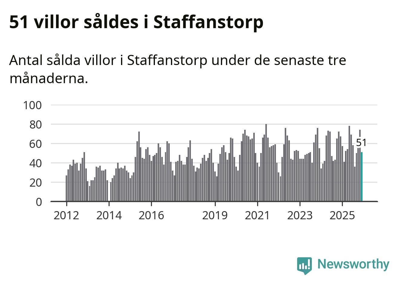 Sammanlagt såldes 51 villor i Staffanstorps kommun mellan oktober och december till ett genomsnittligt pris på 4,9 miljoner kronor. I fjol gjordes 67 affärer vid den här tiden på året.