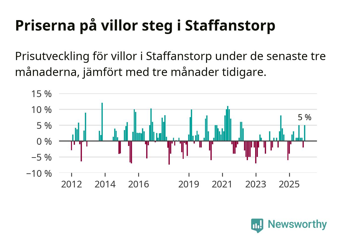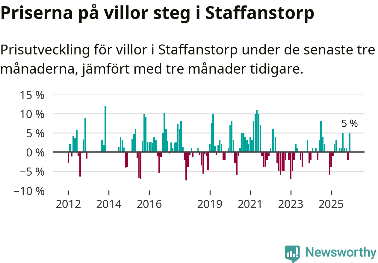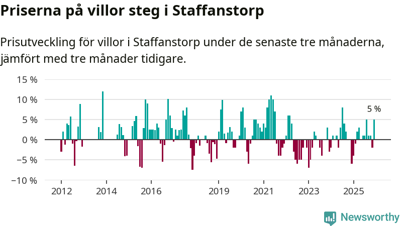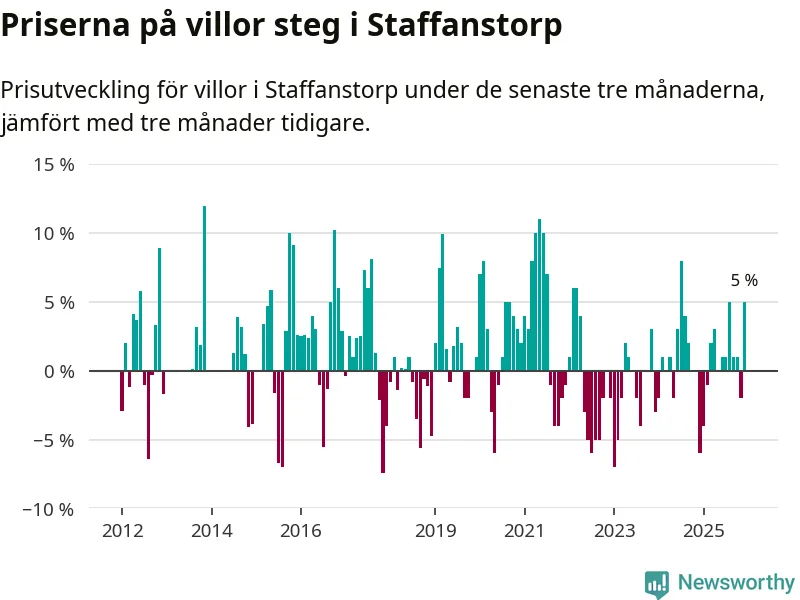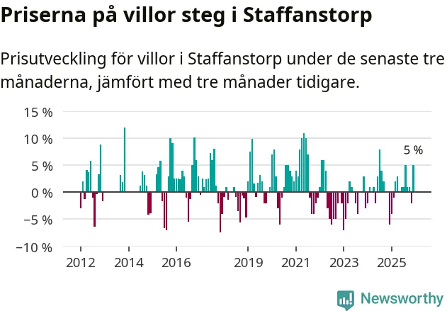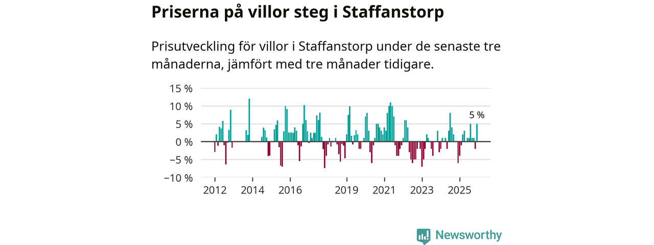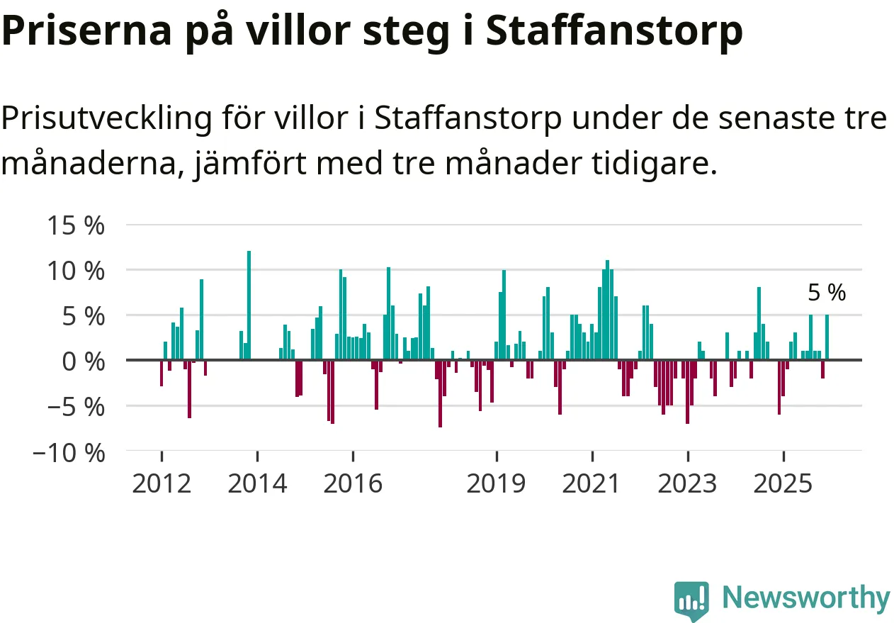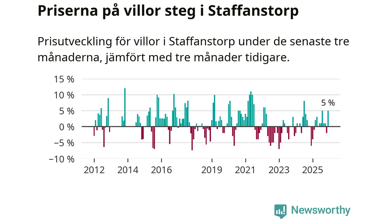 Villapriserna har gått upp i Staffanstorps kommun. Medelpriset på försäljningarna under de senaste tre månaderna visar på en uppgång med 5 procent.