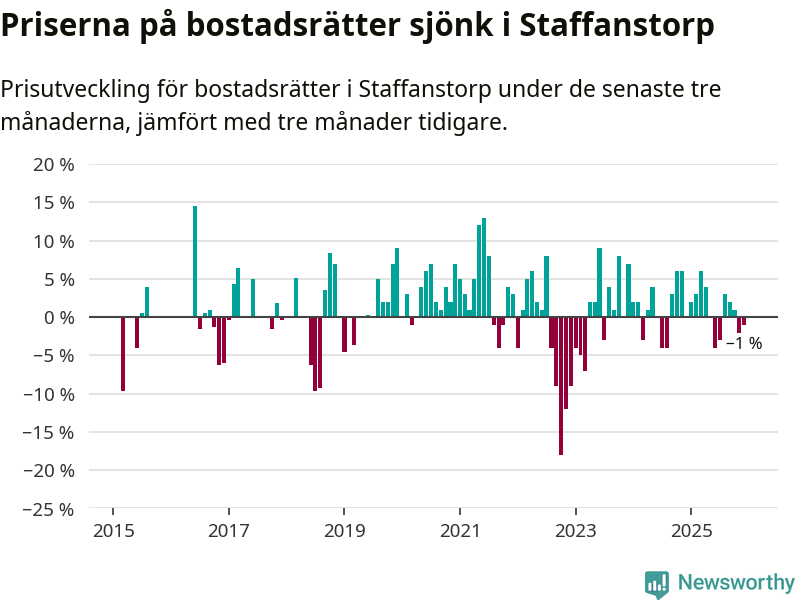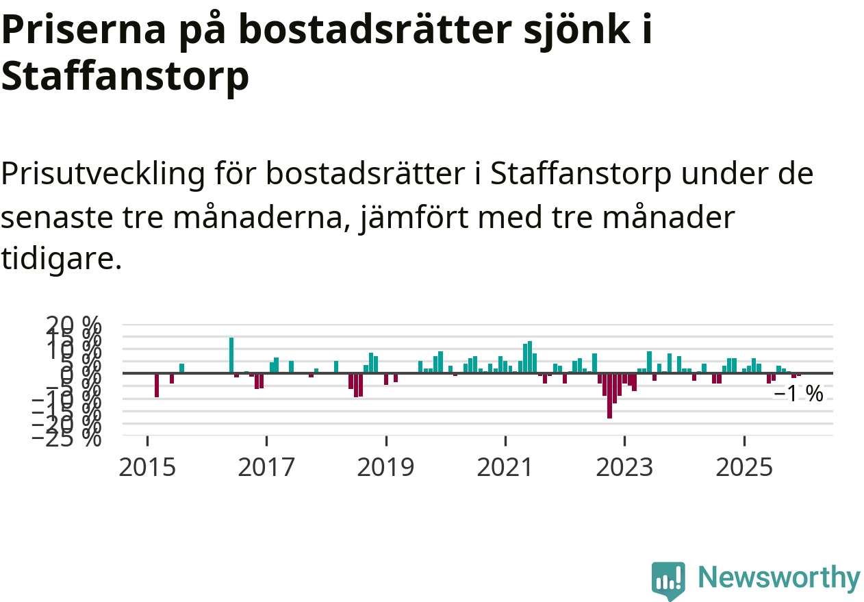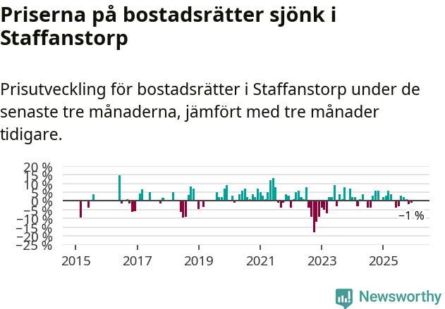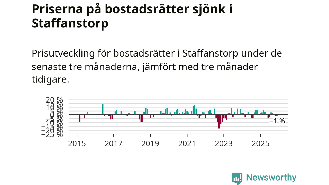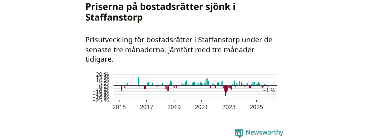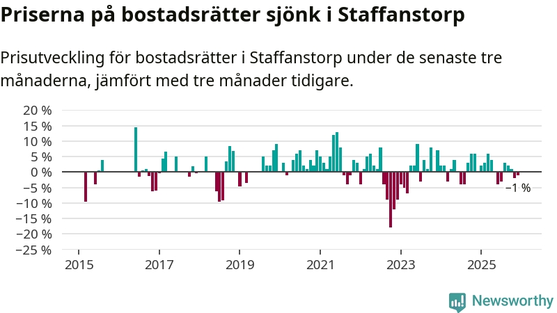 Priserna på bostadsrätter har gått ner i Staffanstorps kommun. Medelpriset på försäljningarna under de senaste tre månaderna visar på en nedgång med 1 procent.