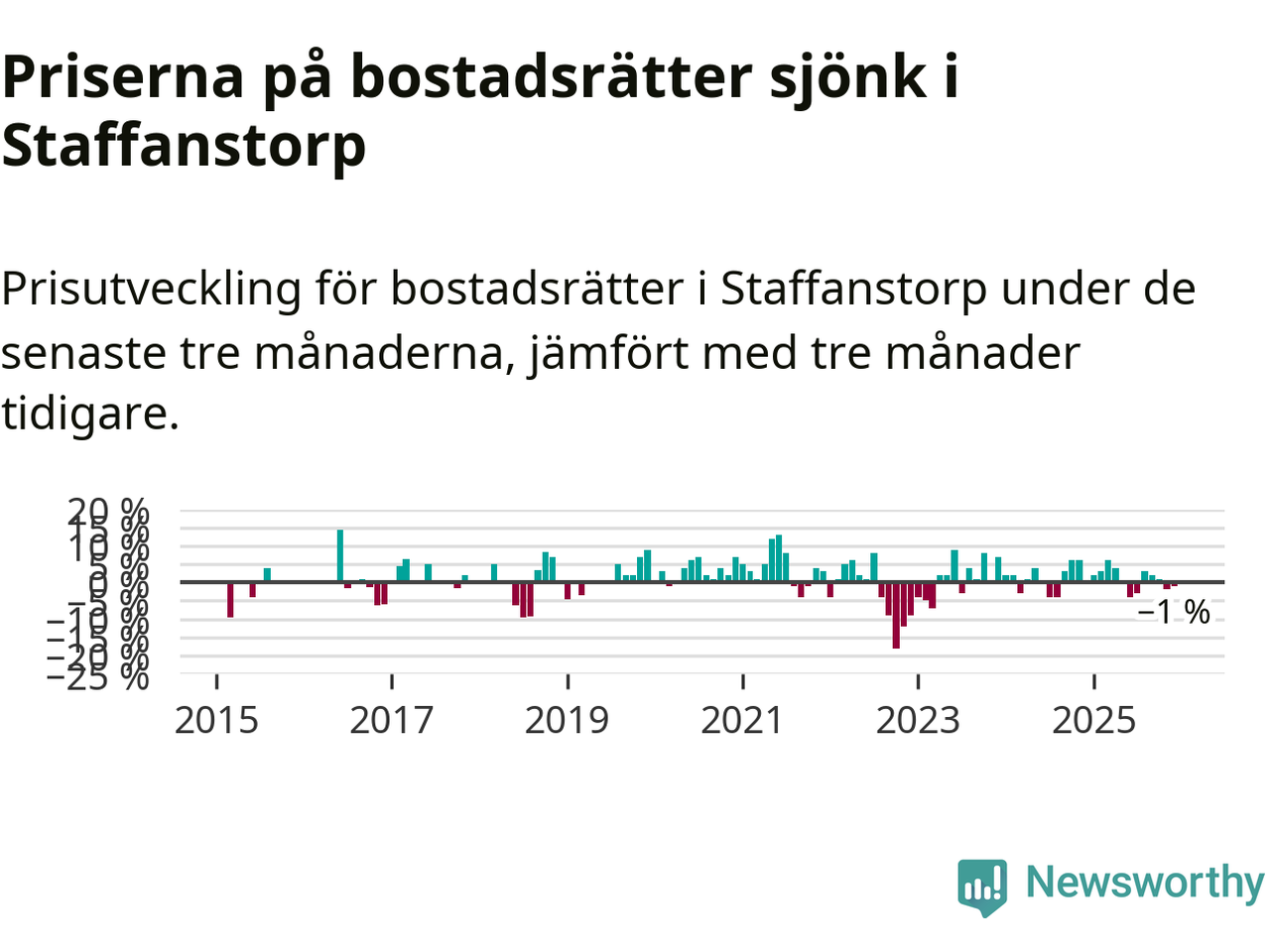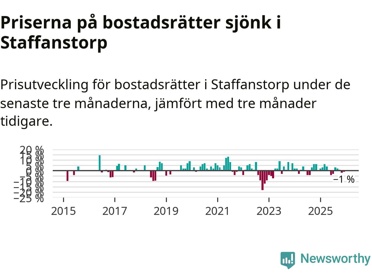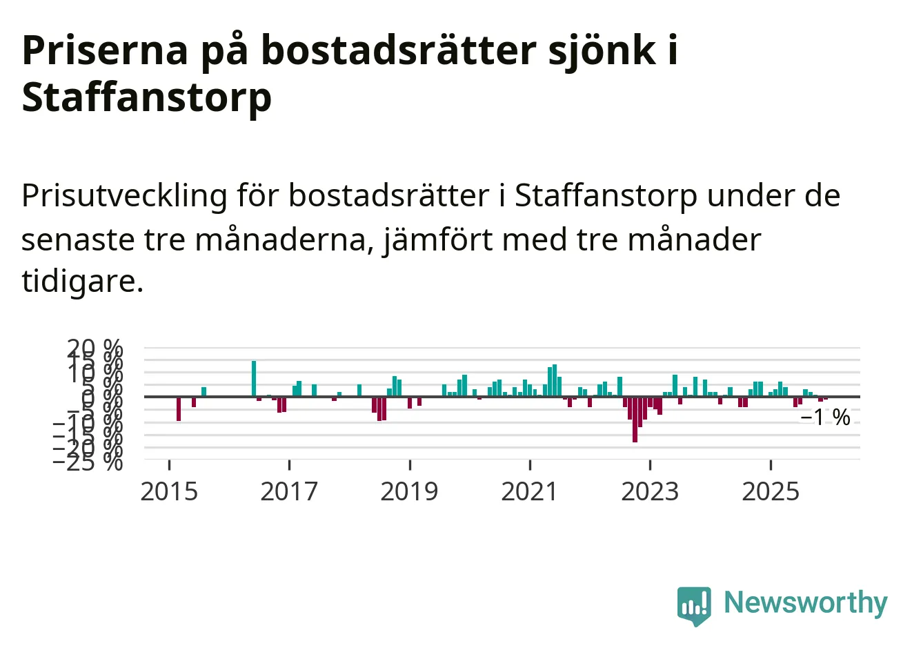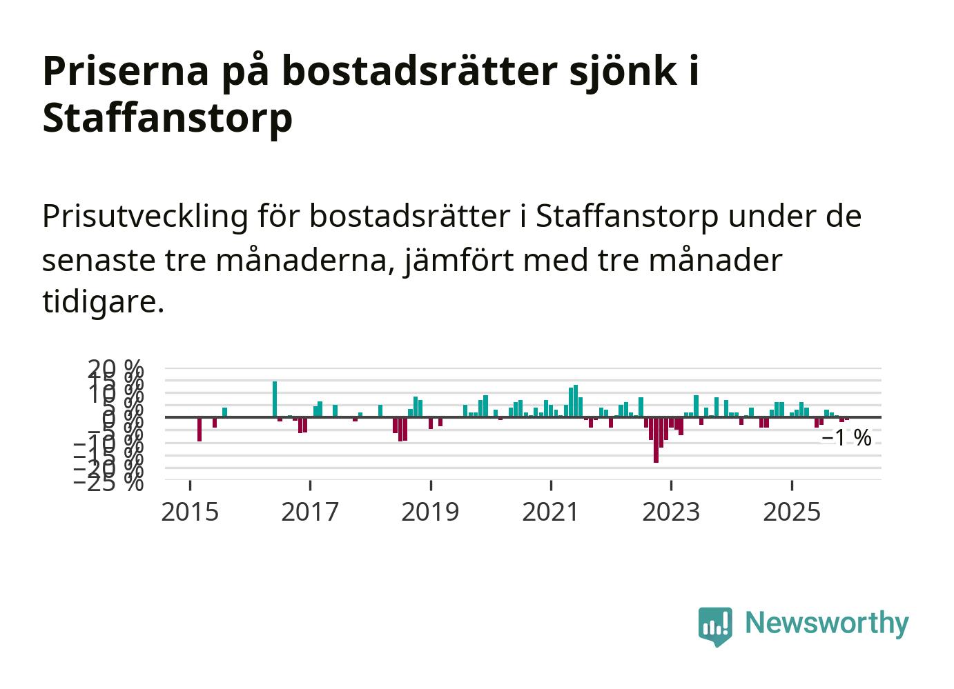 Priserna på bostadsrätter har gått ner i Staffanstorps kommun. Medelpriset på försäljningarna under de senaste tre månaderna visar på en nedgång med 1 procent.