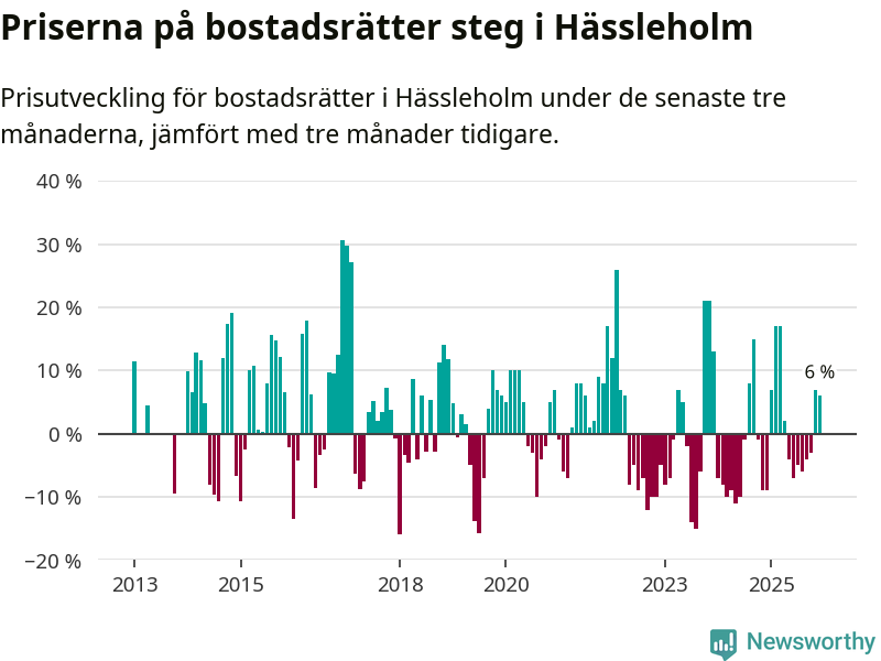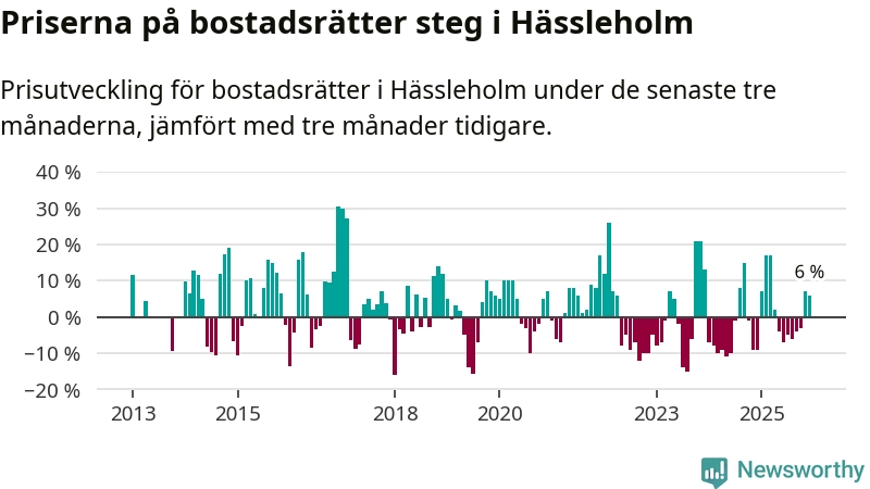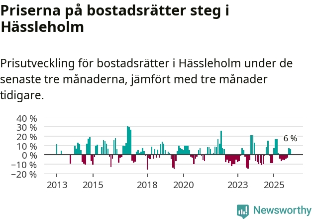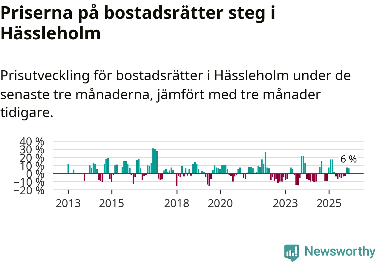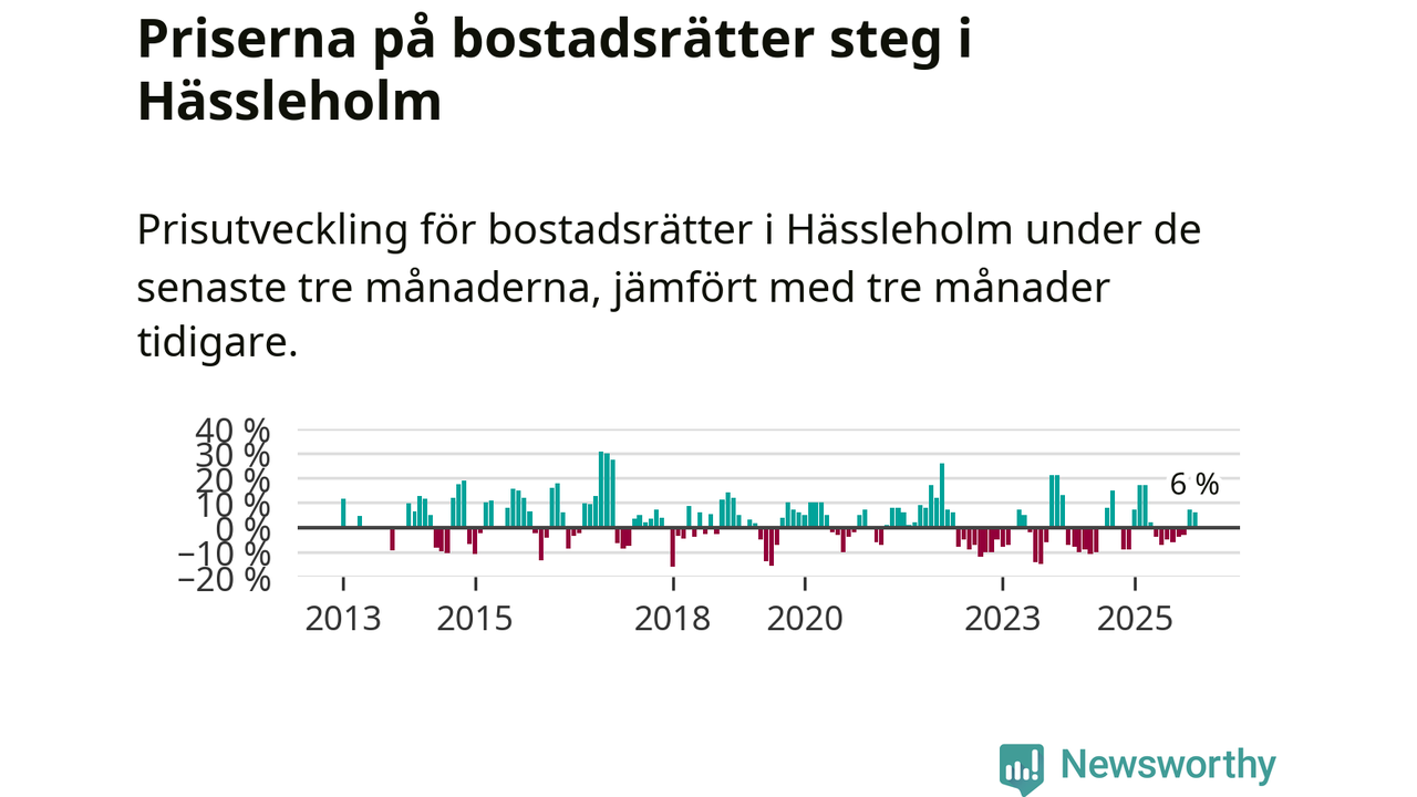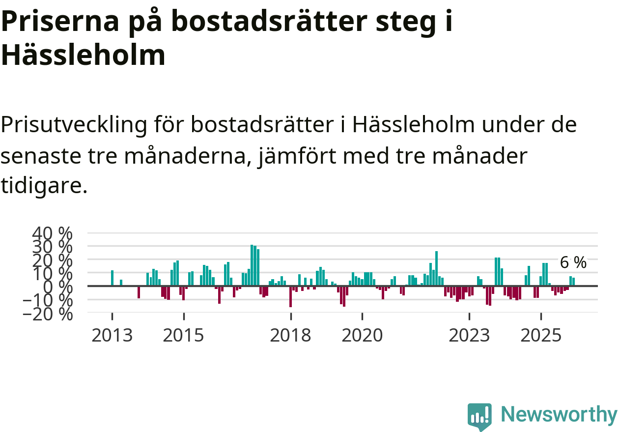 Statistiken visar även på en kännbar prisuppgång i Hässleholms kommun. Medelpriset på försäljningarna av bostadsrätter i kommunen var 6 procent högre än för tre månader sedan. I hela Skåne däremot sjunker priserna på bostadsrätter. I hela länet noterades en prisnedgång på 2 procent.