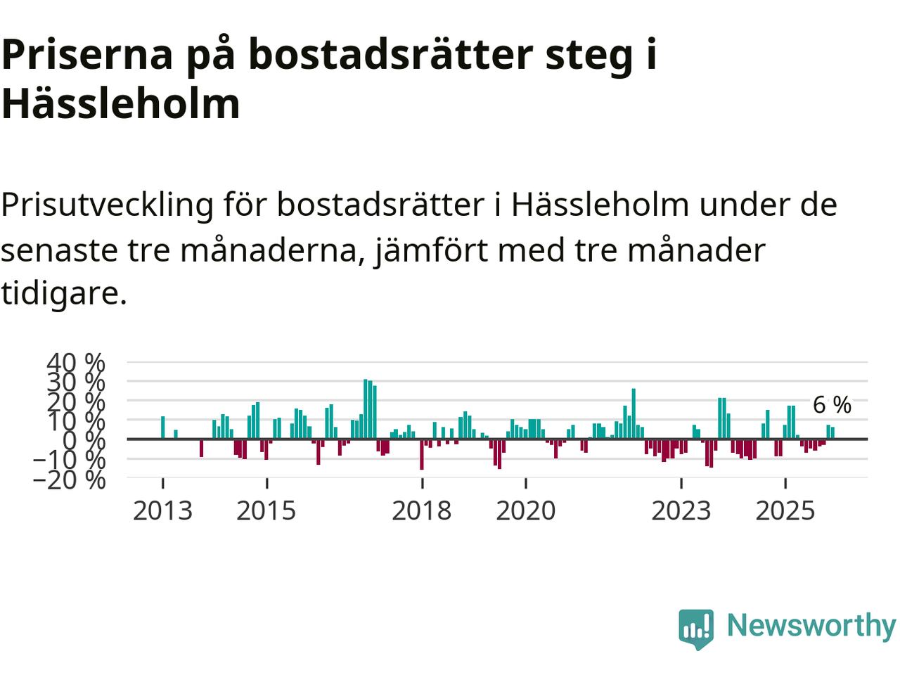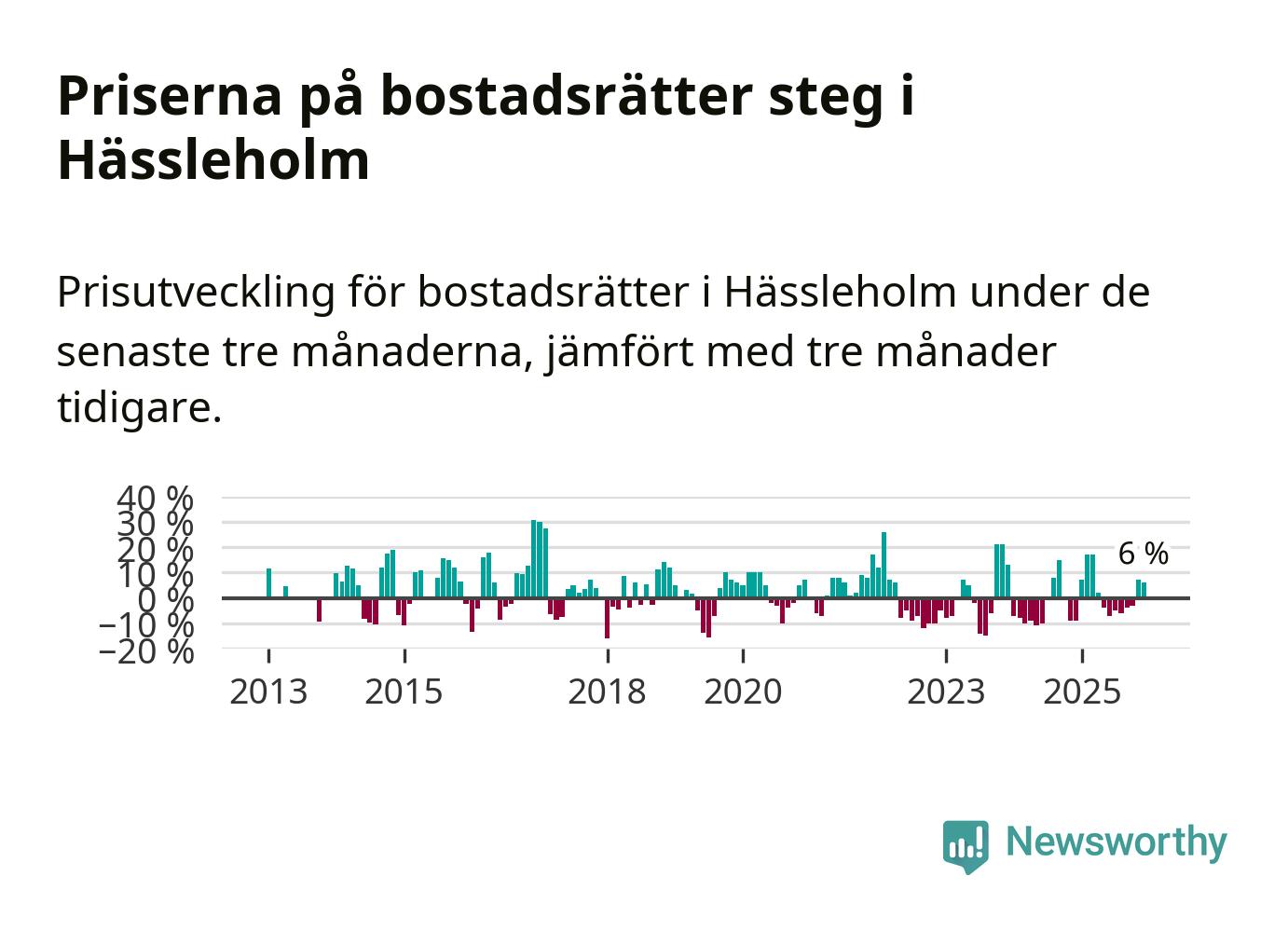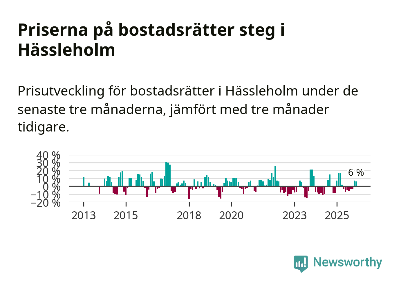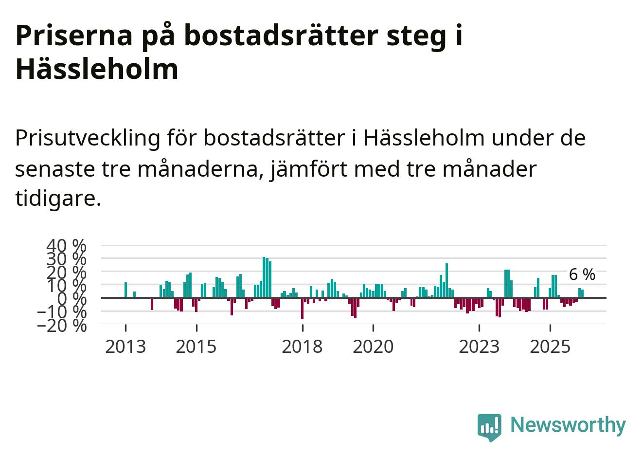 Statistiken visar även på en kännbar prisuppgång i Hässleholms kommun. Medelpriset på försäljningarna av bostadsrätter i kommunen var 6 procent högre än för tre månader sedan. I hela Skåne däremot sjunker priserna på bostadsrätter. I hela länet noterades en prisnedgång på 2 procent.