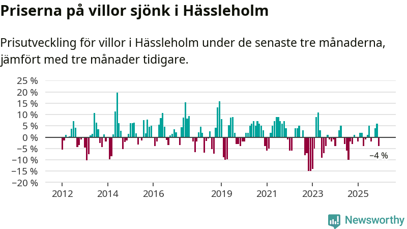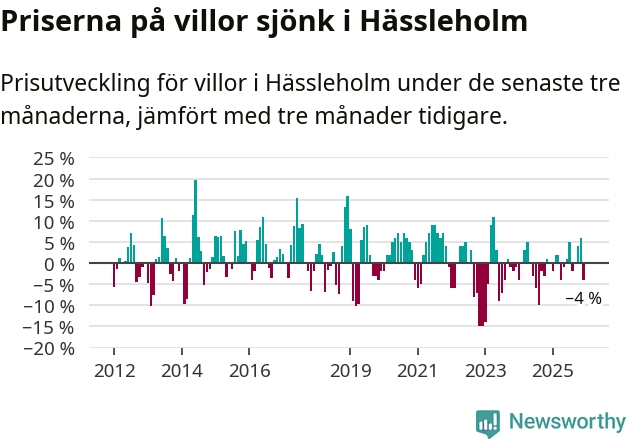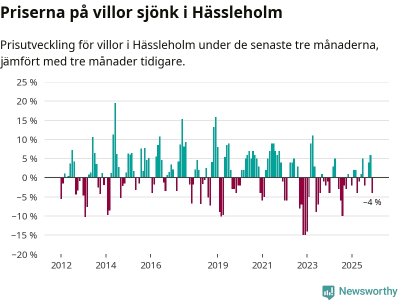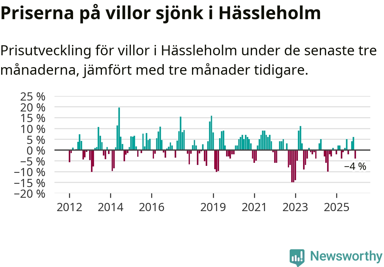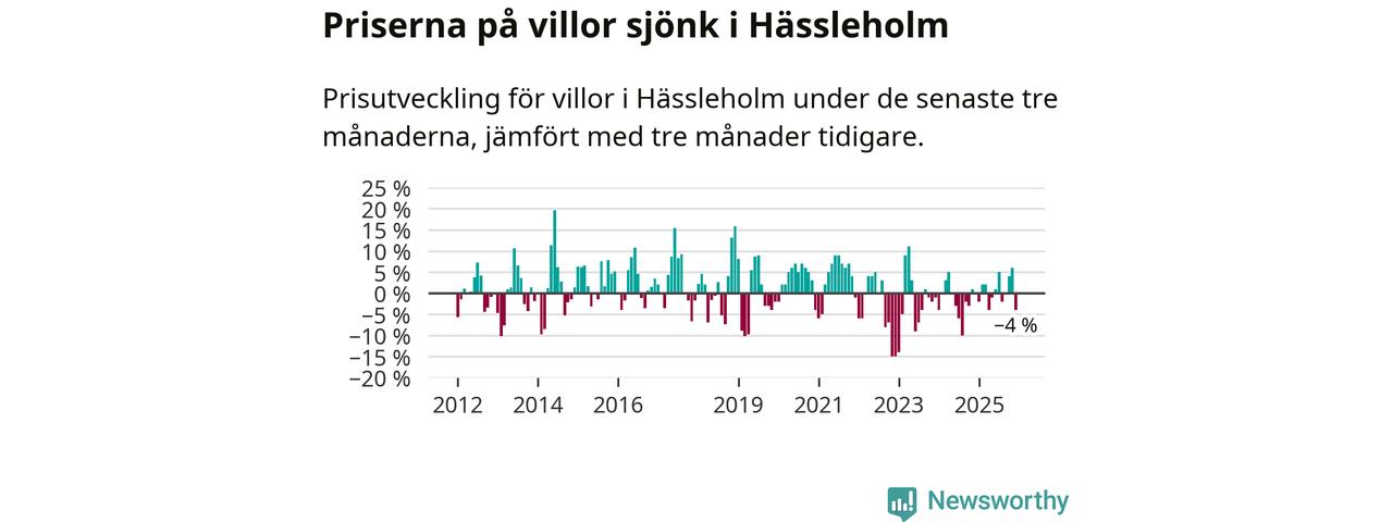 Villapriserna har gått ner i Hässleholms kommun. Medelpriset på försäljningarna under de senaste tre månaderna visar på en nedgång med 4 procent.