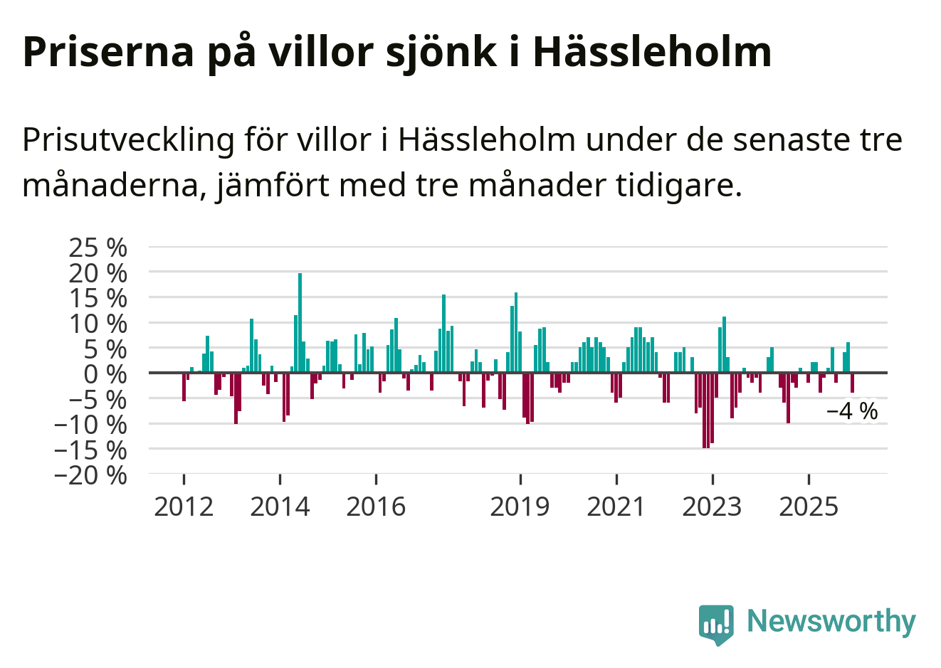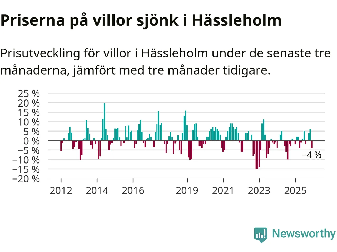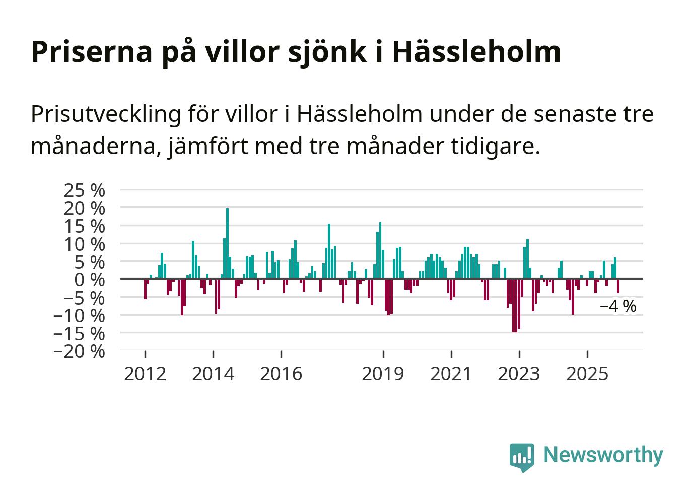 Villapriserna har gått ner i Hässleholms kommun. Medelpriset på försäljningarna under de senaste tre månaderna visar på en nedgång med 4 procent.