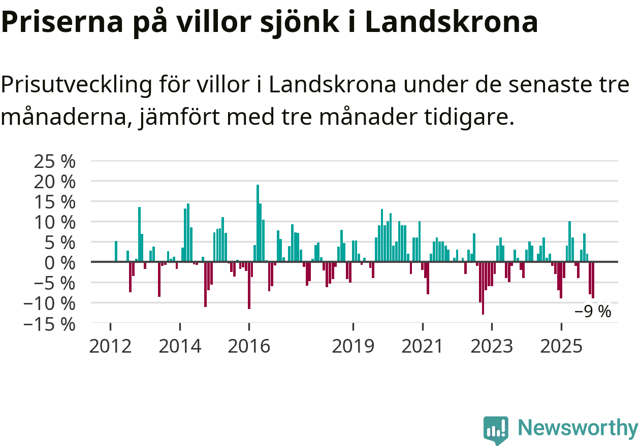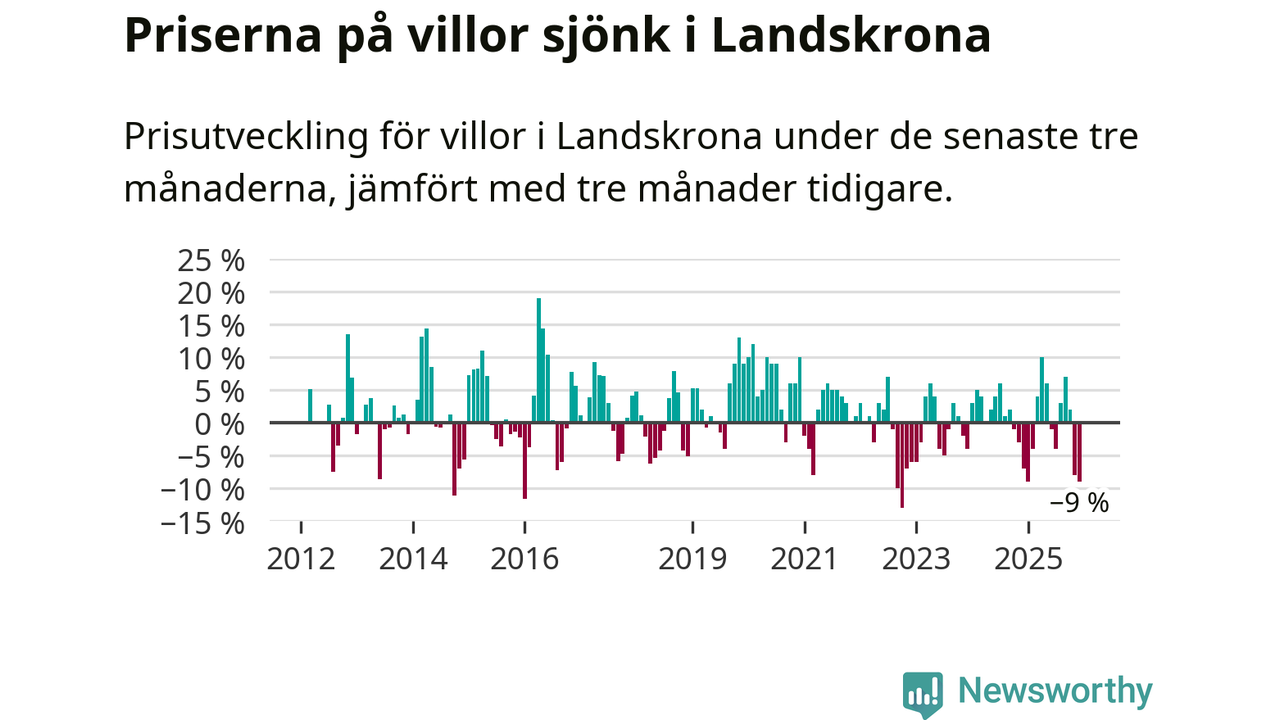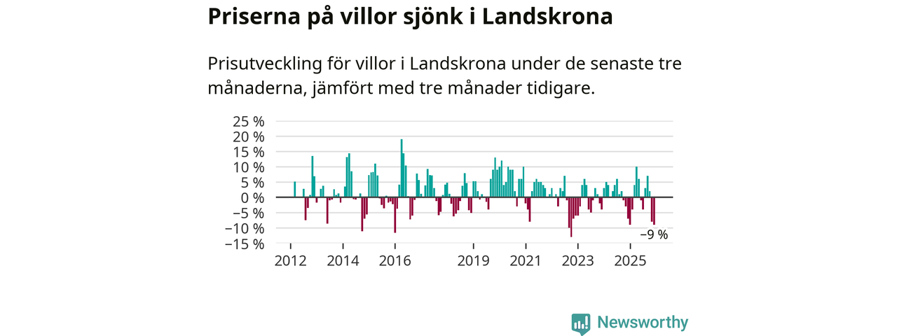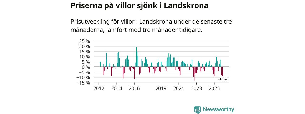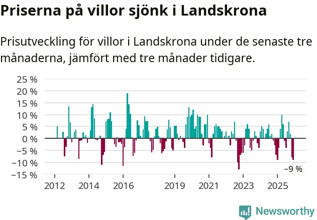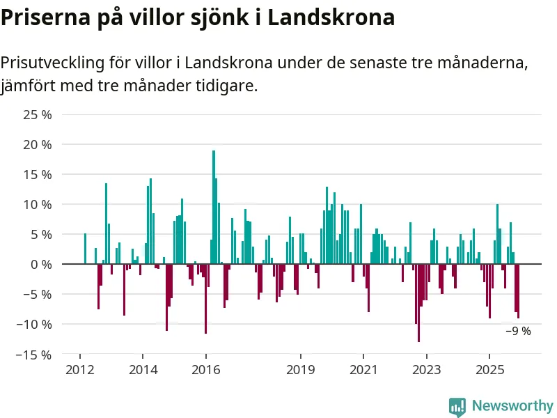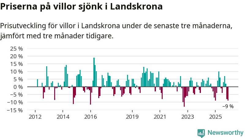 Villapriserna sjönk mellan oktober och december med 9 procent i Landskrona kommun. Det är en betydande nedgång jämfört med det gångna året då priserna i snitt stått stilla.