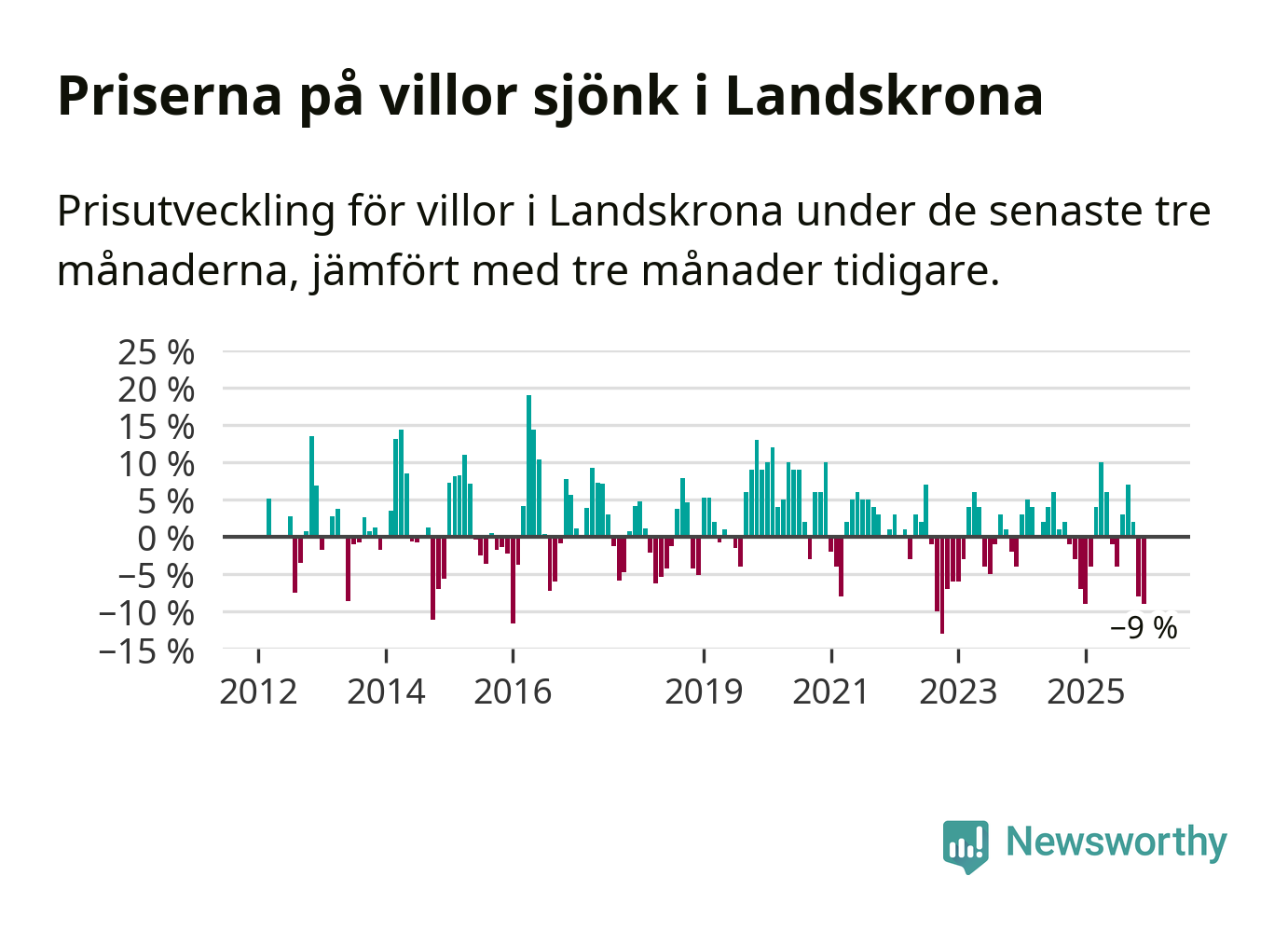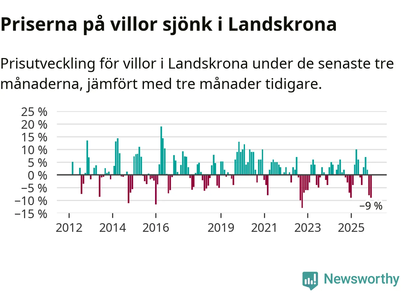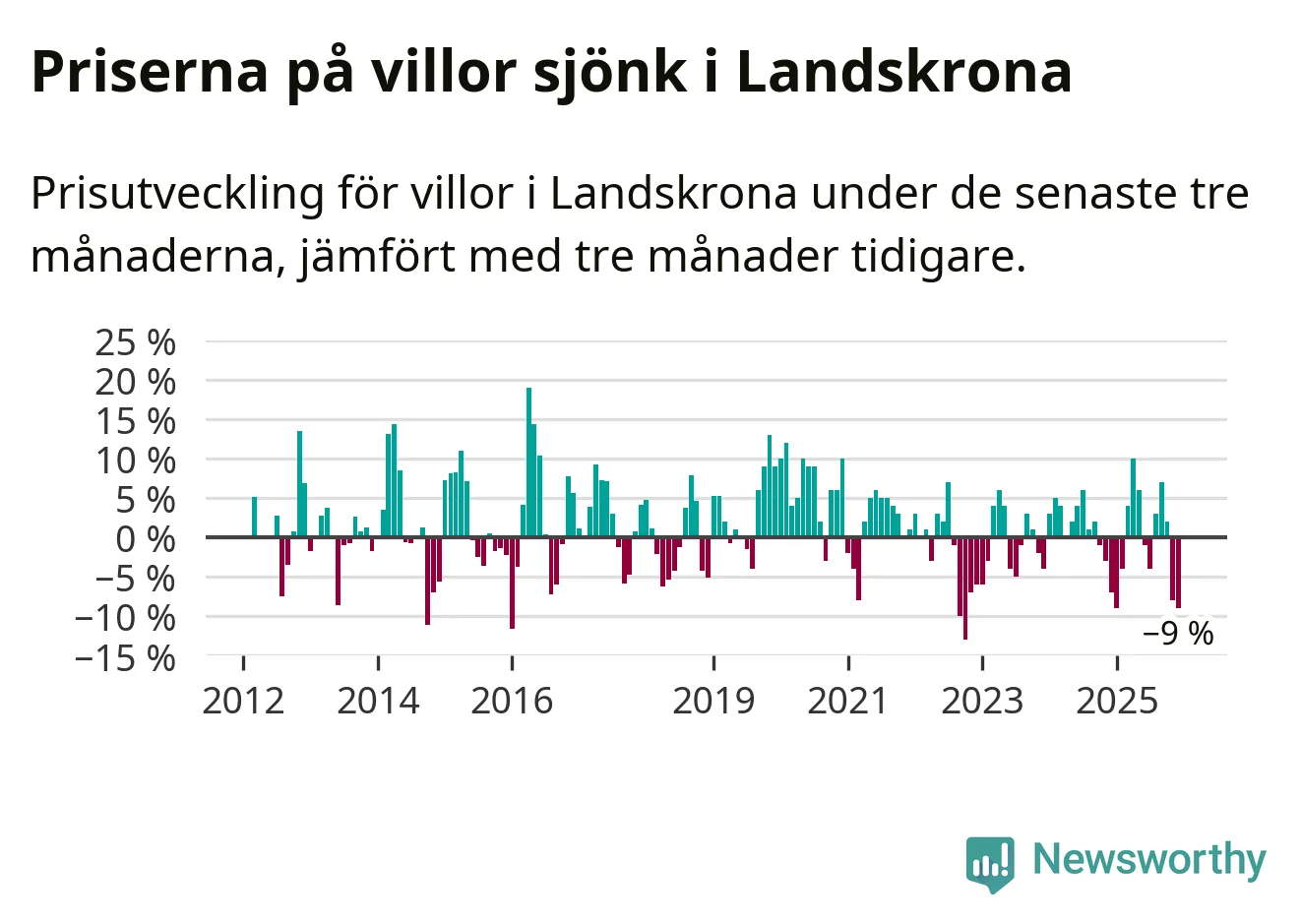 Villapriserna sjönk mellan oktober och december med 9 procent i Landskrona kommun. Det är en betydande nedgång jämfört med det gångna året då priserna i snitt stått stilla.