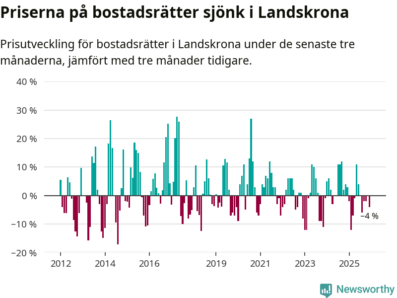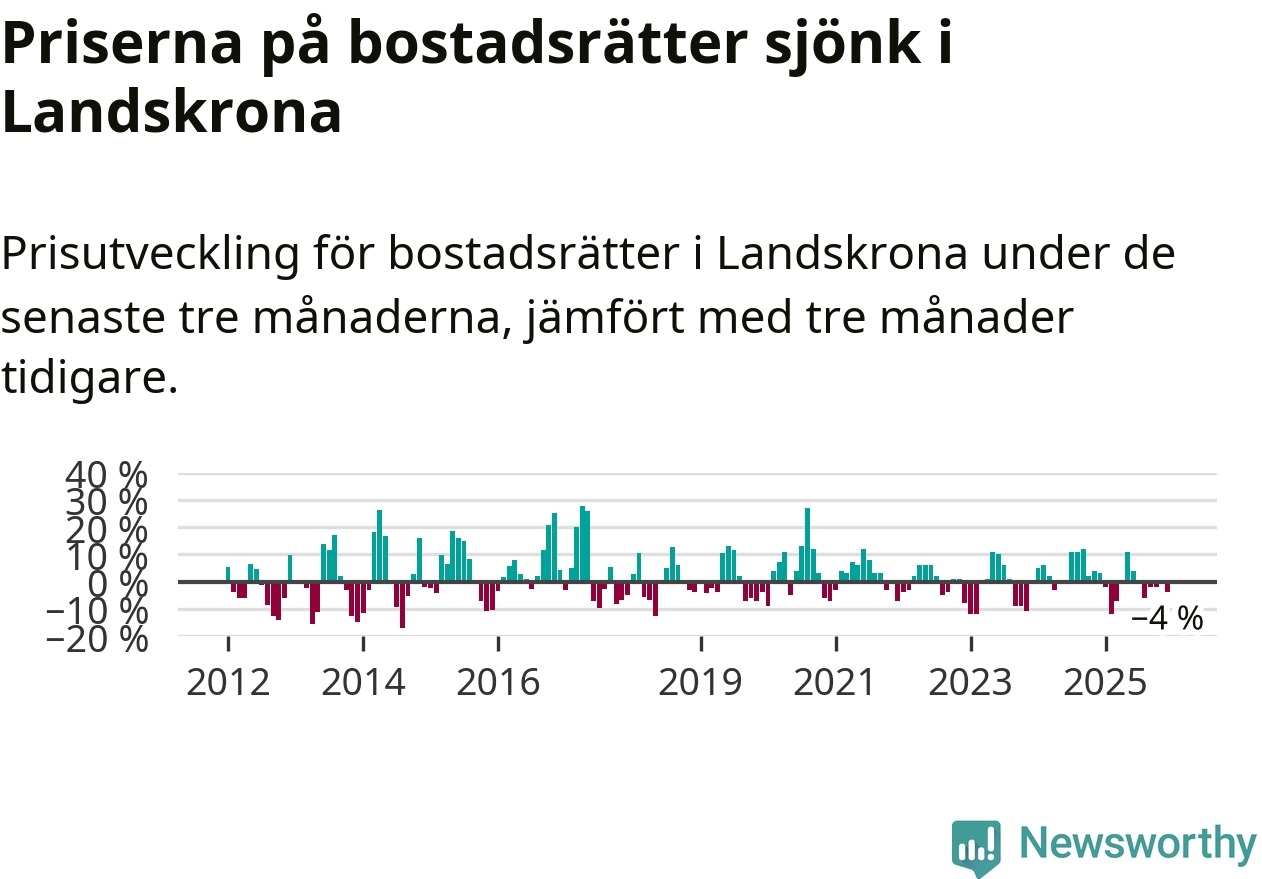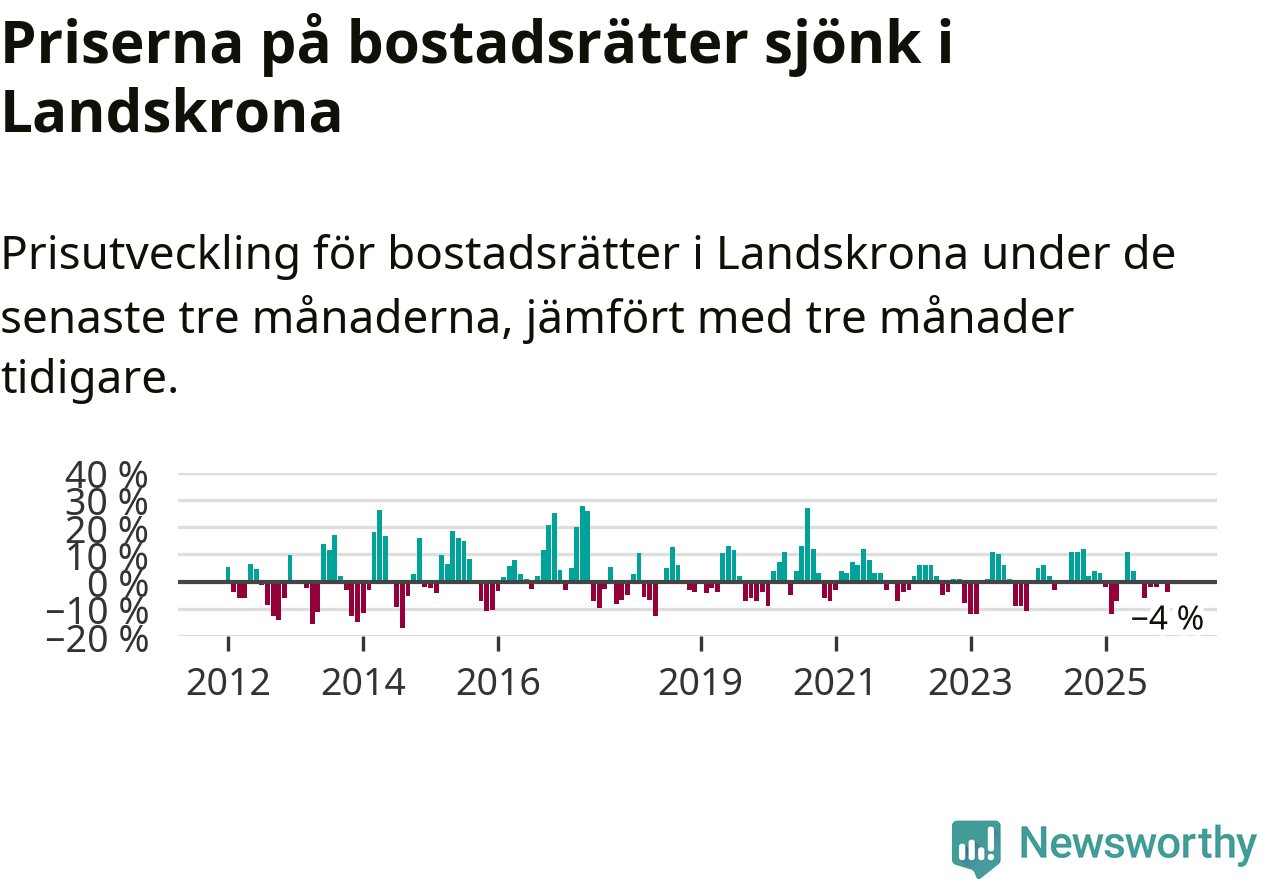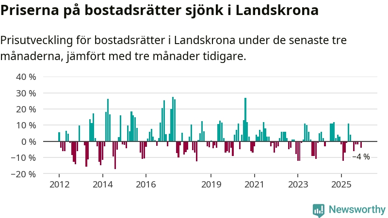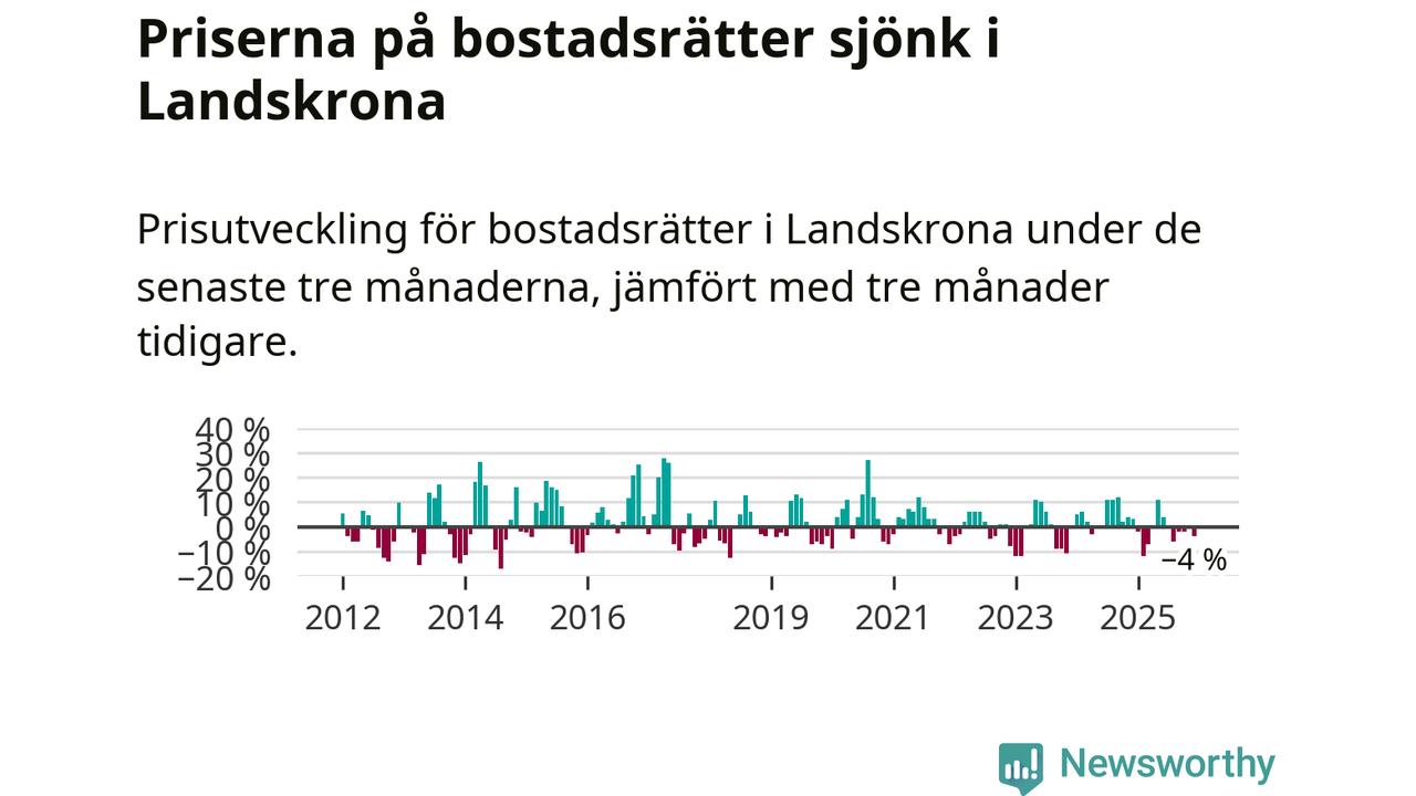 Priserna på bostadsrätter har gått ner i Landskrona kommun. Medelpriset på försäljningarna under de senaste tre månaderna visar på en nedgång med 4 procent.