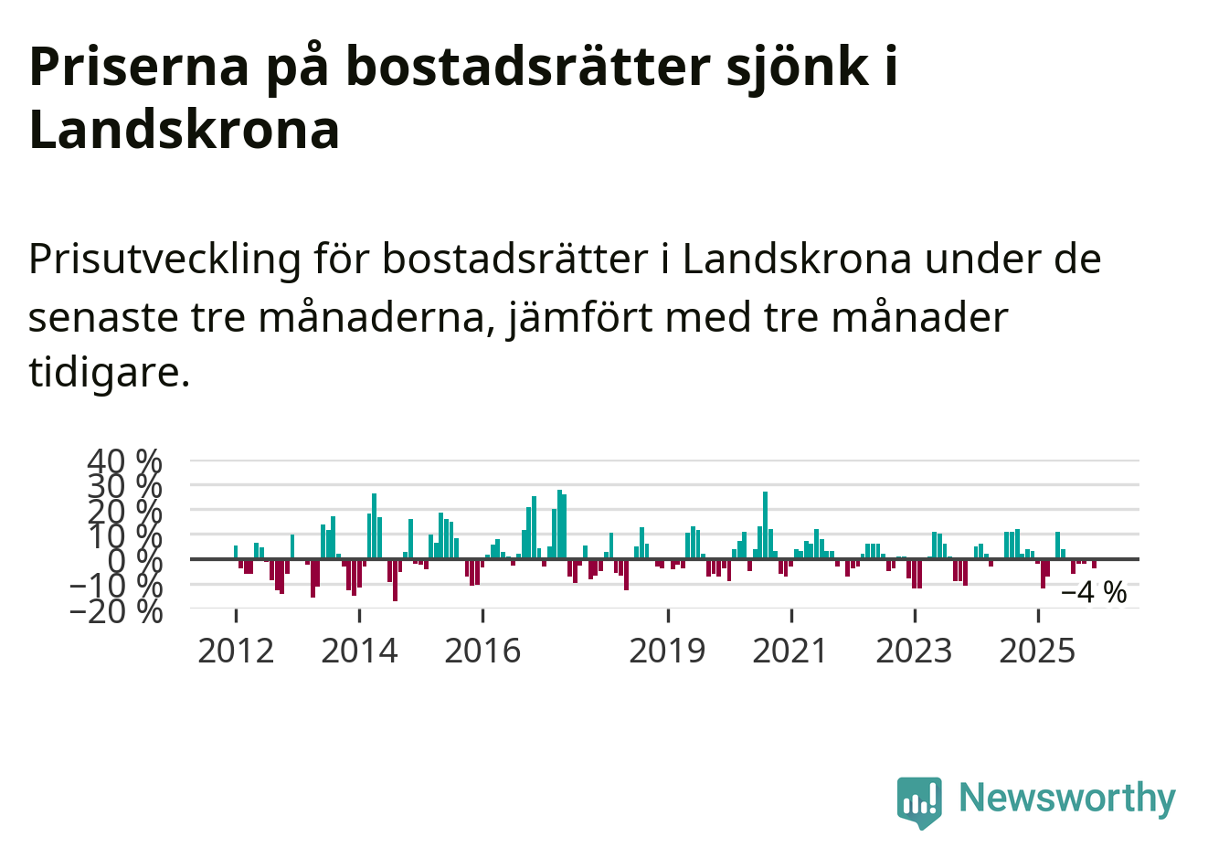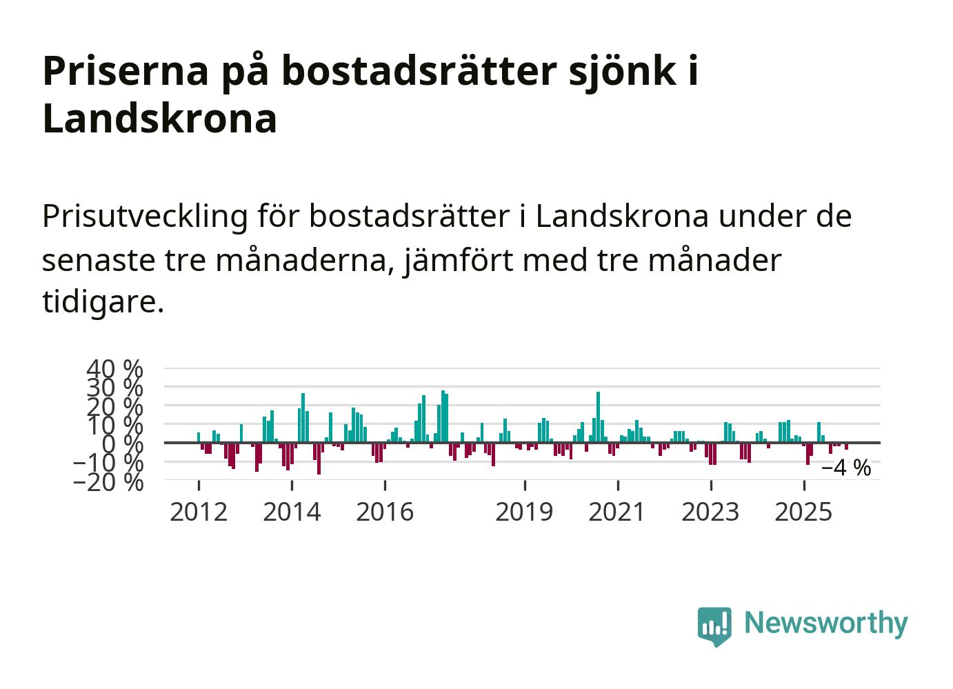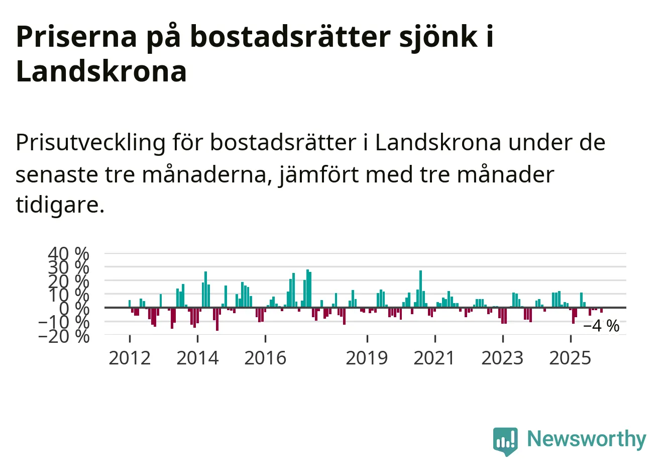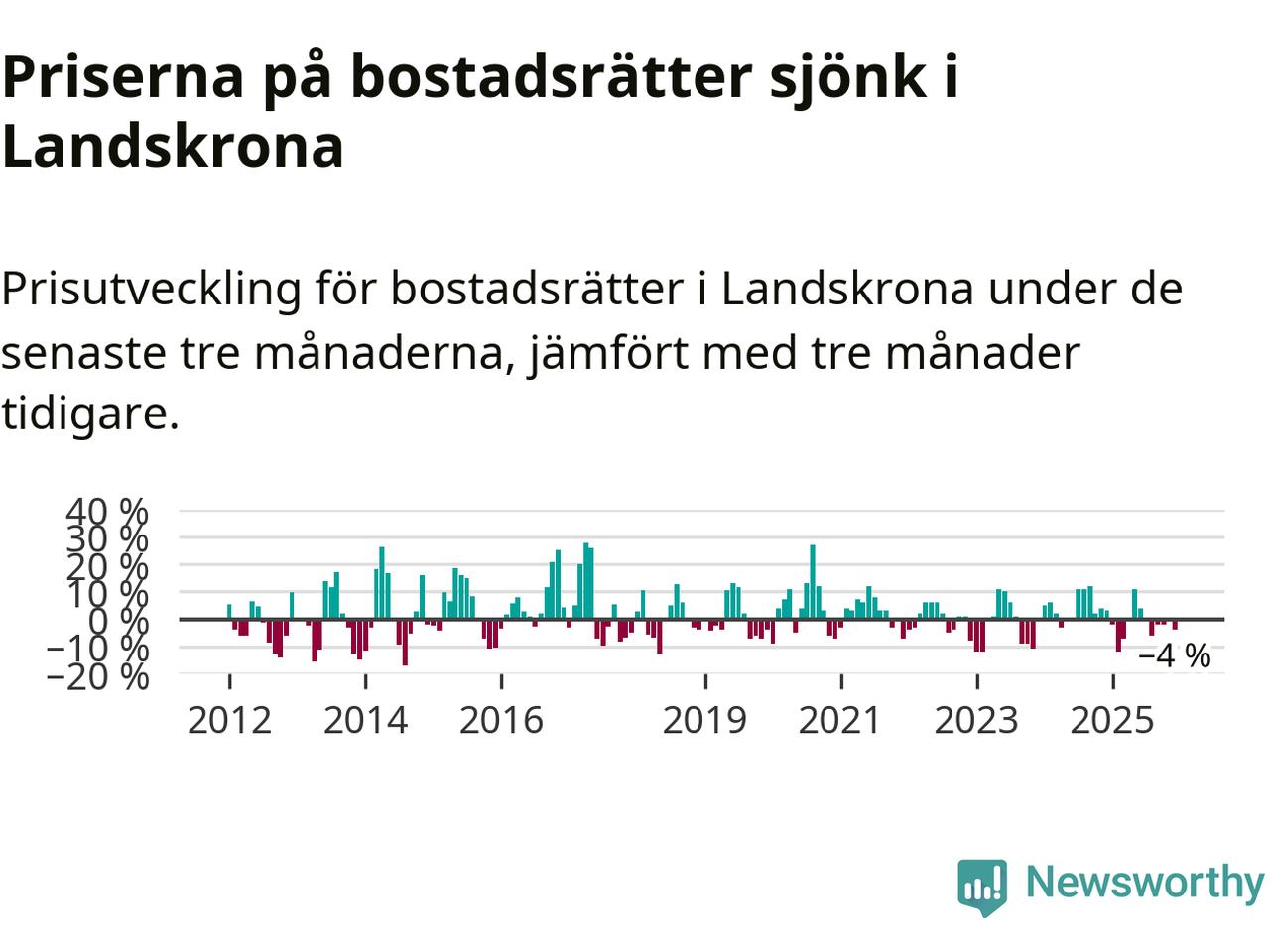 Priserna på bostadsrätter har gått ner i Landskrona kommun. Medelpriset på försäljningarna under de senaste tre månaderna visar på en nedgång med 4 procent.