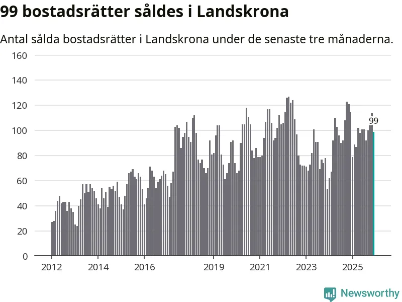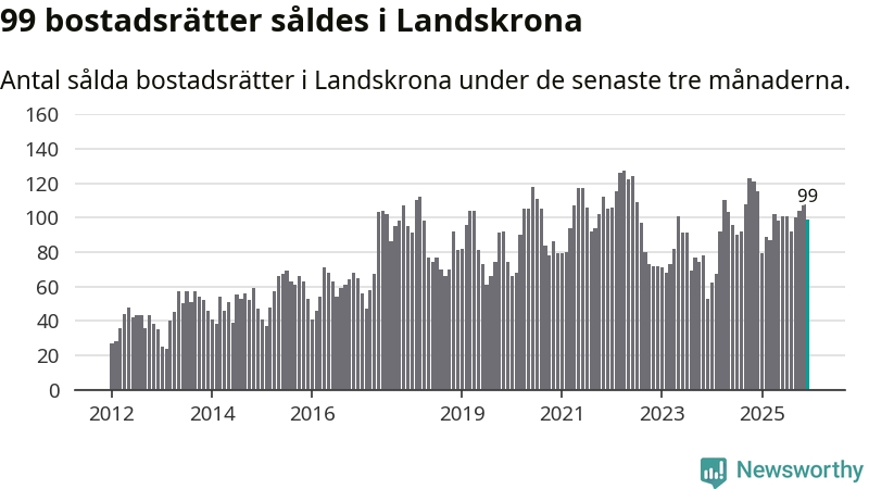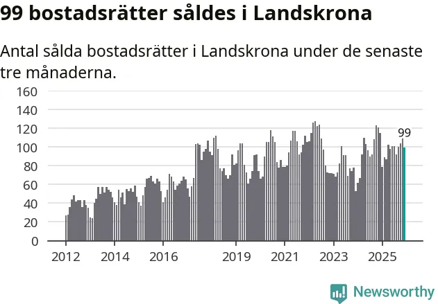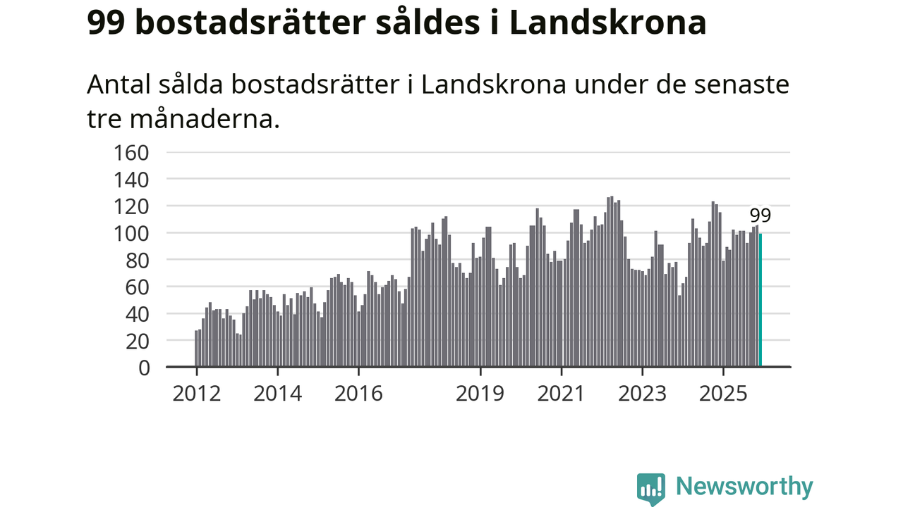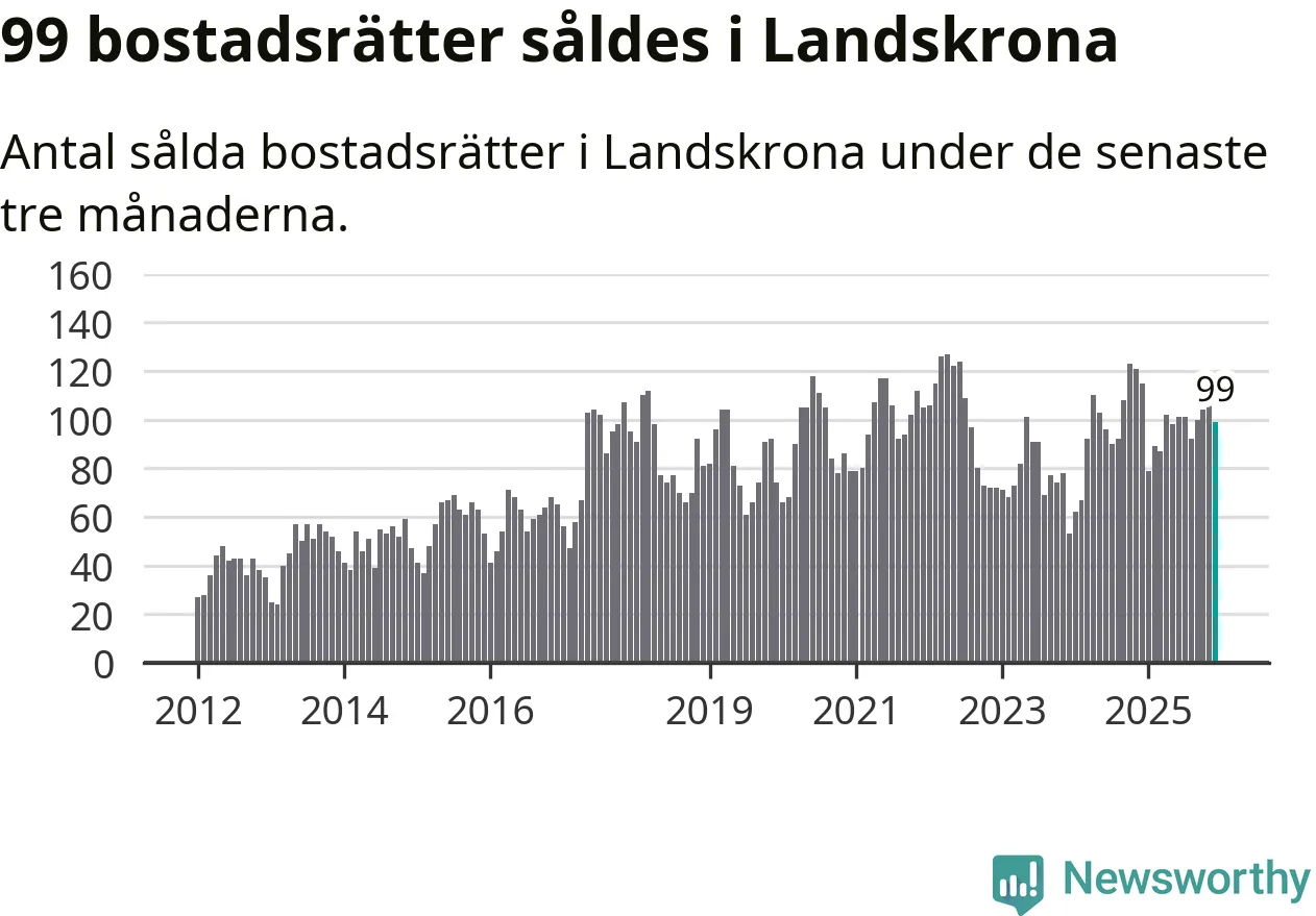 Sammanlagt såldes 99 bostadsrätter i Landskrona kommun mellan oktober och december till ett genomsnittligt pris på 2,0 miljoner kronor. I fjol gjordes 115 affärer vid den här tiden på året.