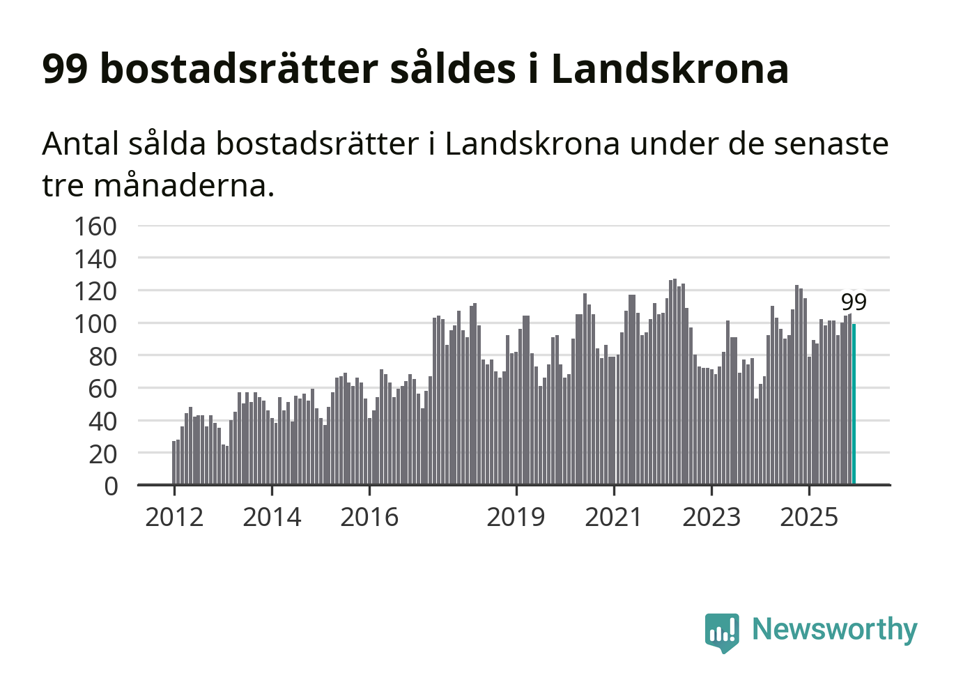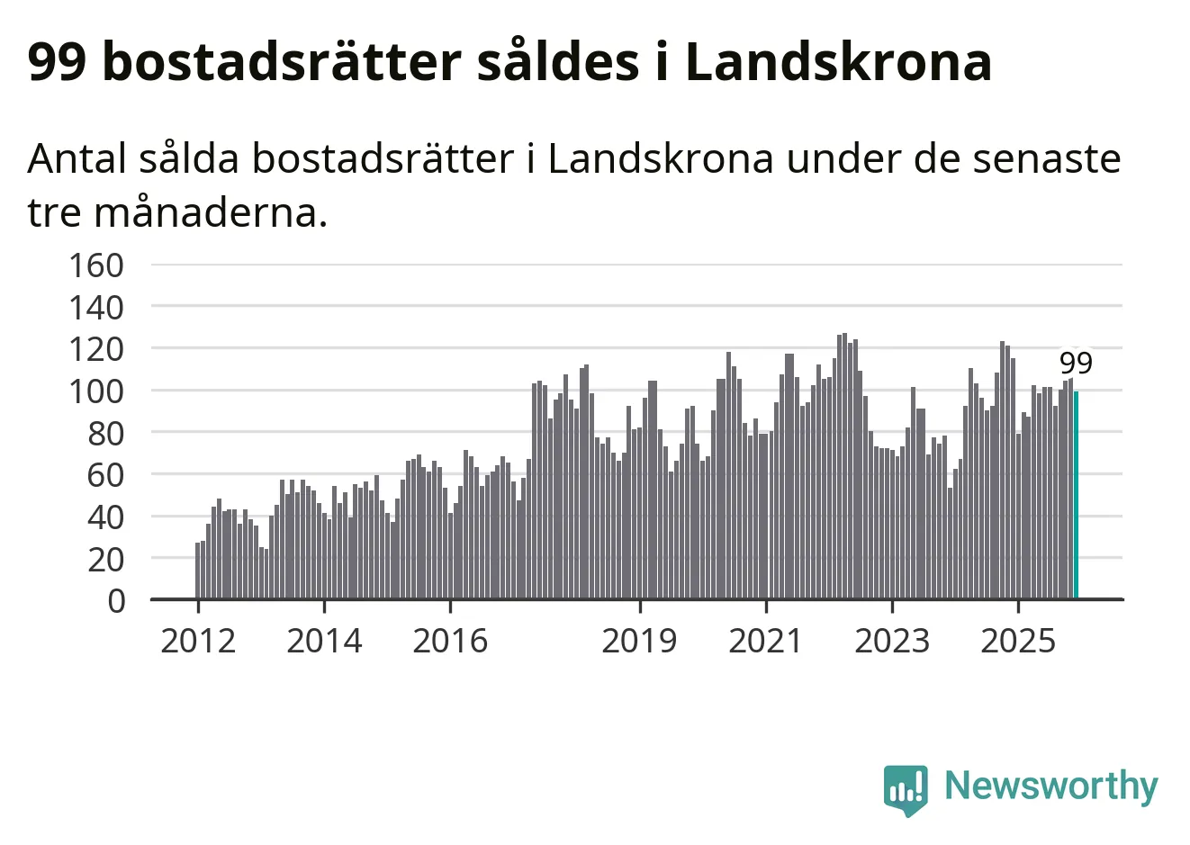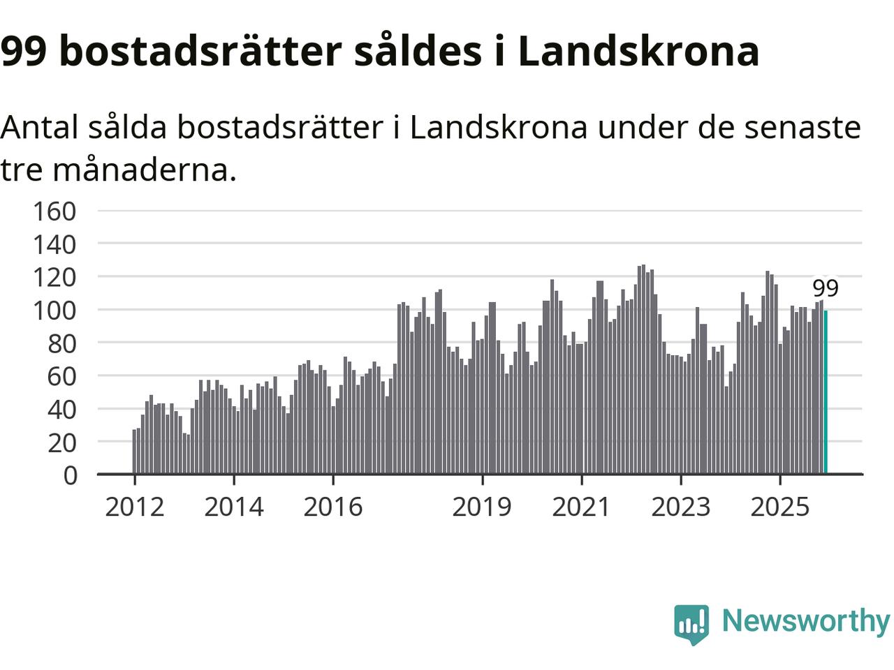 Sammanlagt såldes 99 bostadsrätter i Landskrona kommun mellan oktober och december till ett genomsnittligt pris på 2,0 miljoner kronor. I fjol gjordes 115 affärer vid den här tiden på året.