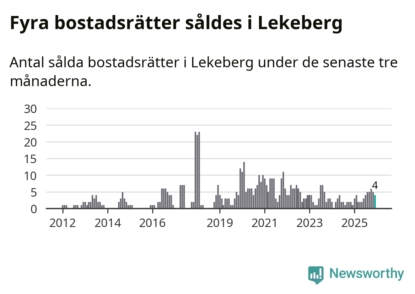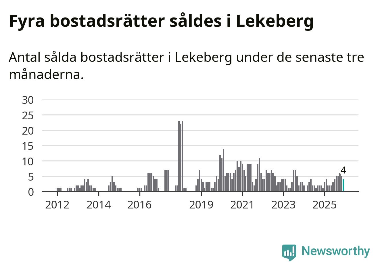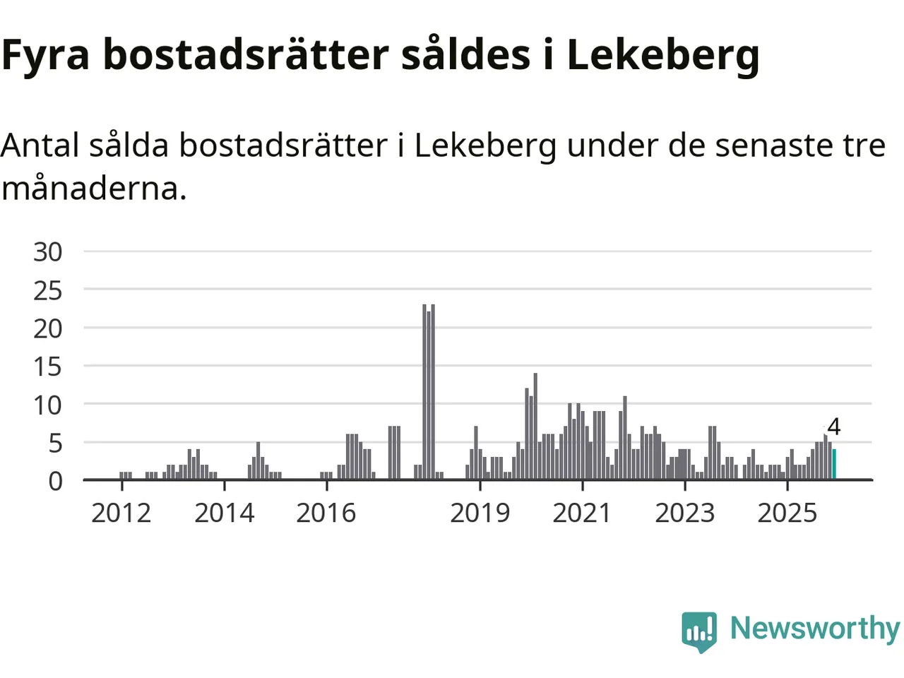 Mellan oktober och december gjordes sammanlagt fyra affärer med bostadsrätter i Lekebergs kommun. Det kan jämföras med ett vid motsvarande tid i fjol.