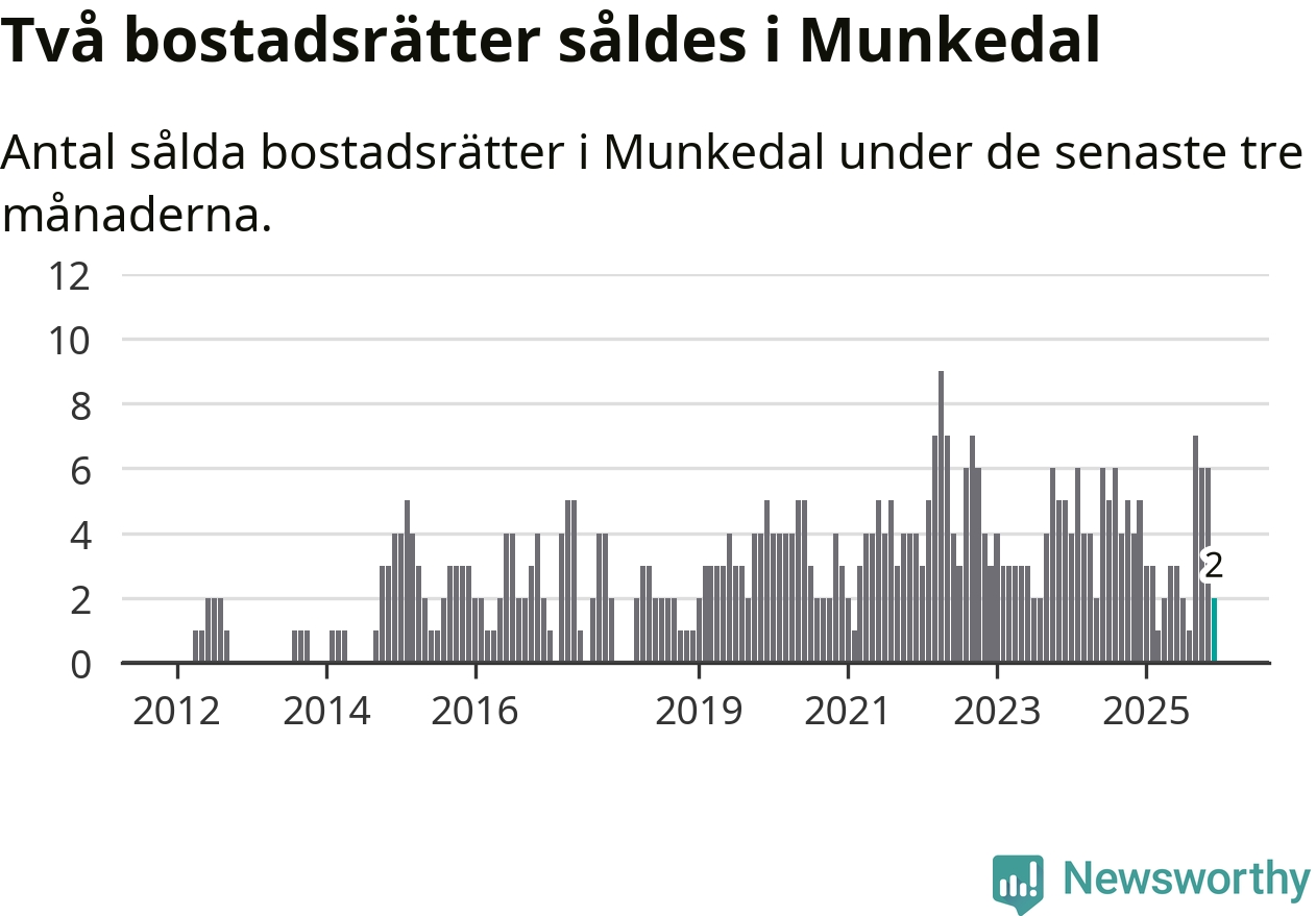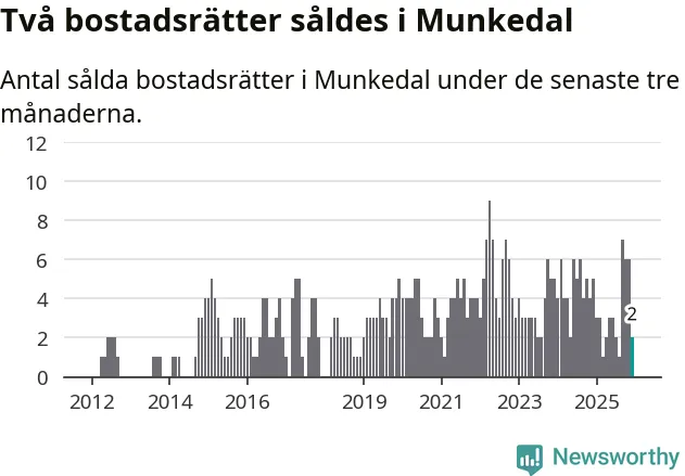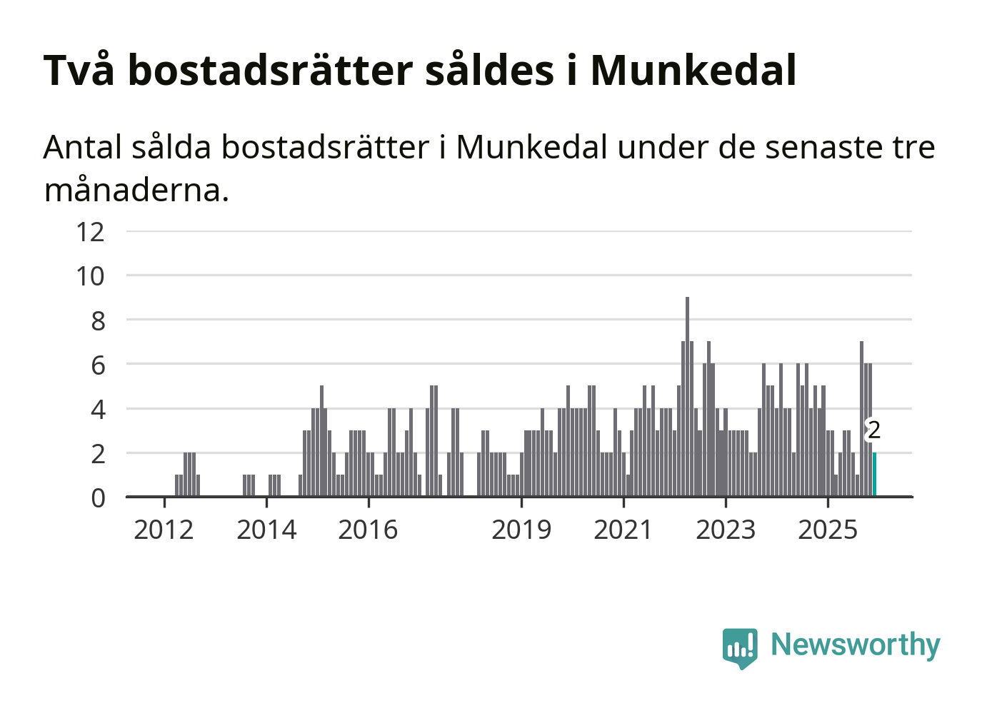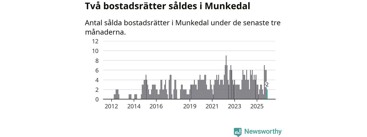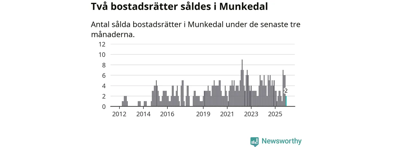 Mellan oktober och december gjordes sammanlagt två affärer med bostadsrätter i Munkedals kommun. Det kan jämföras med fem vid motsvarande tid i fjol.